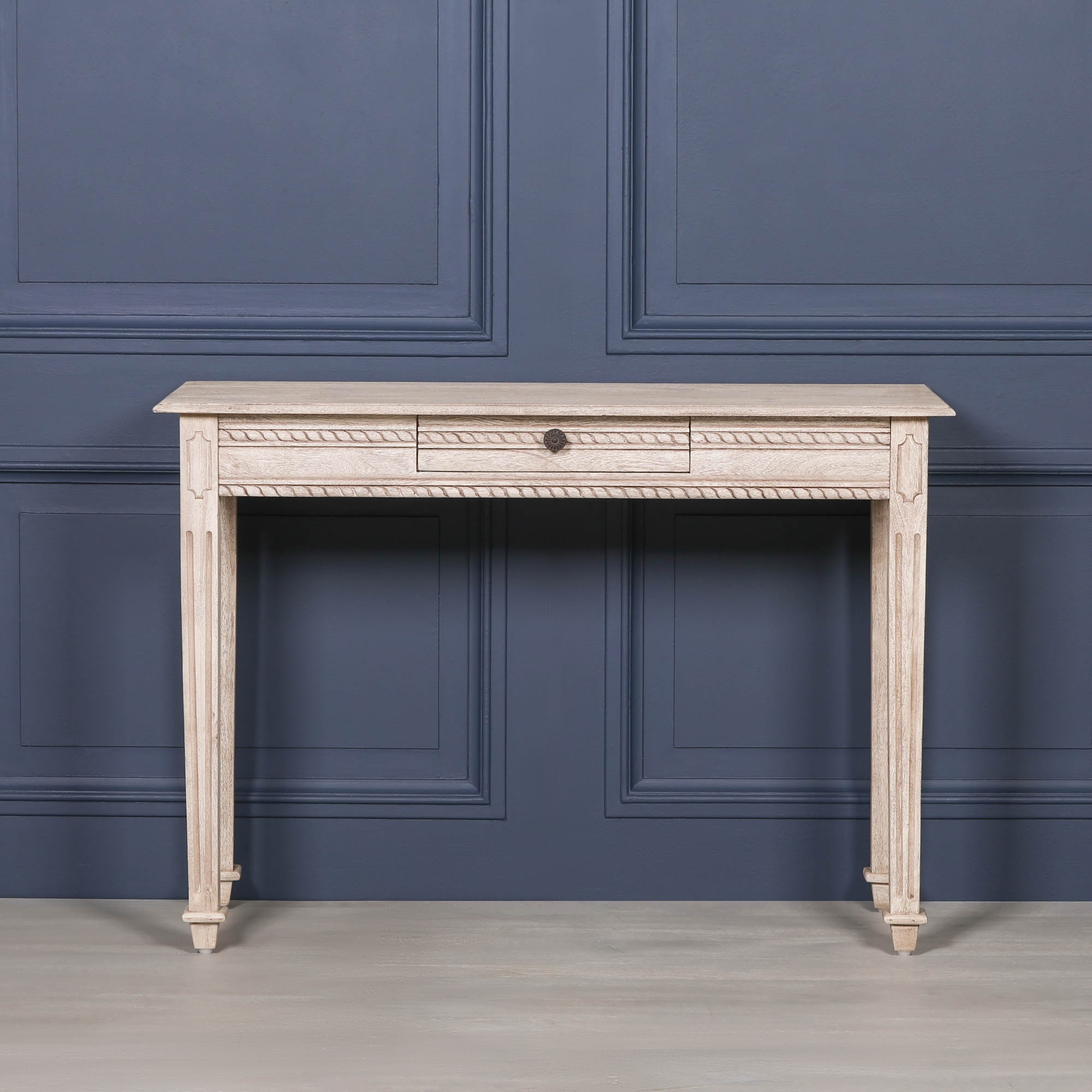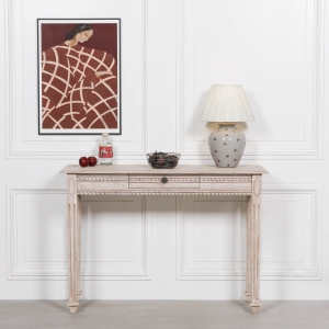 Acacia wooden table with one drawer. Ideal for use as a dressing table or hallway table. Finished in acacia wood with intricate detailed carvings. Styled with a Light Wooden Louis Upholstered Chair.