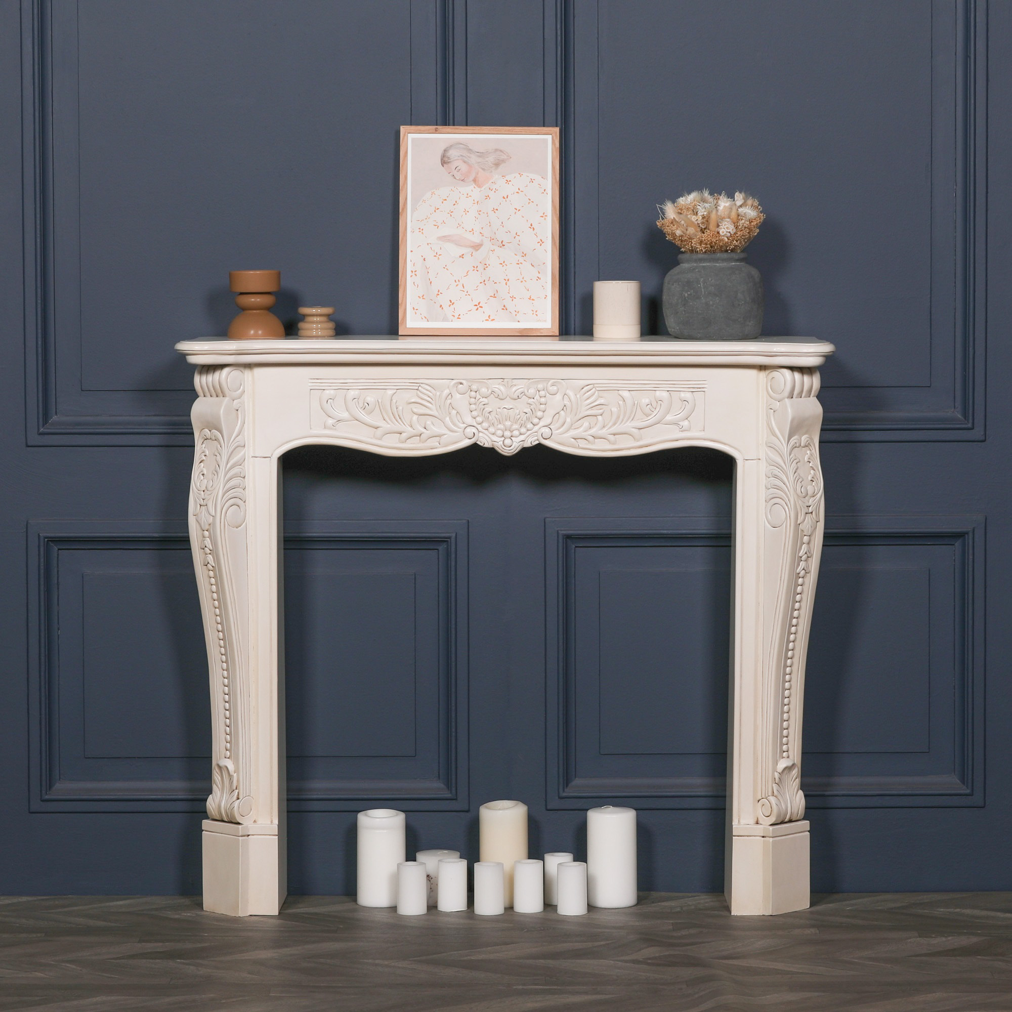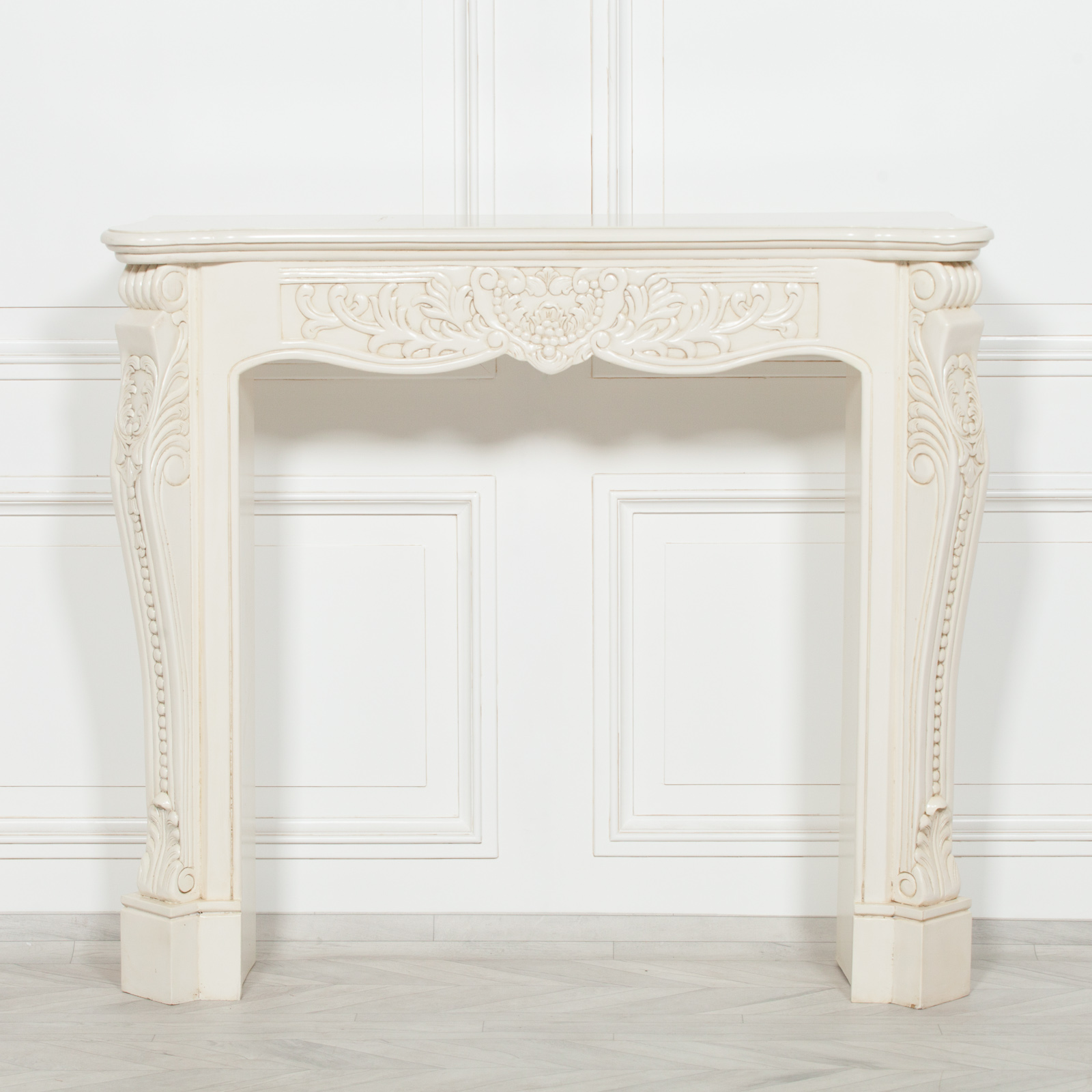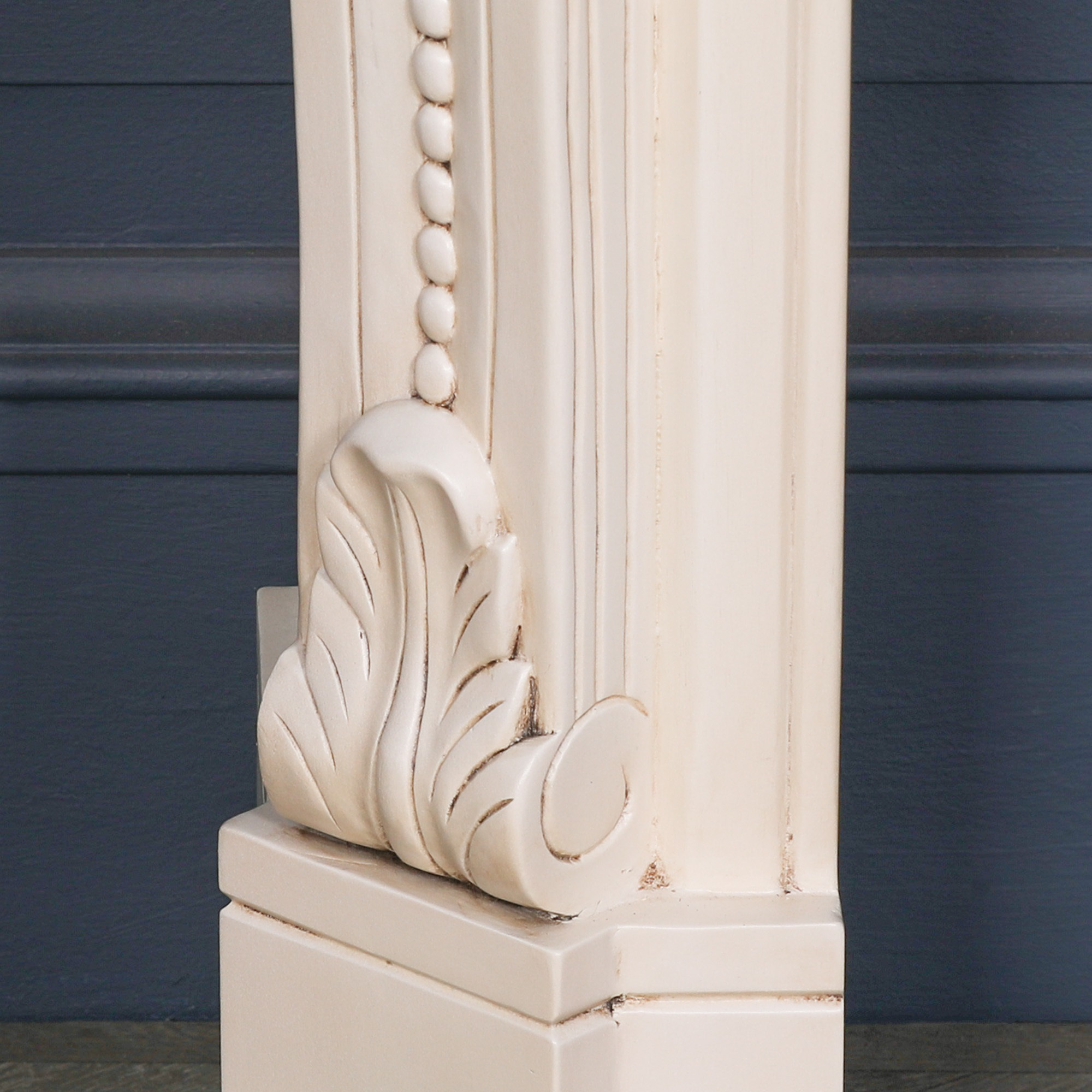 Handcrafted fire surround in an aged ivory finish with intricately hand-carved details.