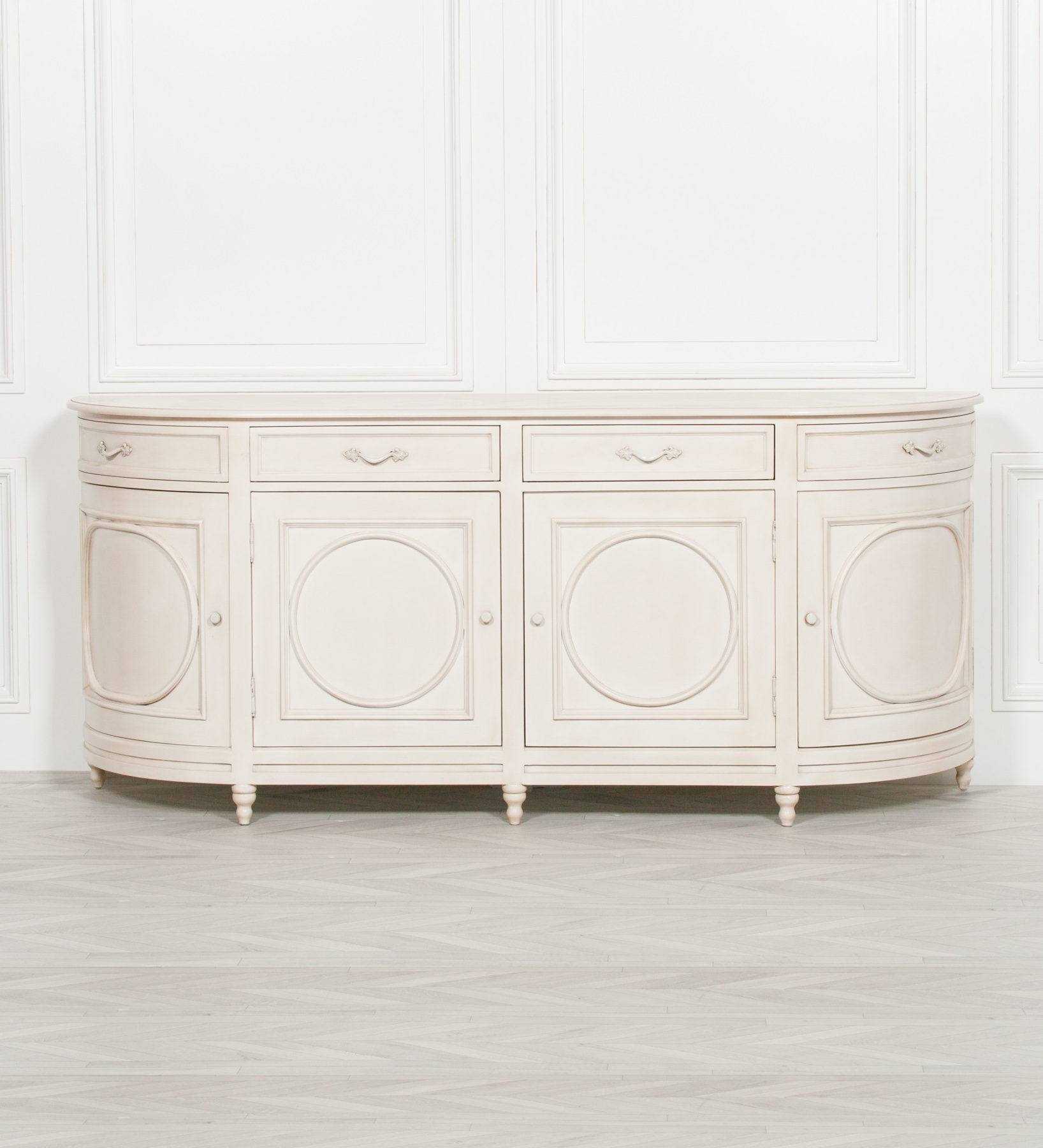 French classic style sideboard in an aged ivory finish with ornate details across the door panels and handles.