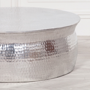 Round coffee table hand made from aluminium with a silver finish and patterned surface.