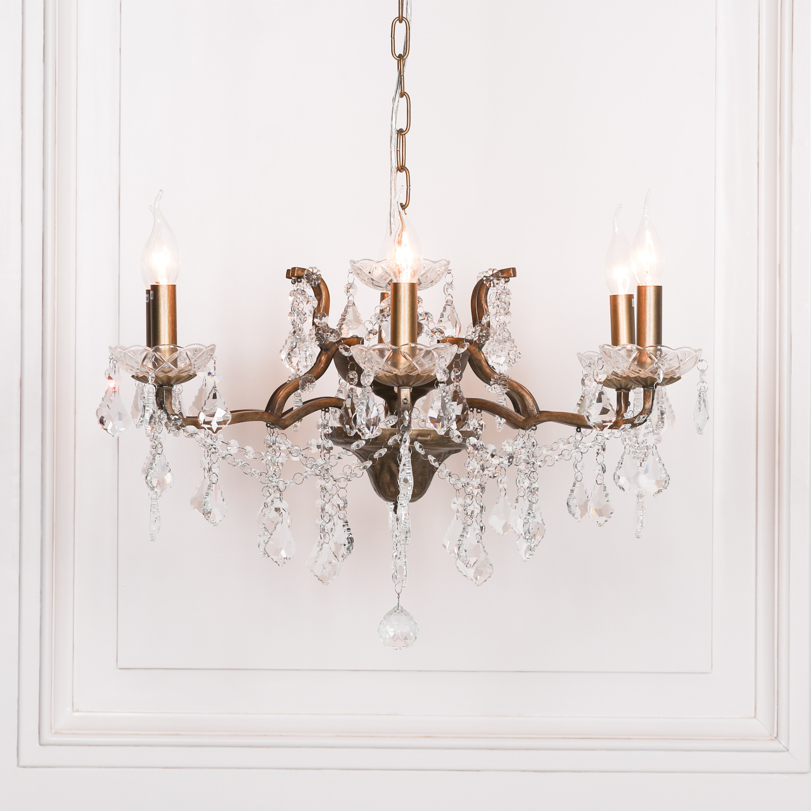 Six branch French-style shallow chandelier in an antique gold metal frame with polished, clear-cut glass droplets and an adjustable chain.