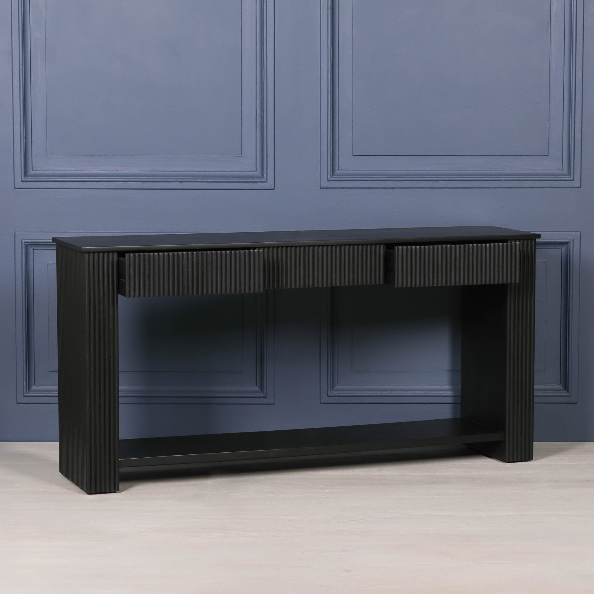 Hand-crafted fluted acacia wooden console with 3 drawers and lower shelf in a black painted finish.