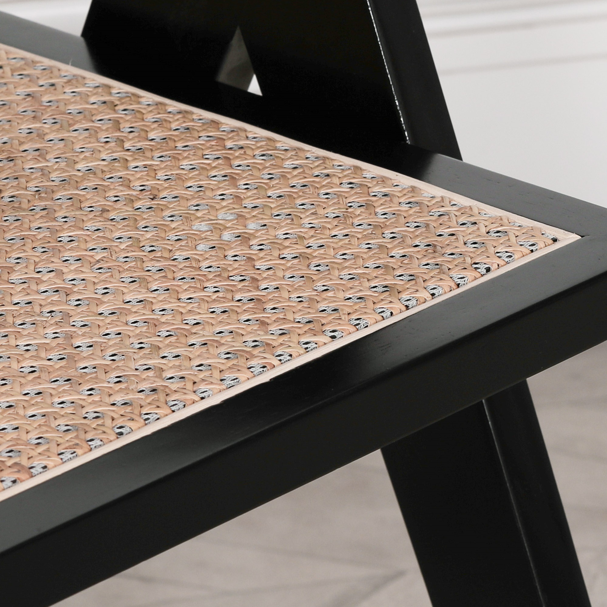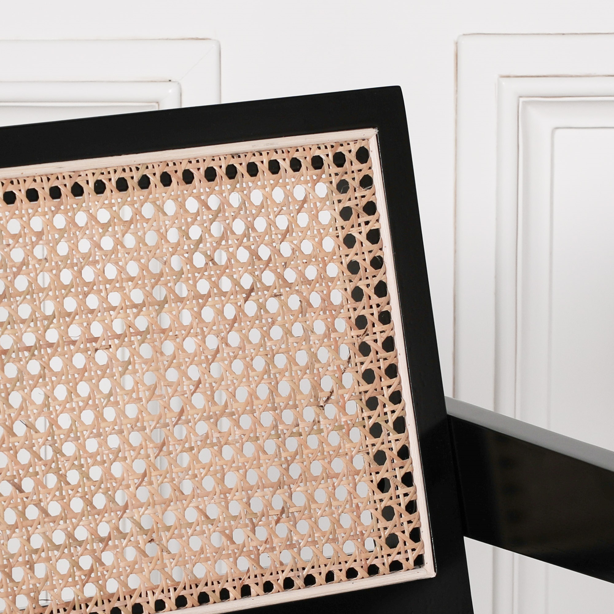 Black painted wooden cane dining chair in a design handcrafted from wood with a rattan seat and backrest.