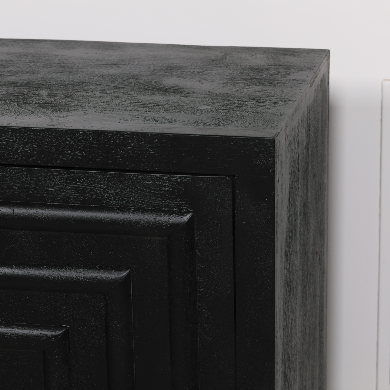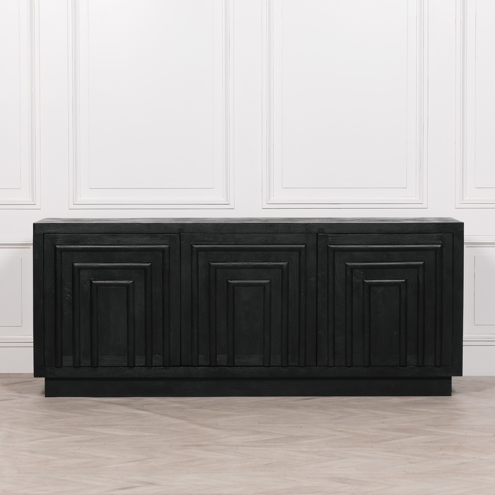 Black three-door sideboard with a contemporary front design and push spring loaded doors featuring internal shelves.