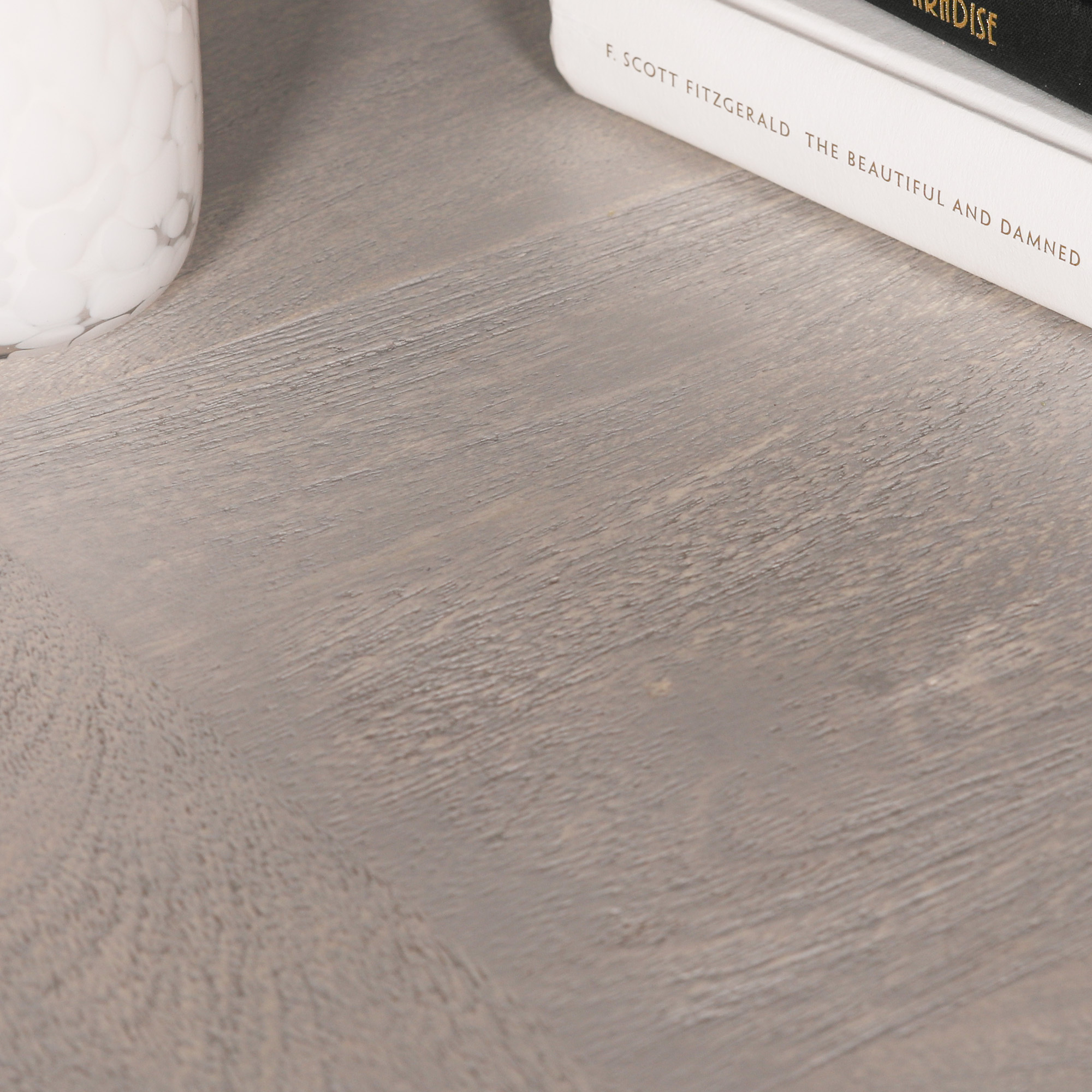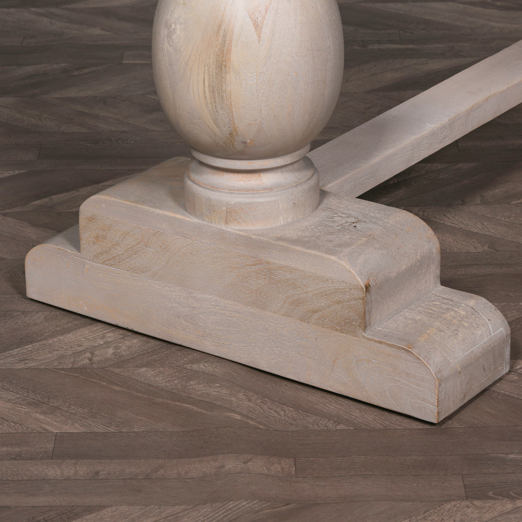 Rectangular 210cm dining table handcrafted from blanche mango wood with a light grey rustic wash. The table has hand-carved, detailed columned base pedestals. Styled with Light Wooden Louis Upholstered Dining Chairs.