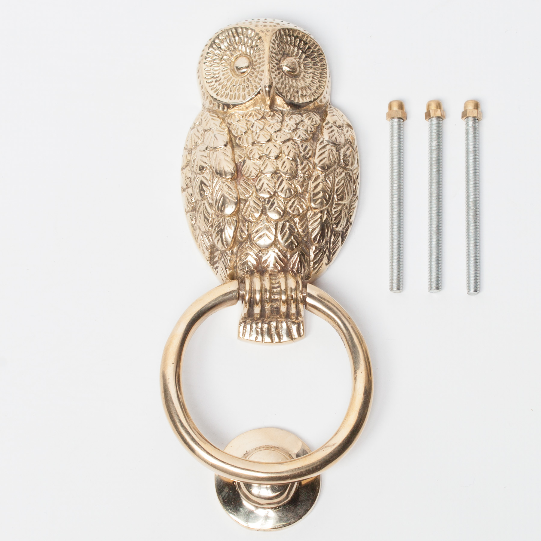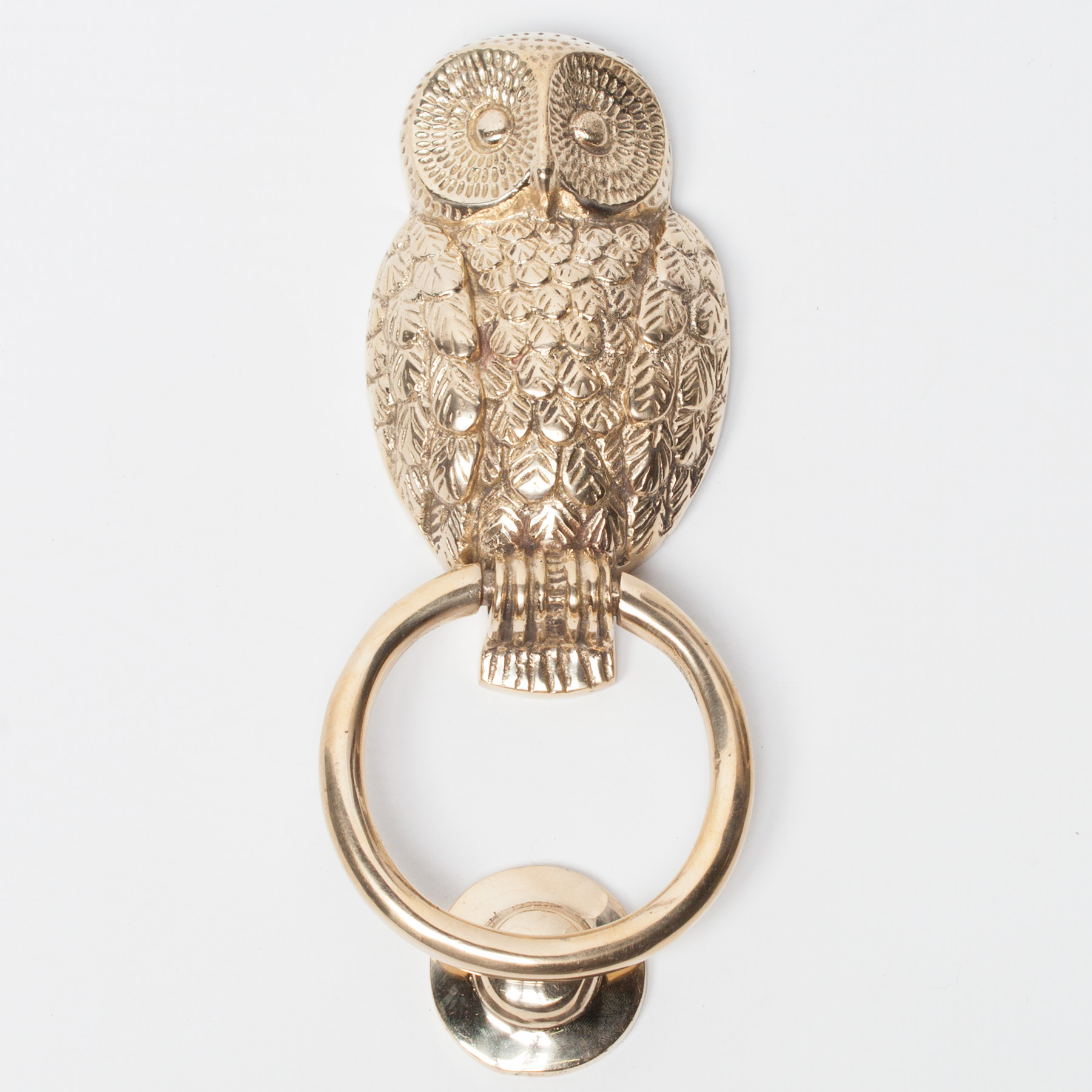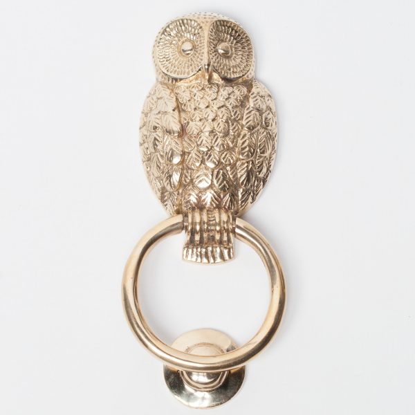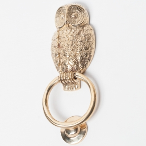 Gold finish owl door knocker handcrafted from polished brass with small intricate details.