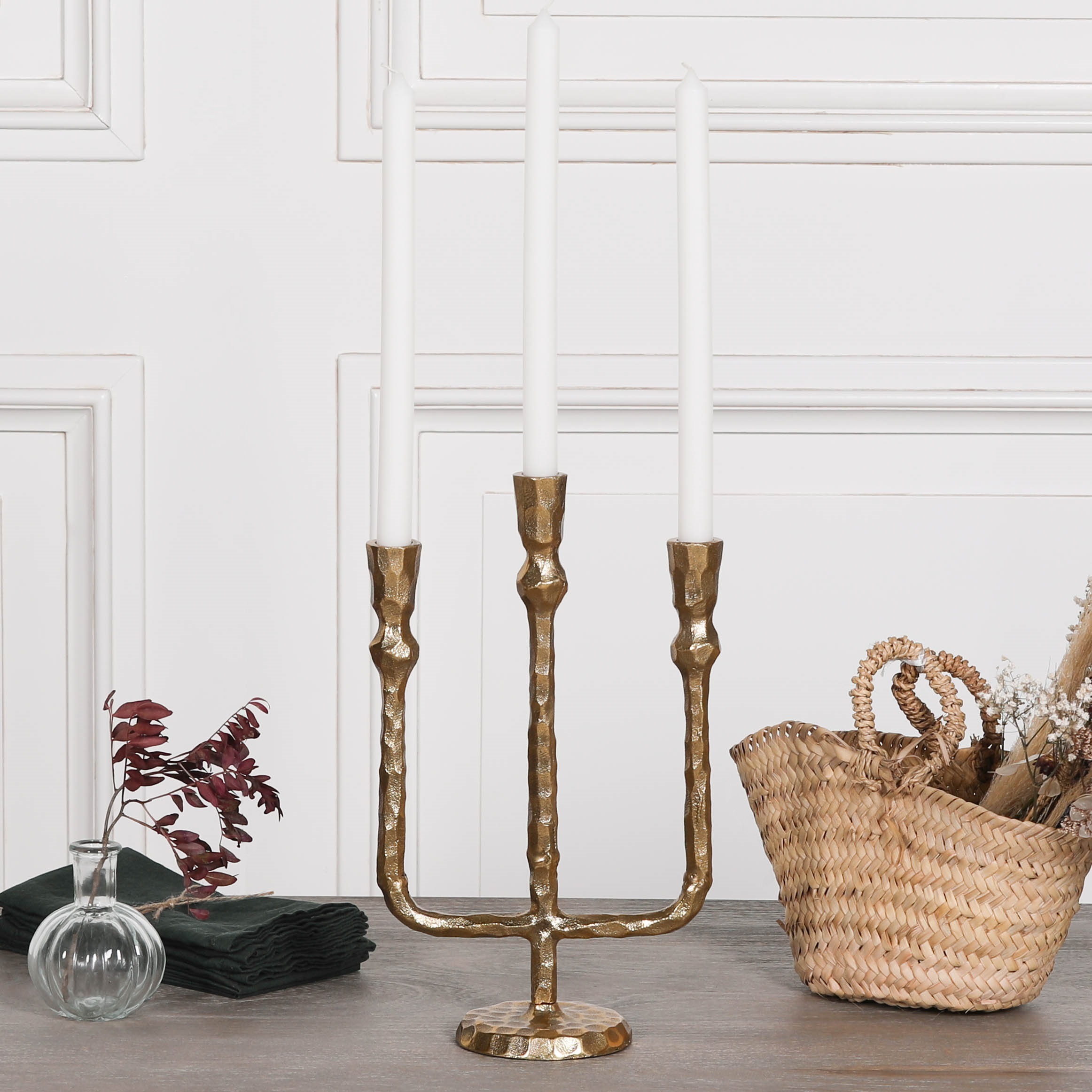 35cm Brass plated aluminium candelabra crafted from cast aluminium with a brass plated finish