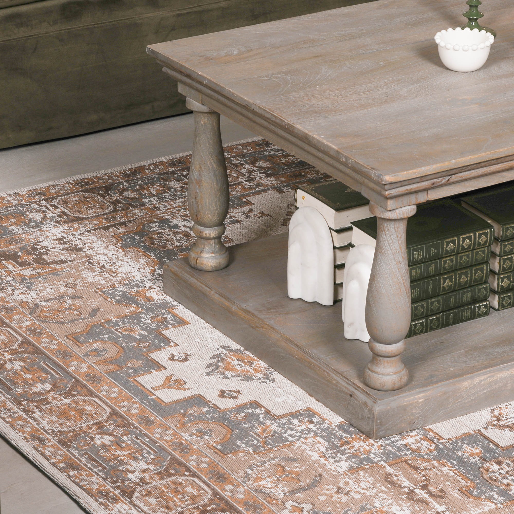 Brown Chenille Rug made from cotton chenille expertly hand woven using a Jacquard woven technique. The Chenille rug has a beautiful Persian patterning in a distressed faded style with subtle colours of brown, oranges, greys and blues against the back drop of the natural chenille cotton.