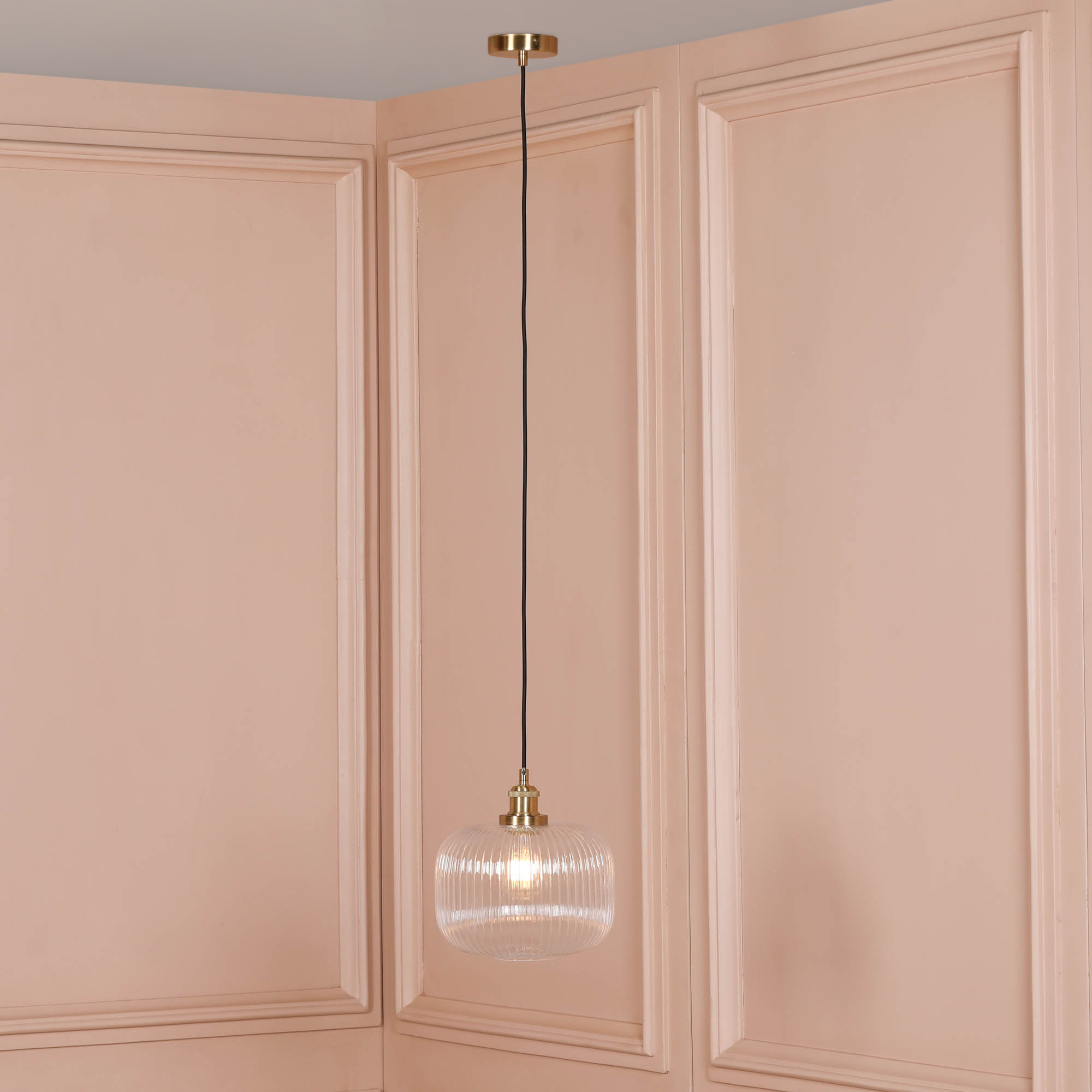 Fluted Glass Pendant ceiling light with brushed brass metal finish and black braided cable cord. Cord can be shortened in height.