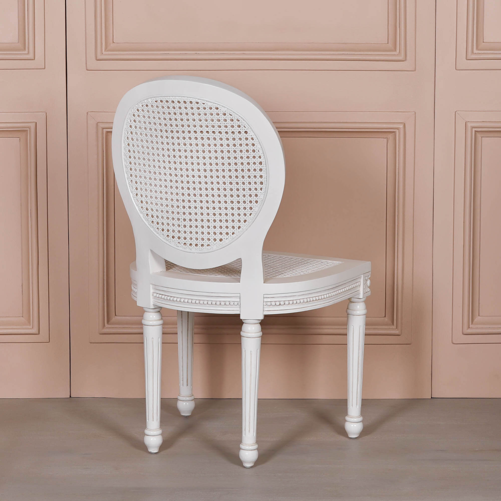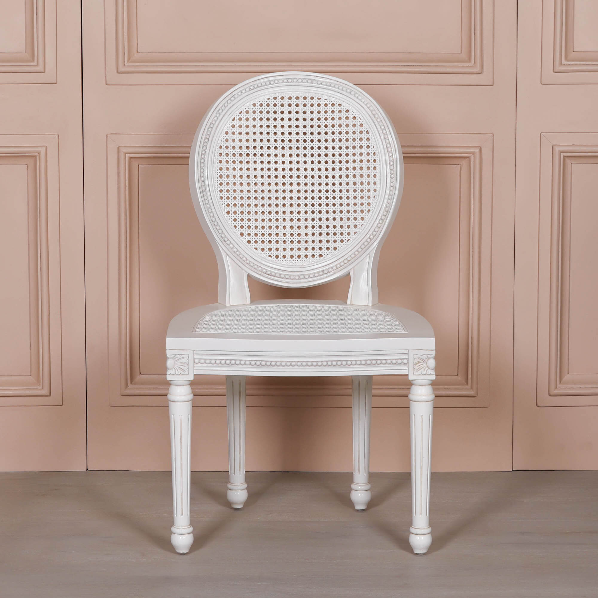 Off-white / Pale Ivory colour chateau dining chair in a French antique style with a rattan backrest and seat. The mahogany frame has delicate carvings and tapered legs.