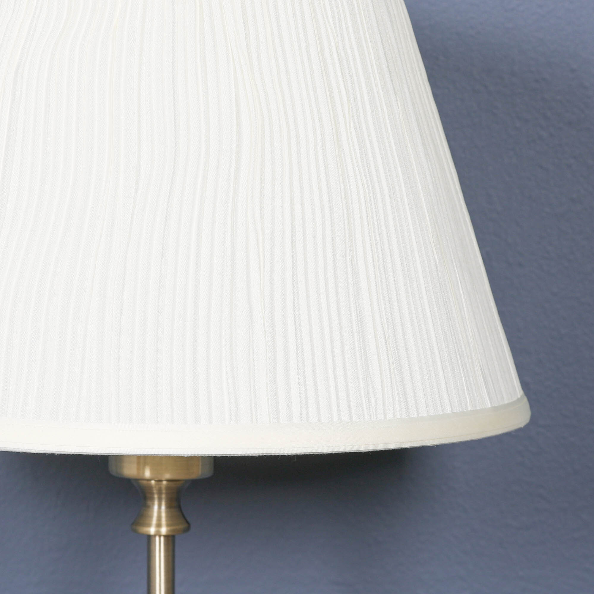Traditional style table lamp finished in satin brass with cream fabric pleated shade.