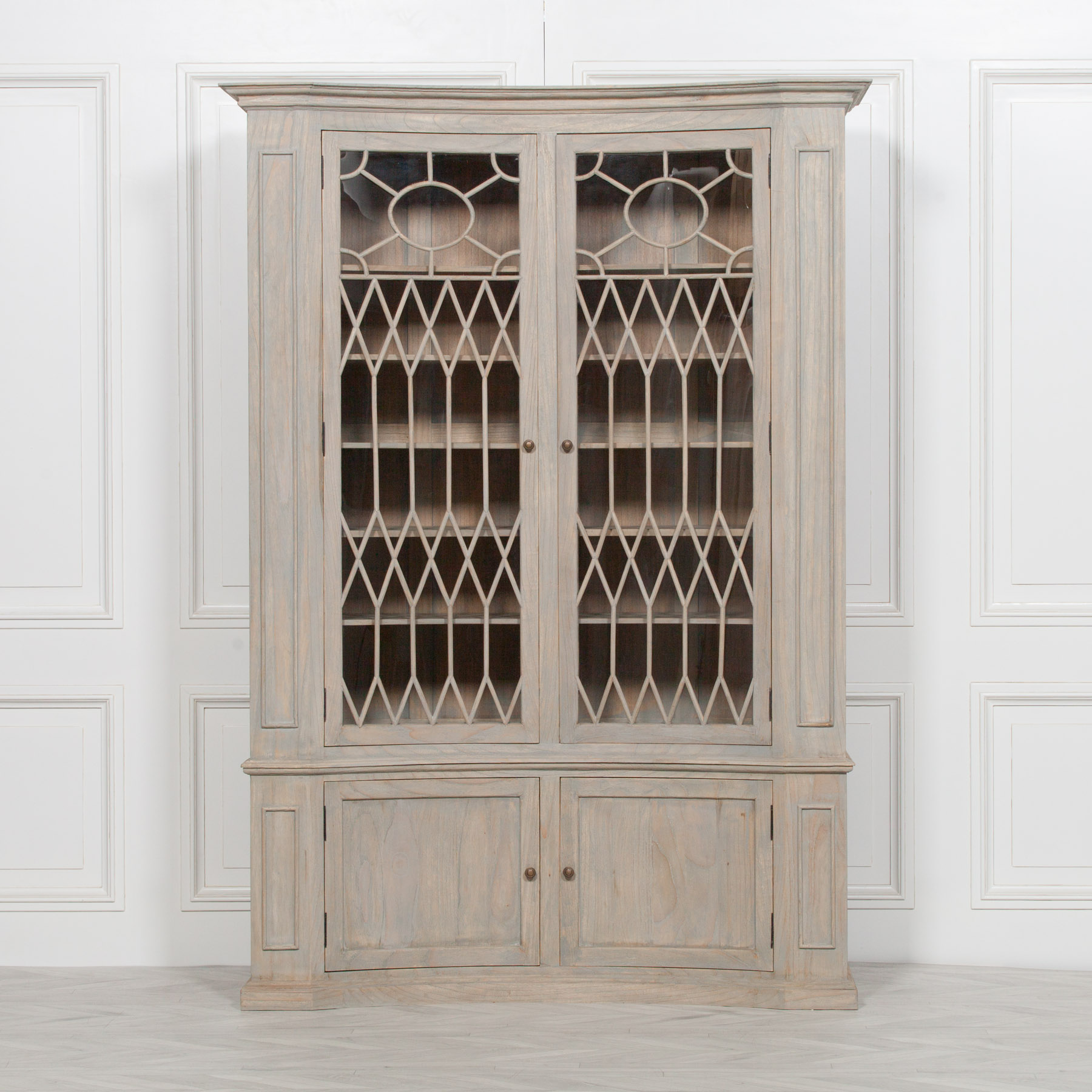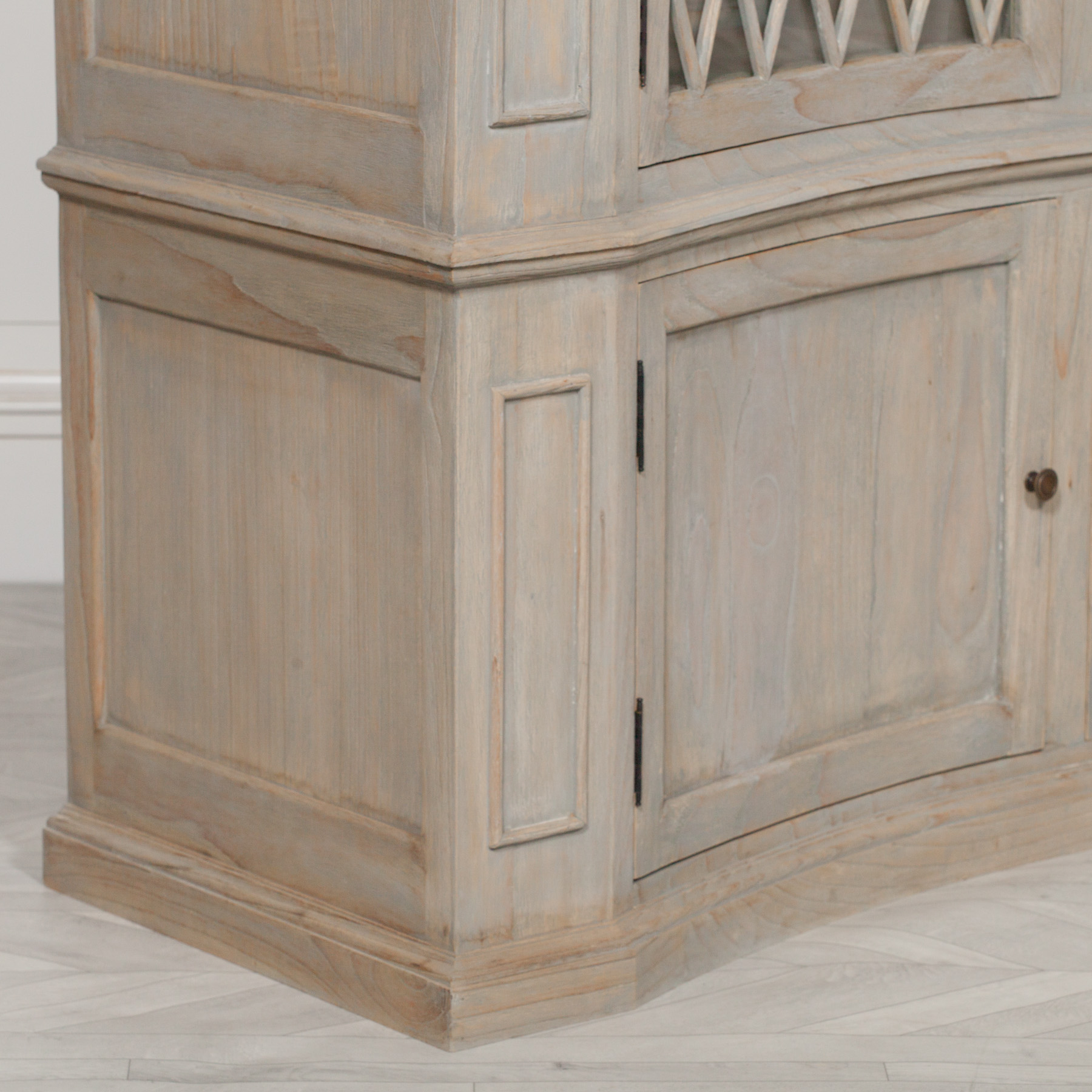 Concave wooden display cabinet crafted in white cedar with intricate detailing on the doors and internal shelving for storage.