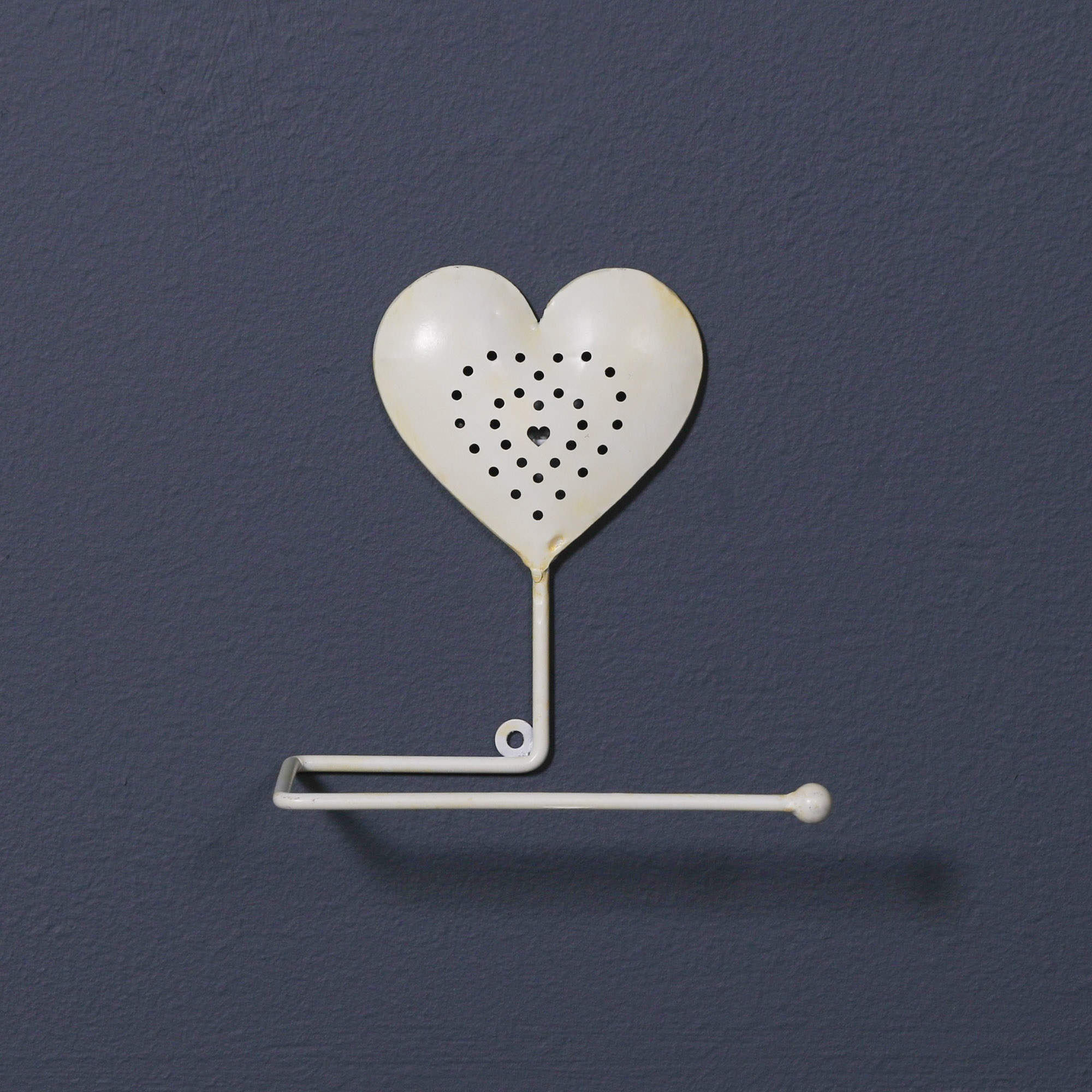 Cream heart toilet roll holder crafted from metal in a vintage style.