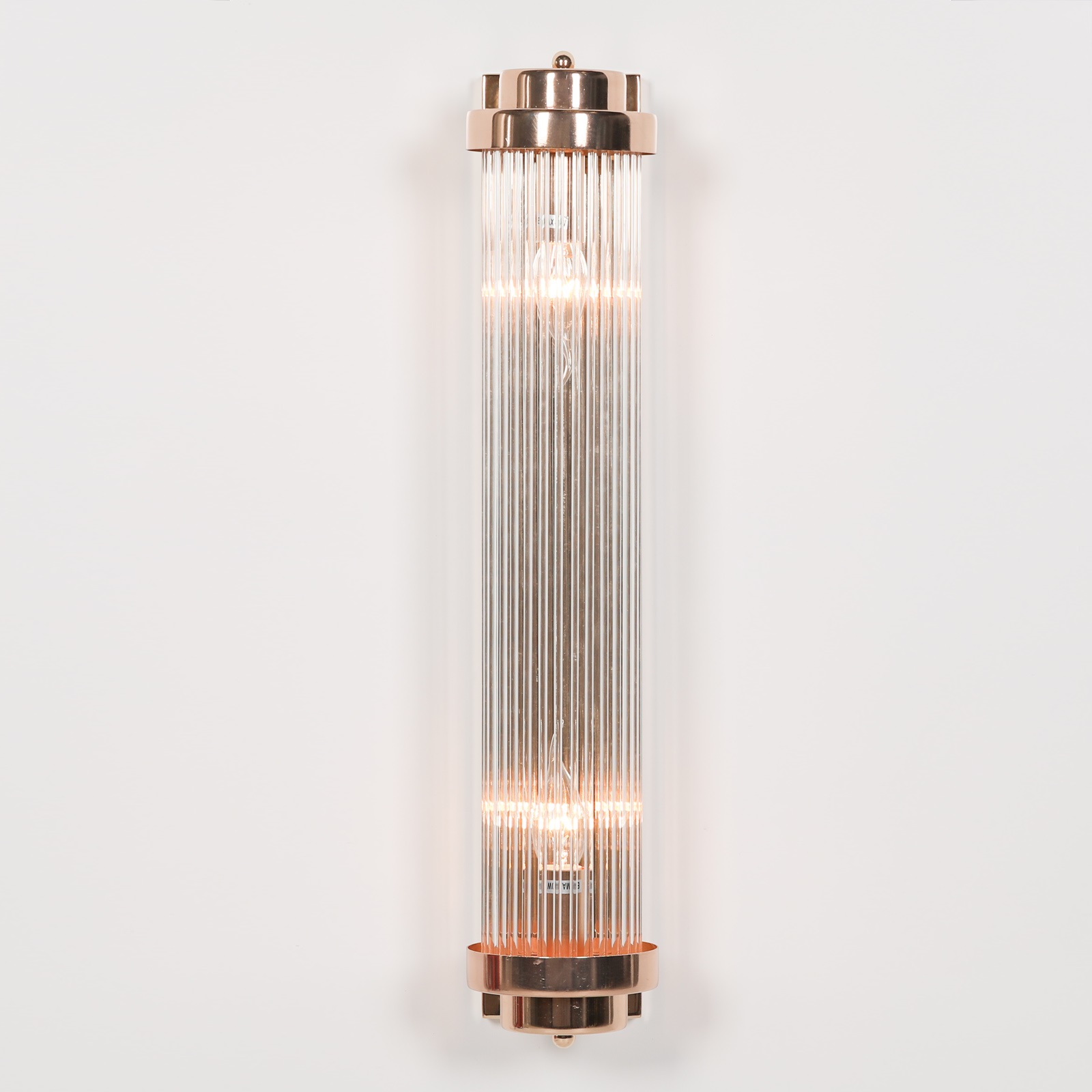 Art deco 61cm wall light in a gold metal finish with columned clear glass rods.