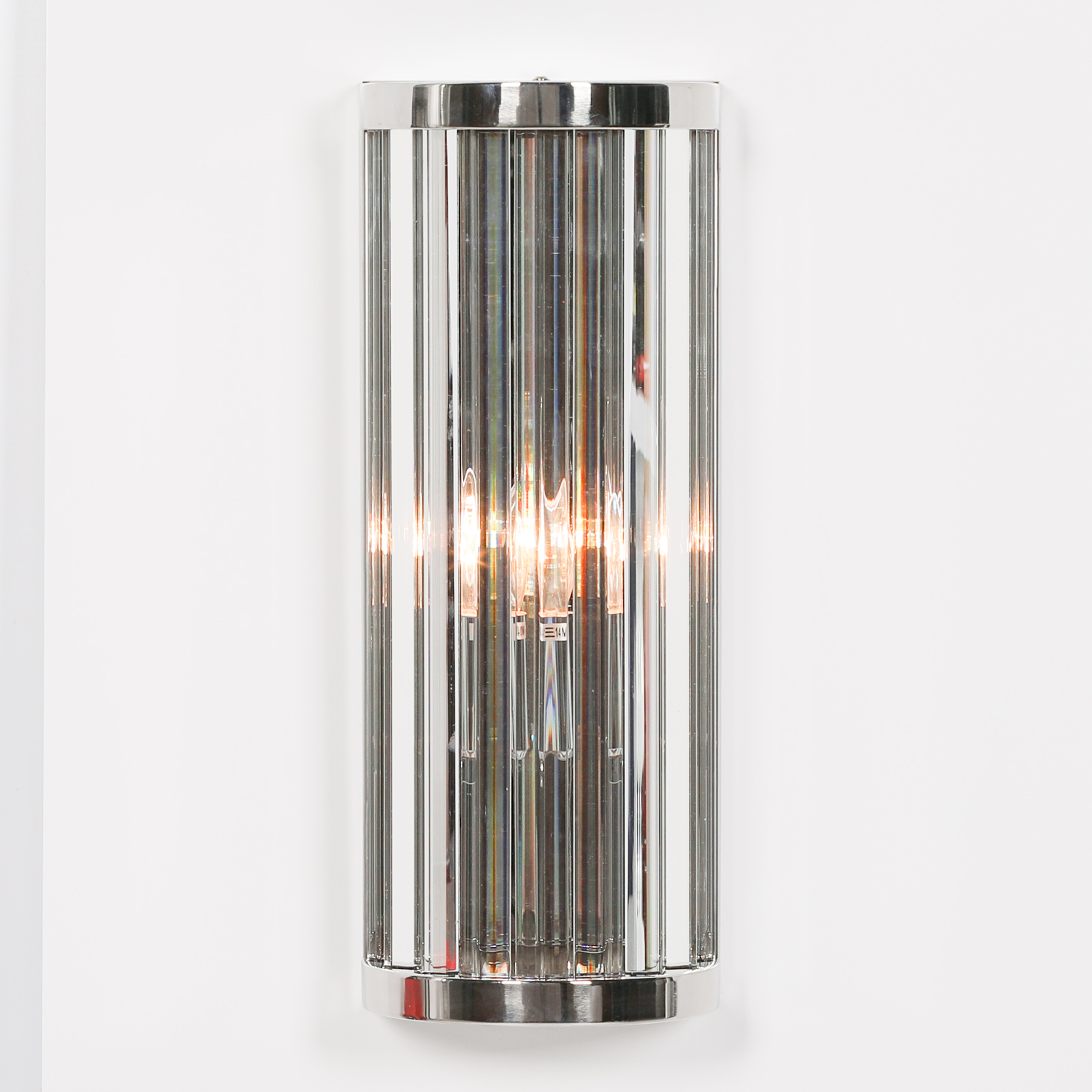Art deco 39cm wall light with a sleek chrome metal frame and vertical clear glass rods.