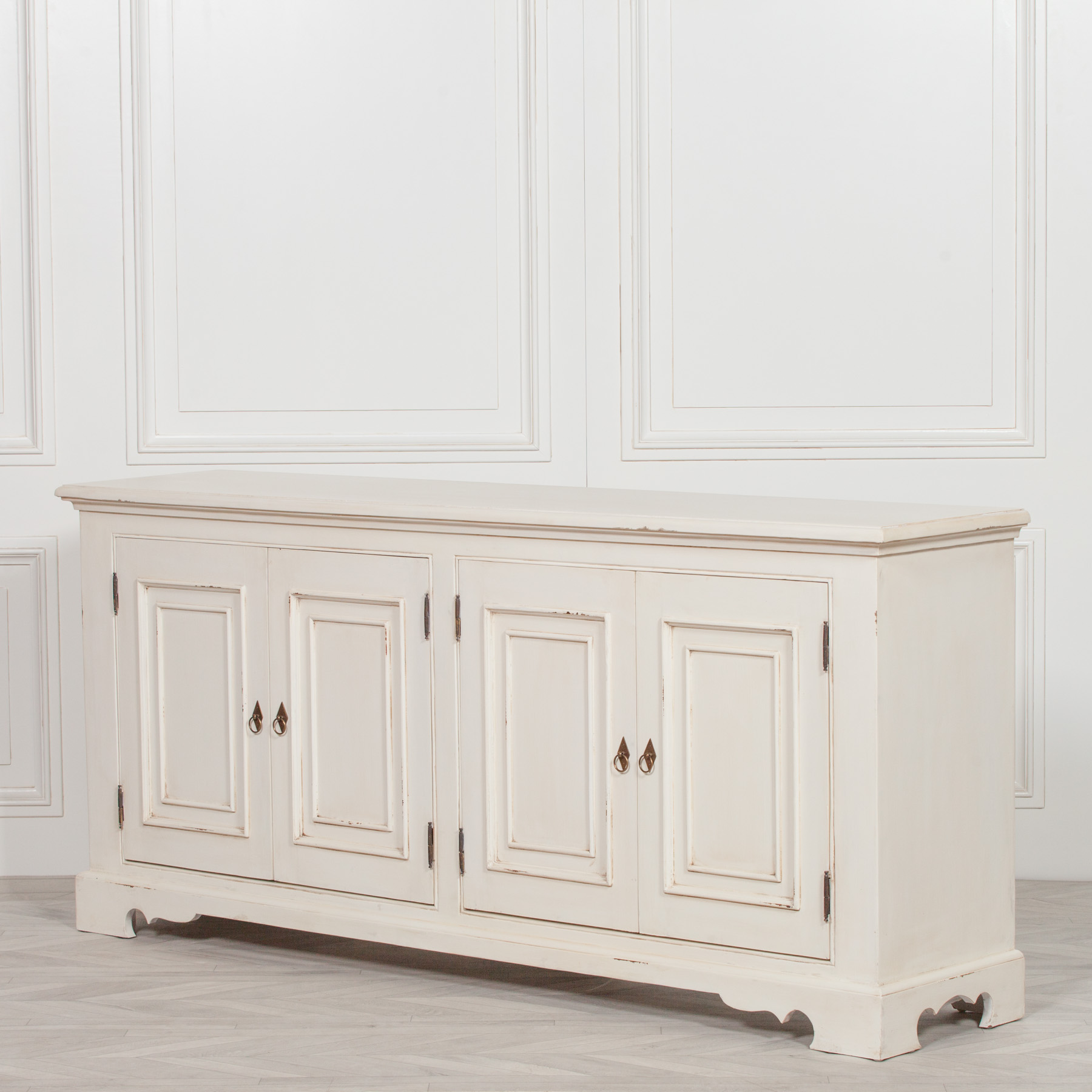 Mahogany wood ornate classical sideboard with a white brush painted aged distressed style and detailed handles.