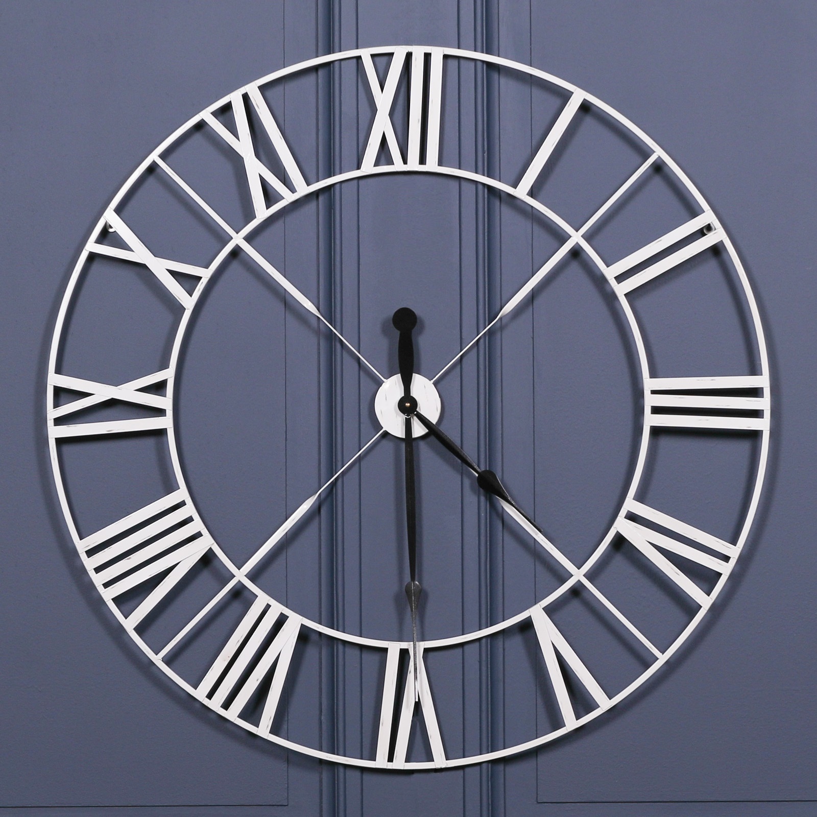 Twist-designed 110cm wall clock in a distressed off-white metal finish and contrasting black clock hands.