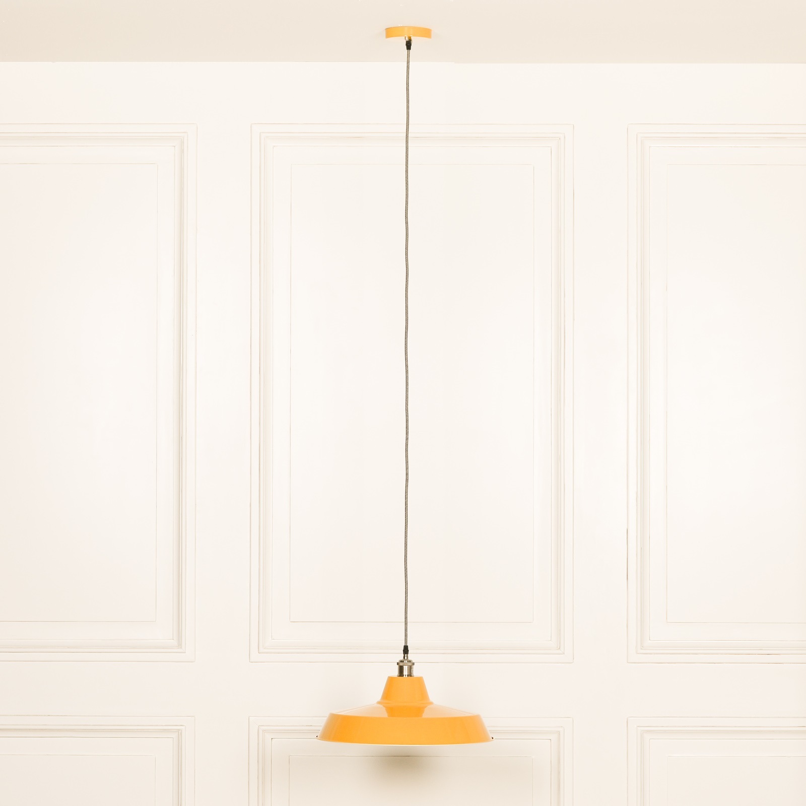 46cm large pendant light in a factory-style with mustard yellow enamel metal painted finish and an adjustable braided cord.