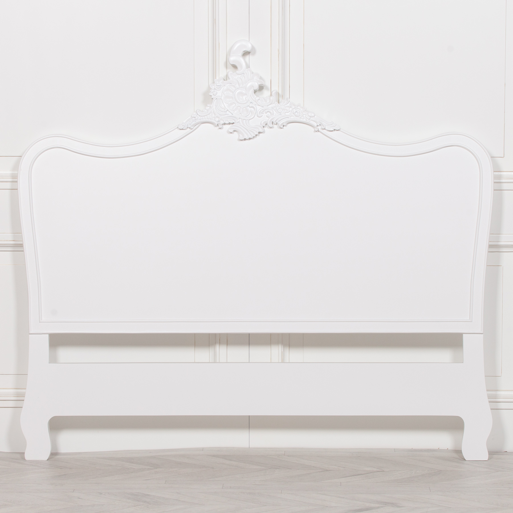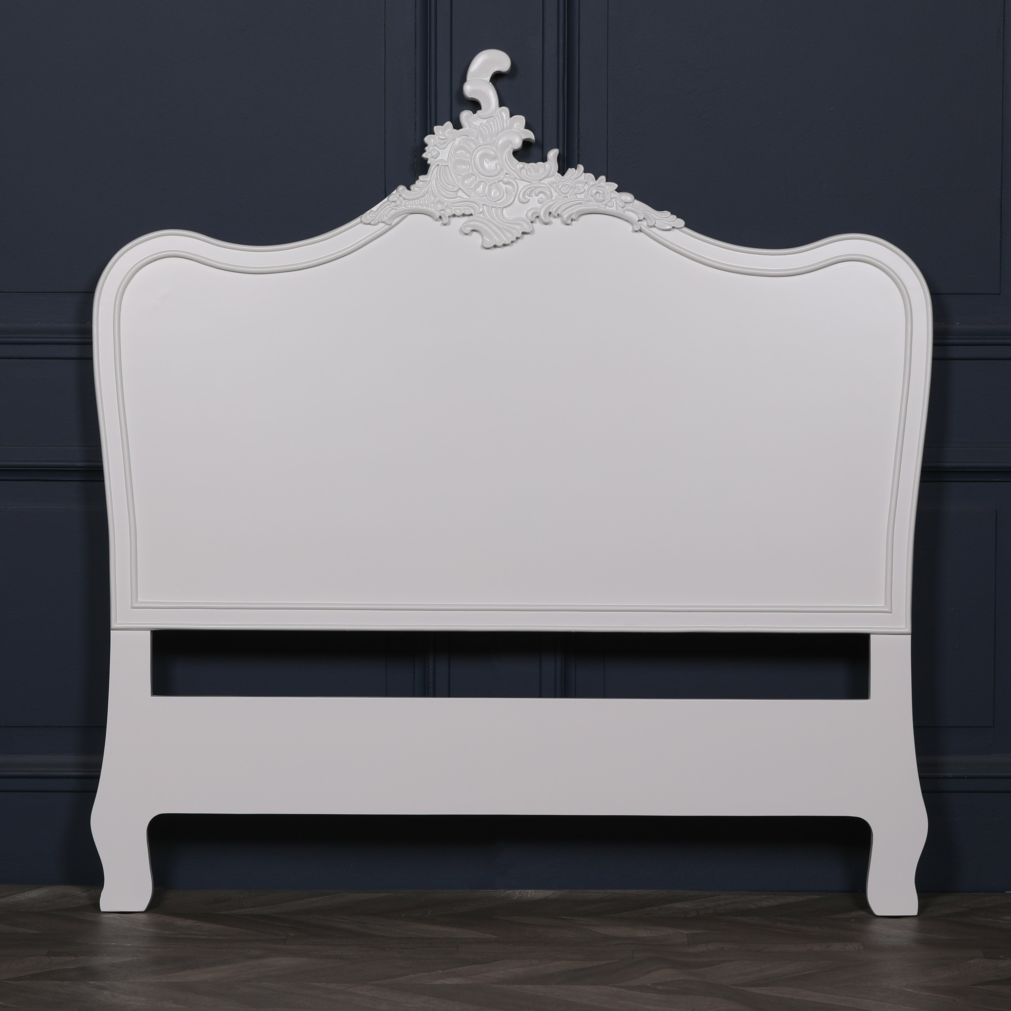 White 4ft6 double size freestyle headboard in a French antique style with detailed motif crown and curved edges.