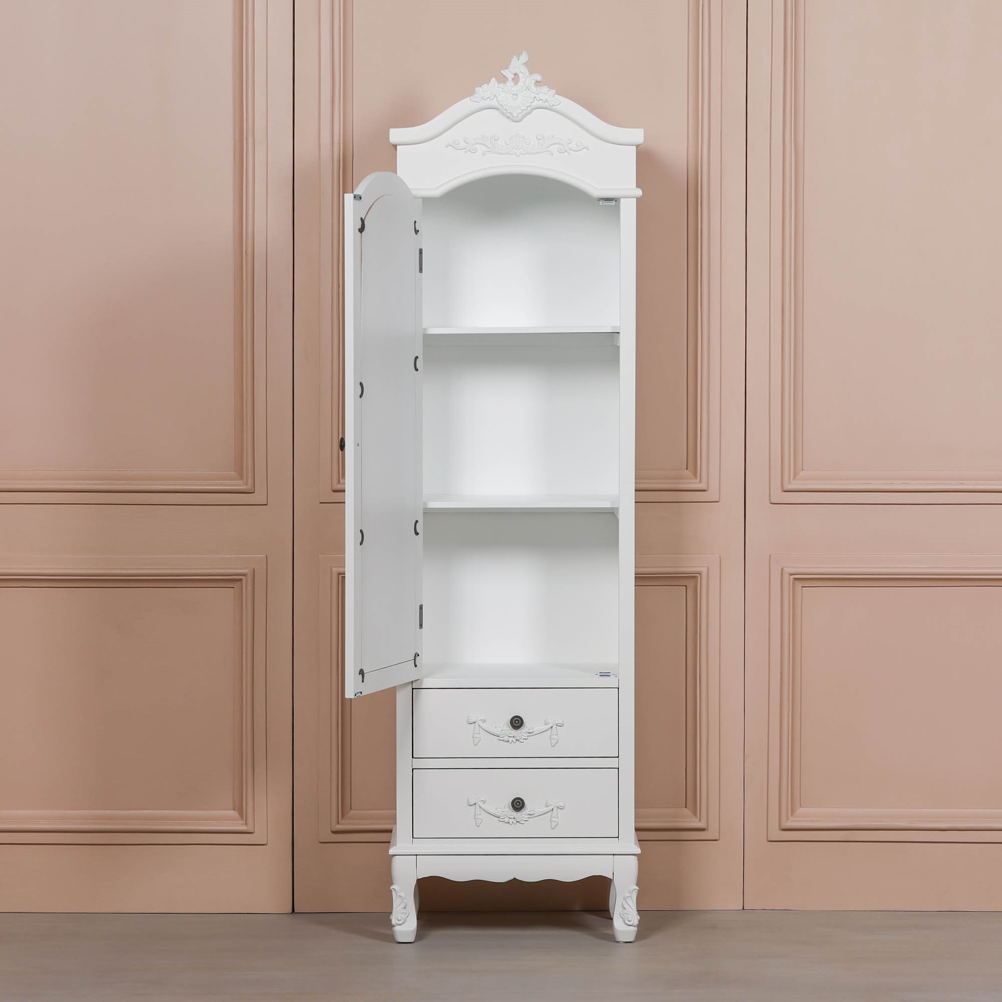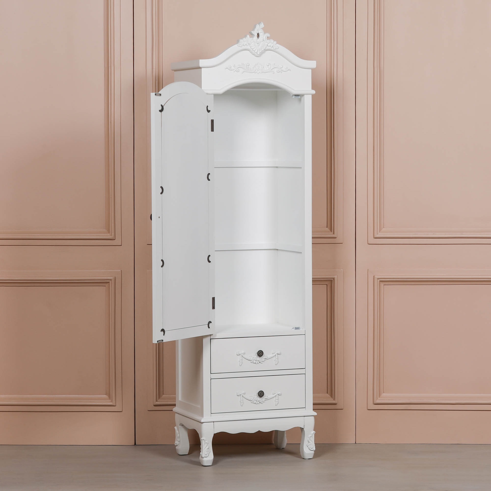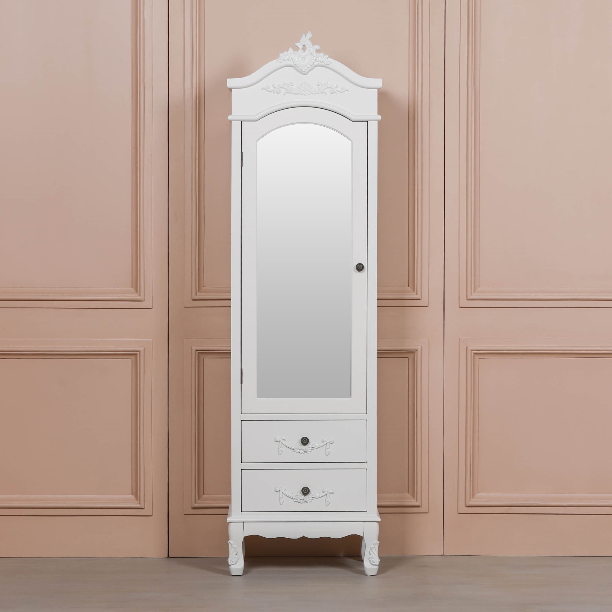 Single white painted wardrobe in a French style with a mirrored door. Featuring a hanging pole, two removeable shelves and glide rail drawers.