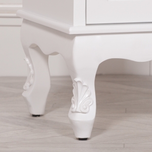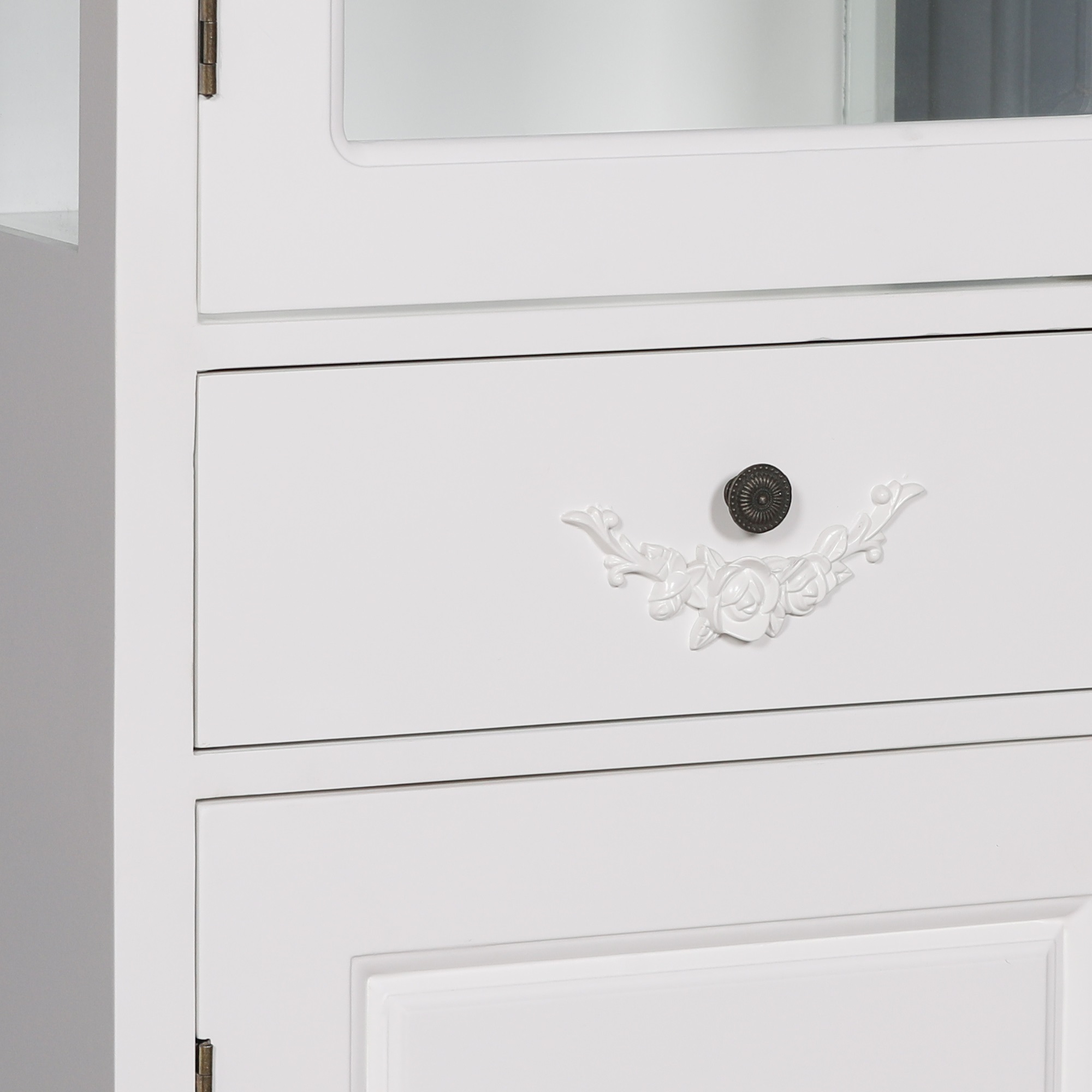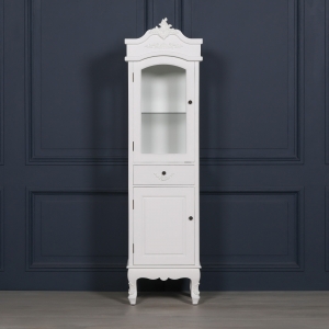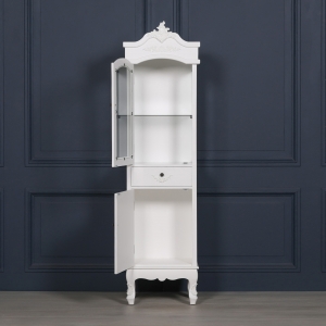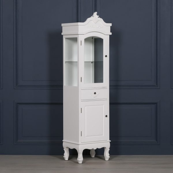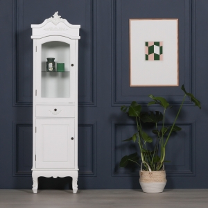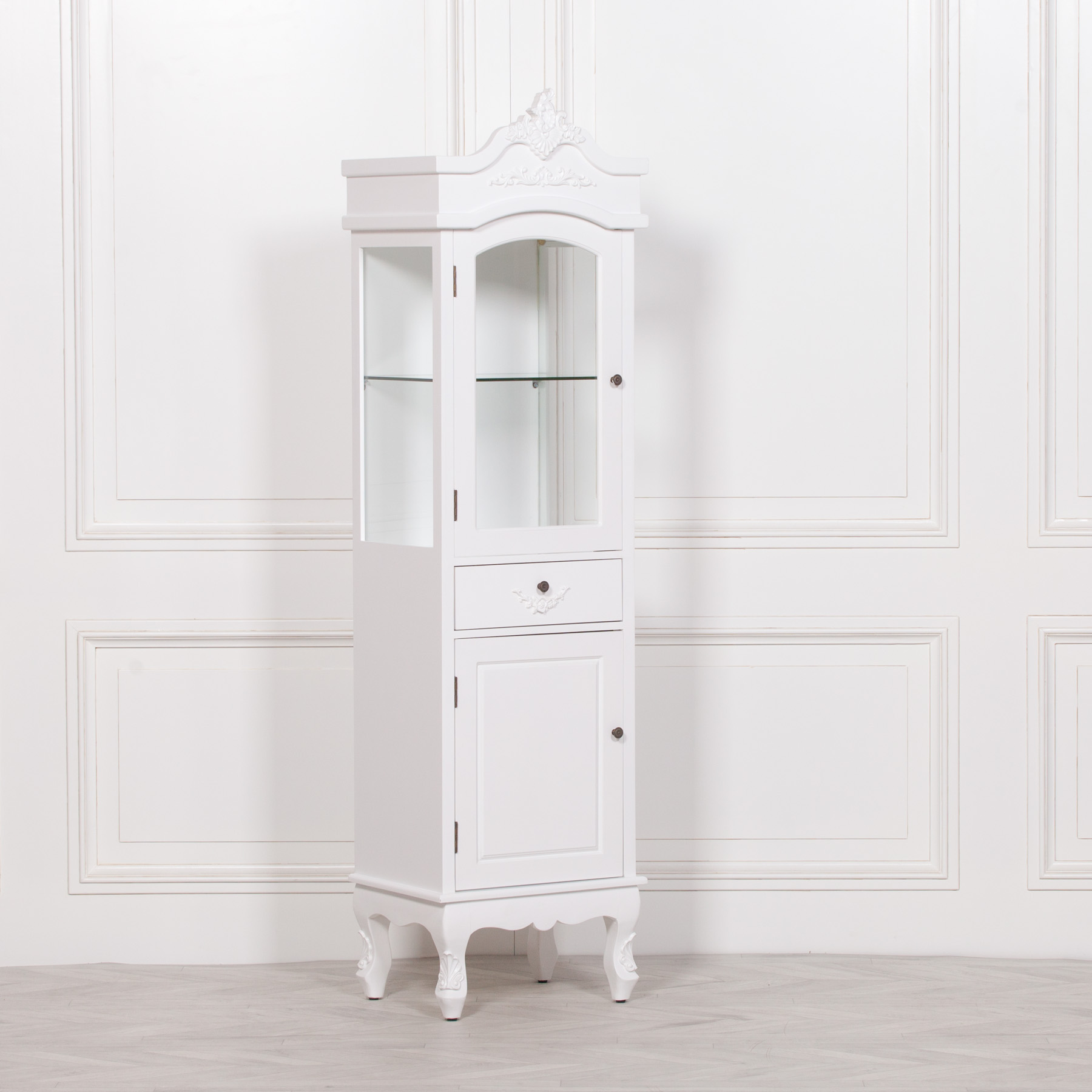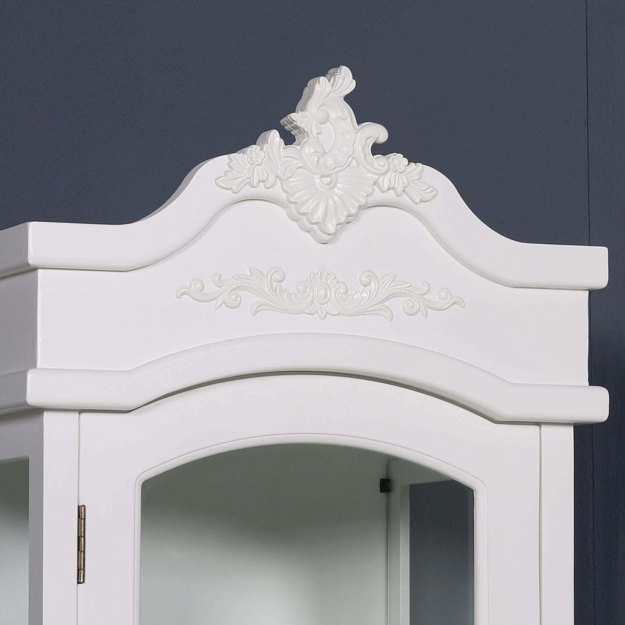 White display cabinet in a French antique style with a tempered glass shelf and intricate motif detailing.