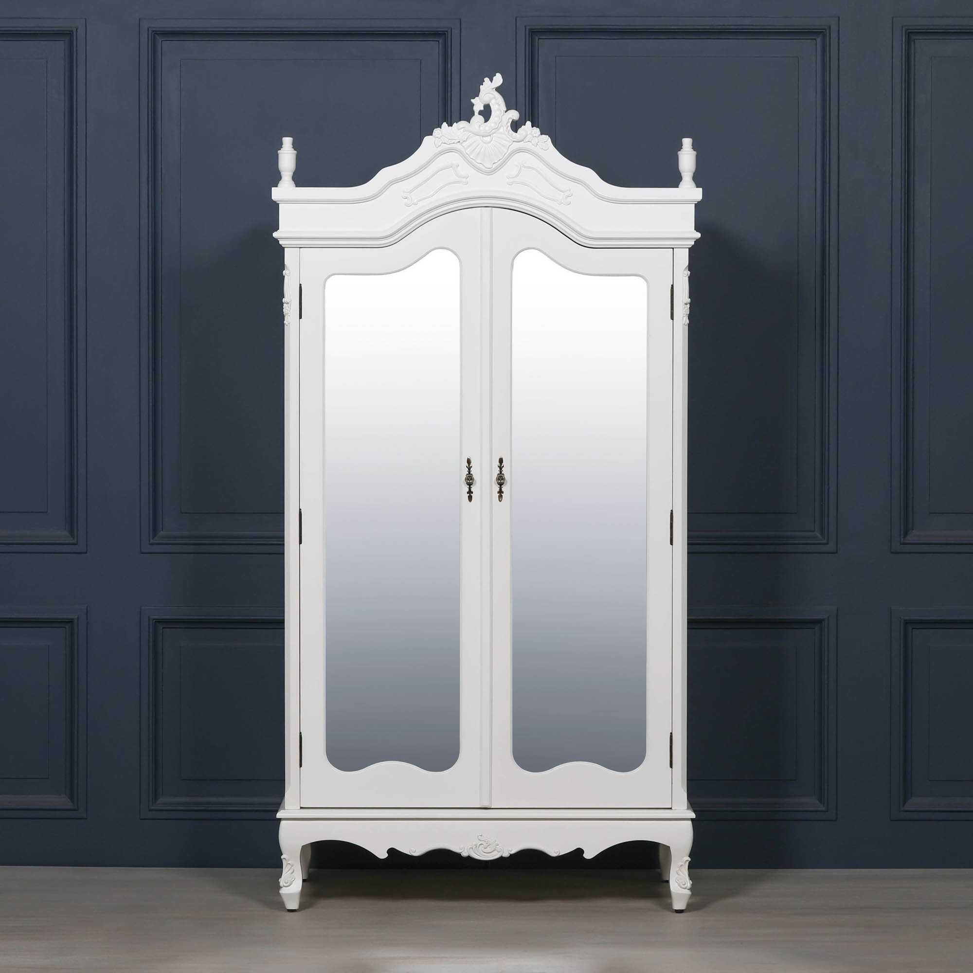 White painted double wardrobe in a French antique style featuring detailed motif crown and legs with full length mirrored doors. The internal features include a hanging pole and removable shelf inside.