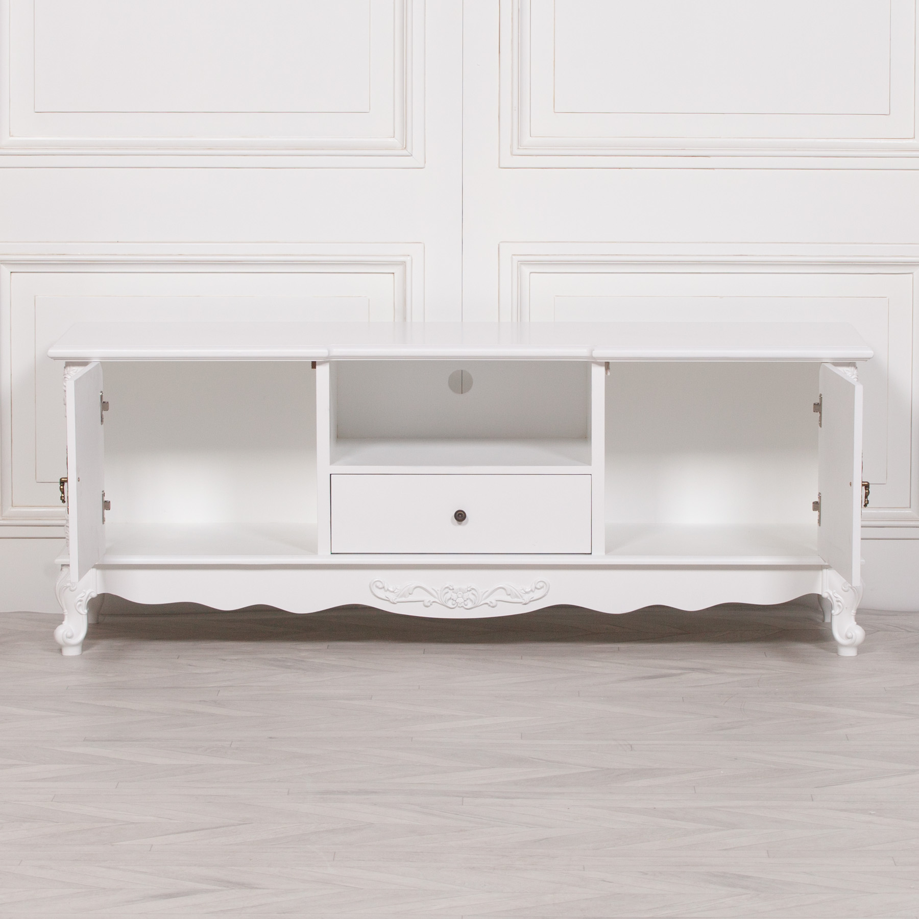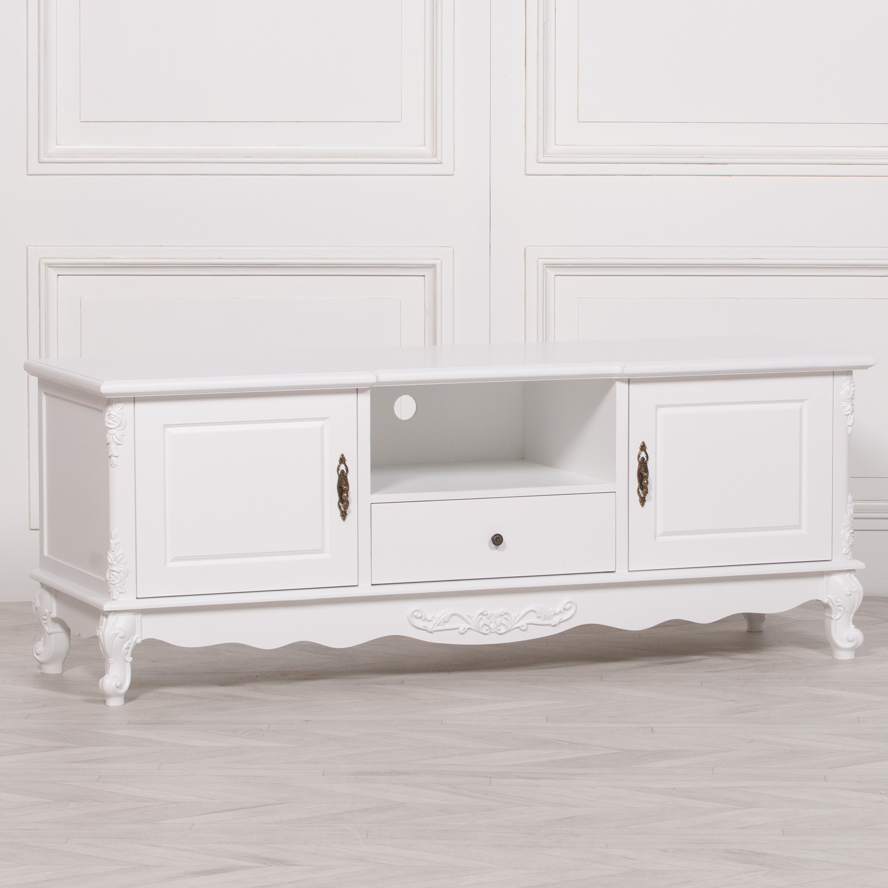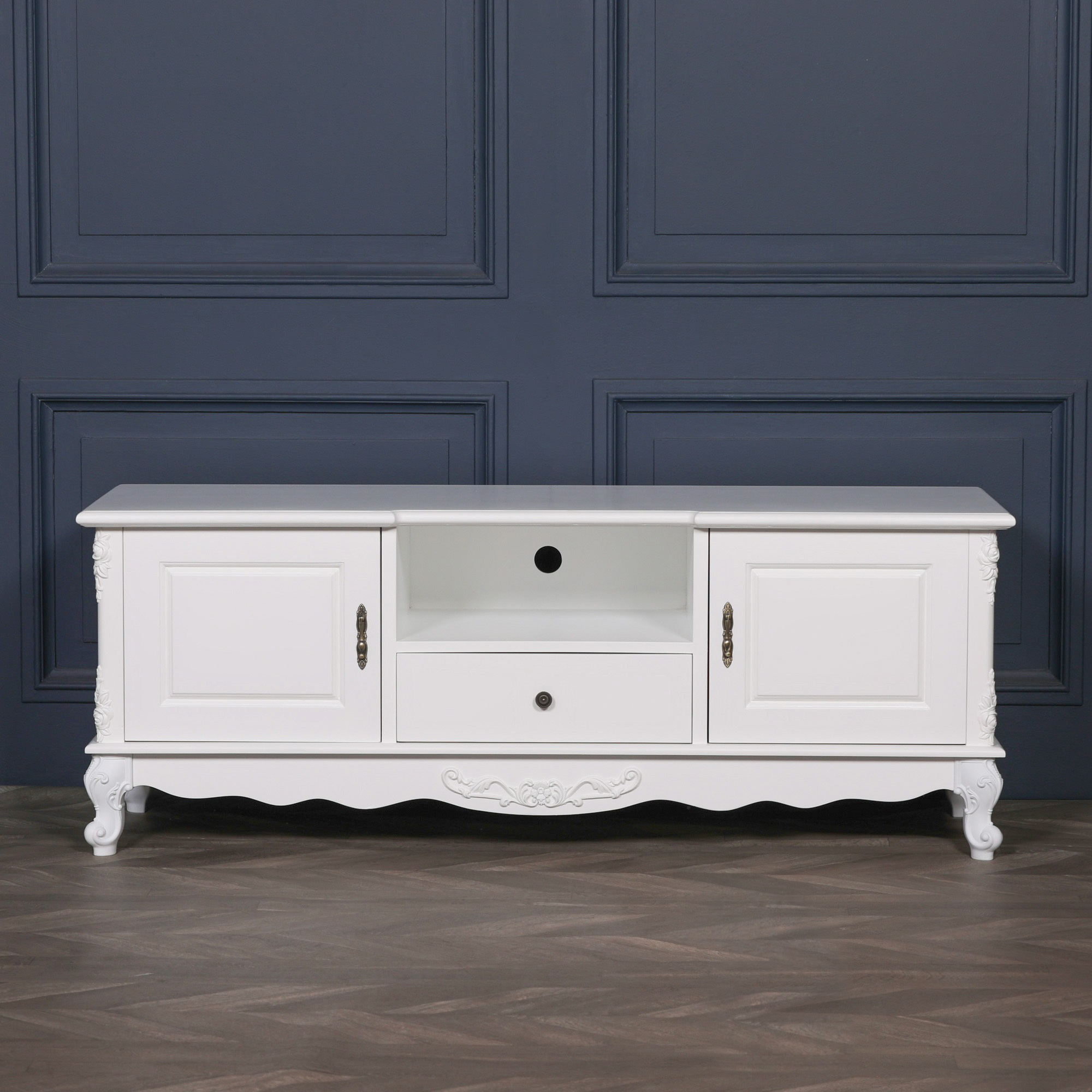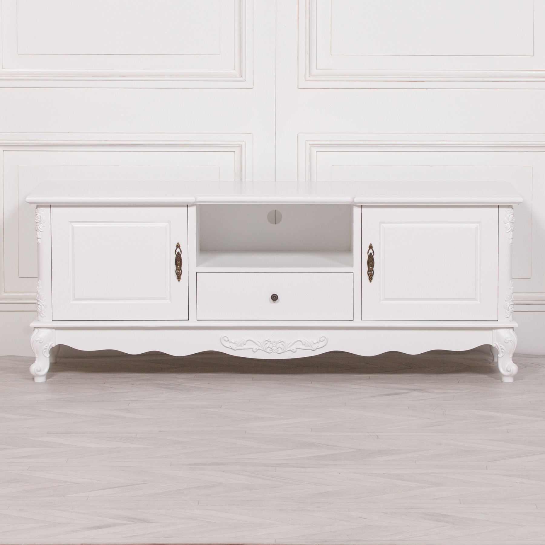 White large cabinet TV unit in a French antique style featuring two cupboards and one drawer and intricate hand-carved details.