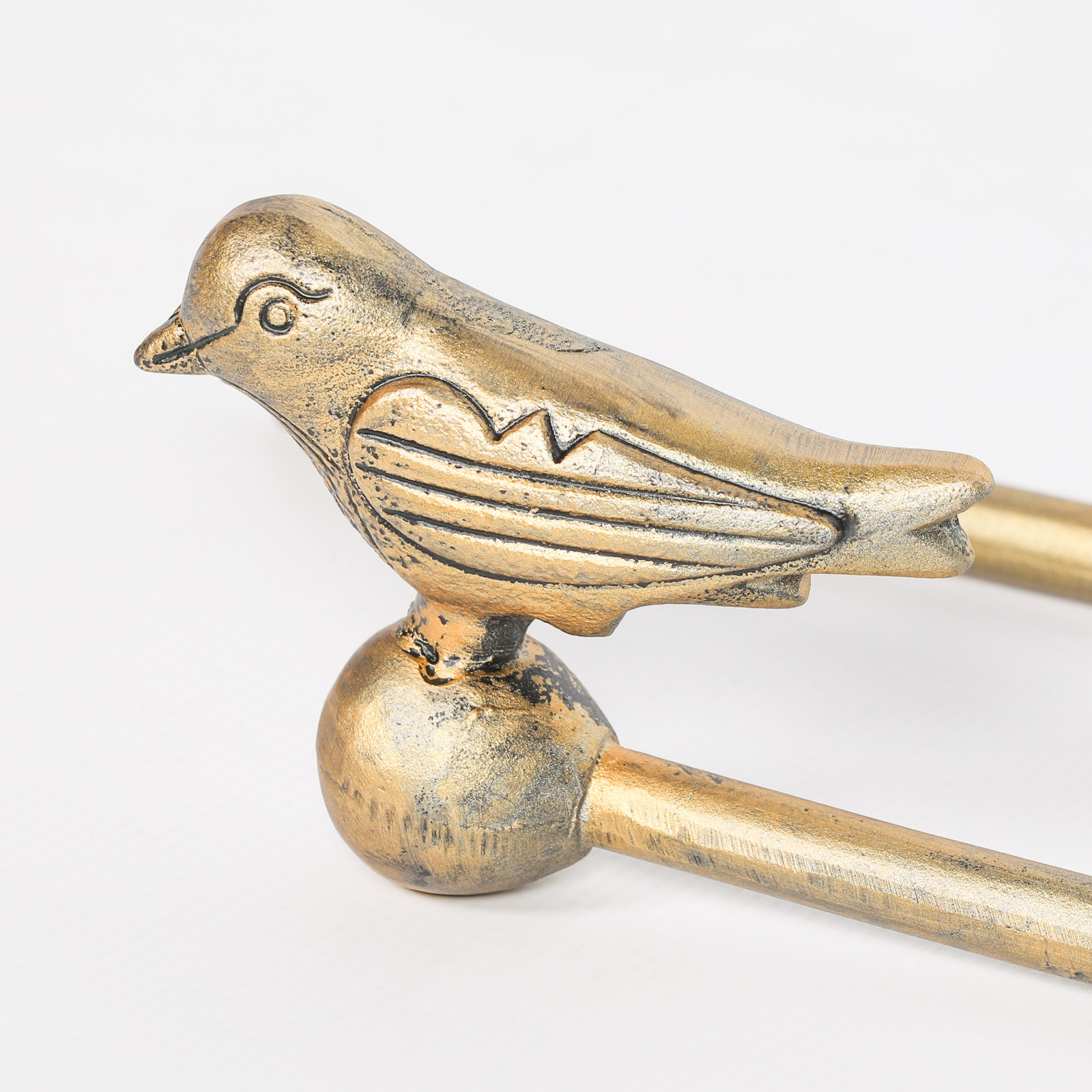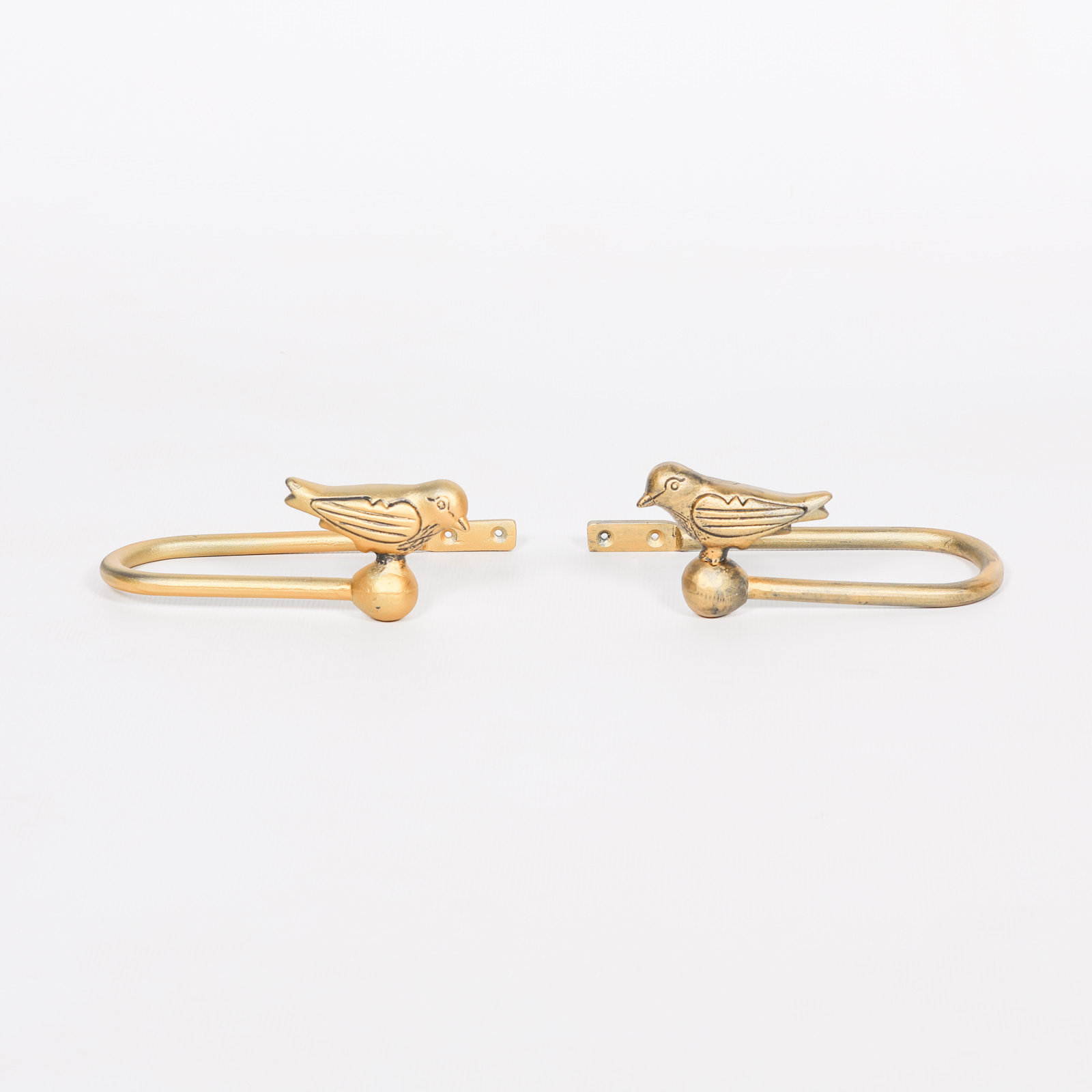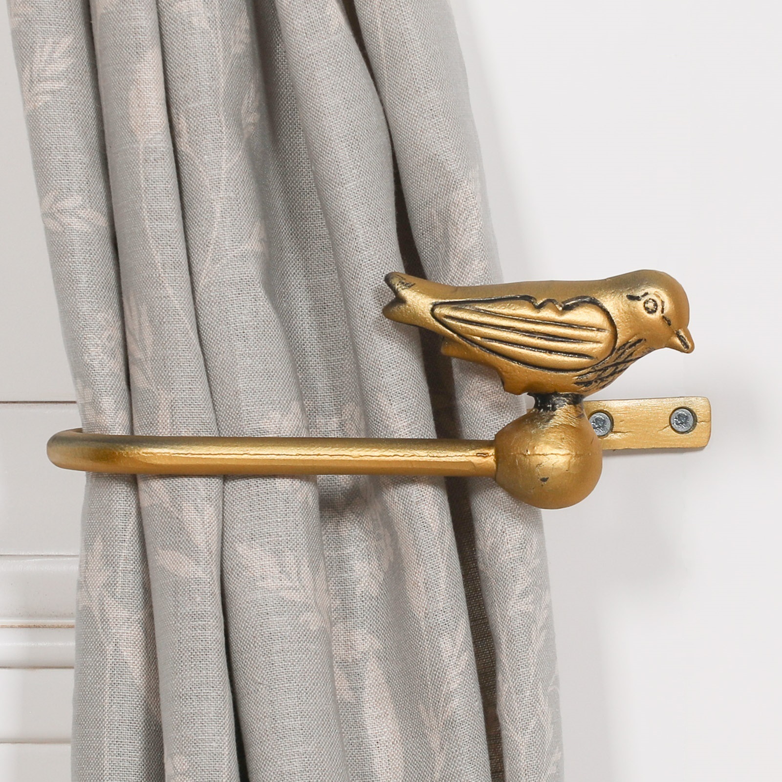 Gold decorative bird curtain holder set handcrafted from cast iron in a vintage style. (sold as a pair left & right)