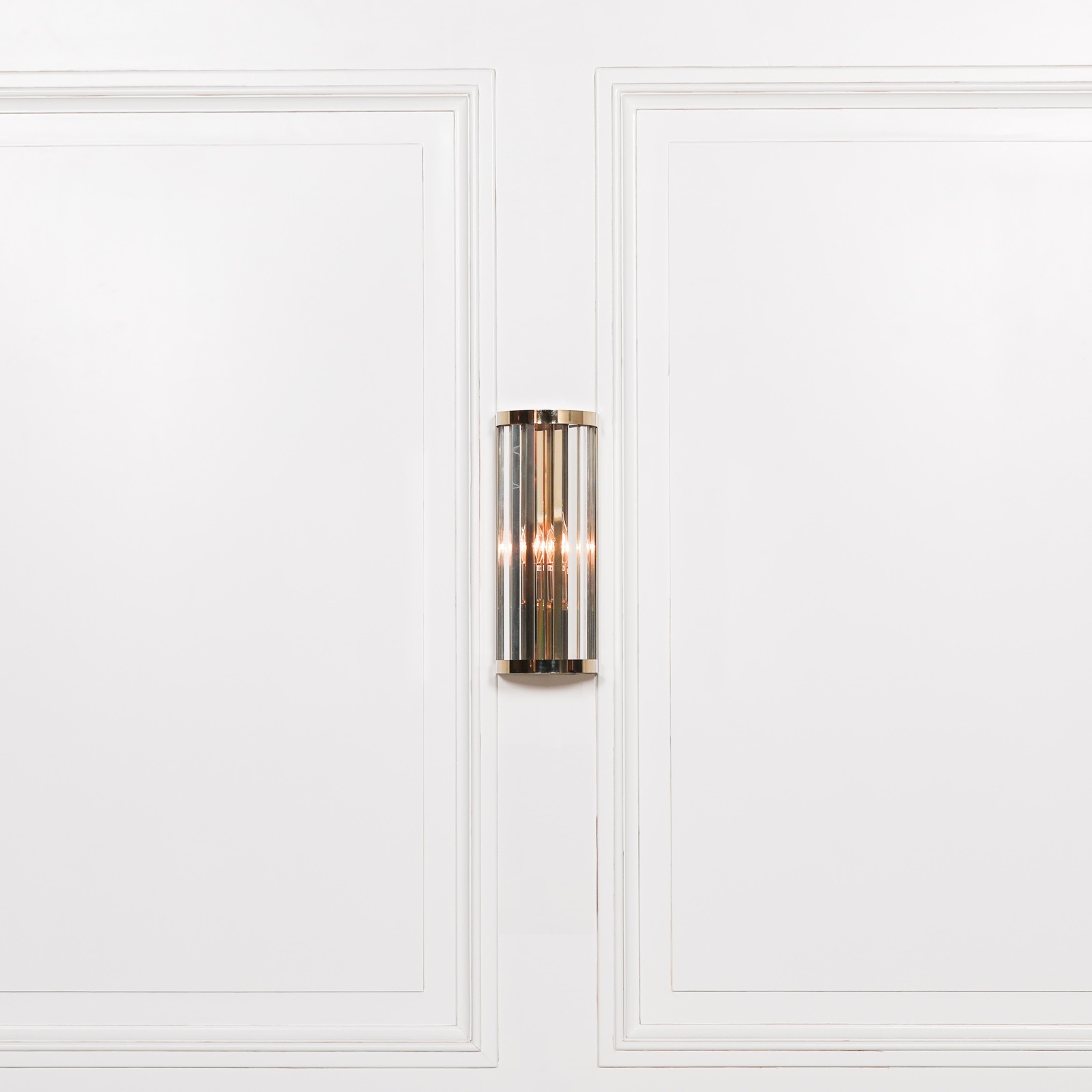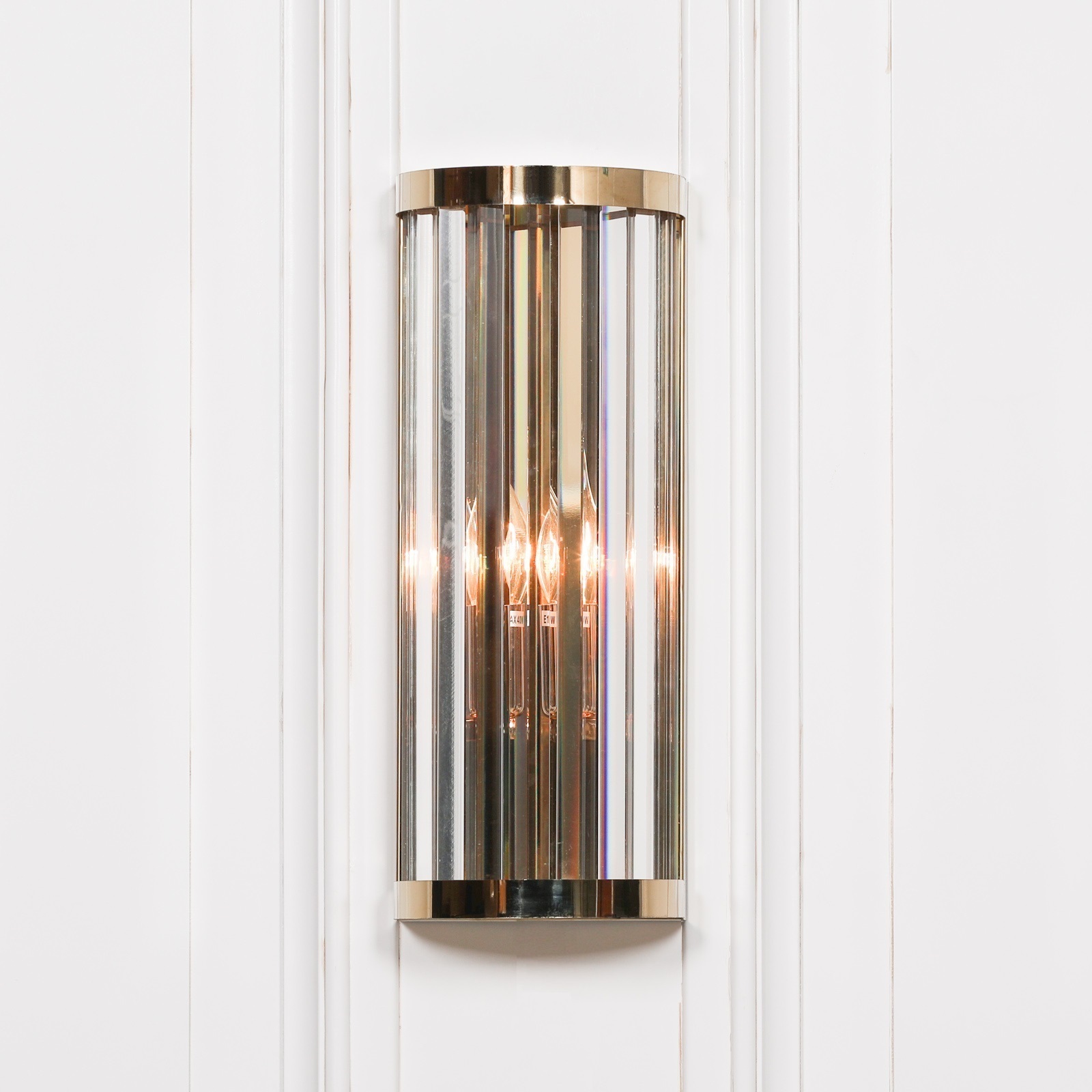 Art deco 39cm wall light with a gold metal frame and vertical clear glass rods.