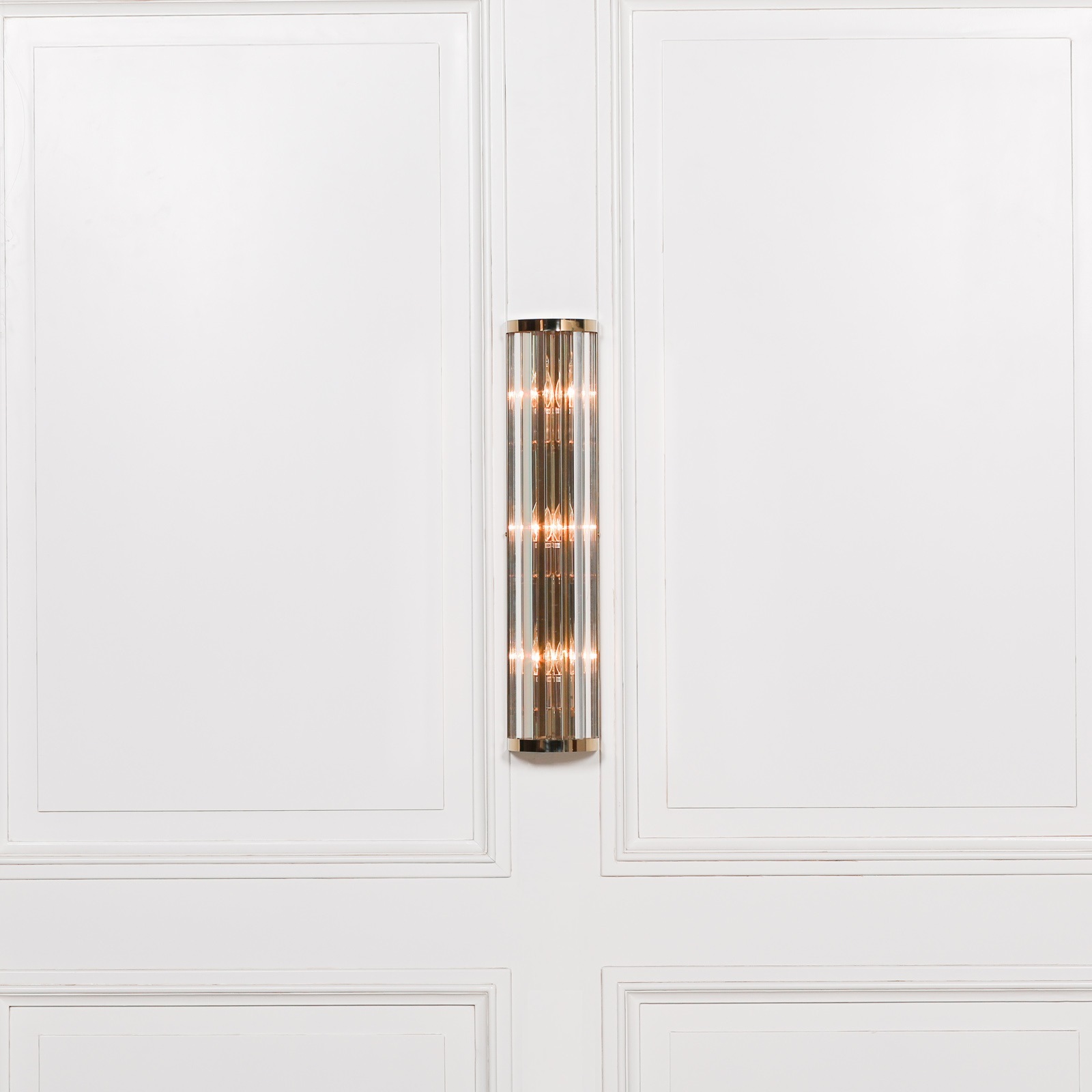 Art deco 71cm wall light with a gold metal frame and vertical clear glass rods.