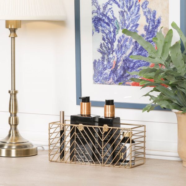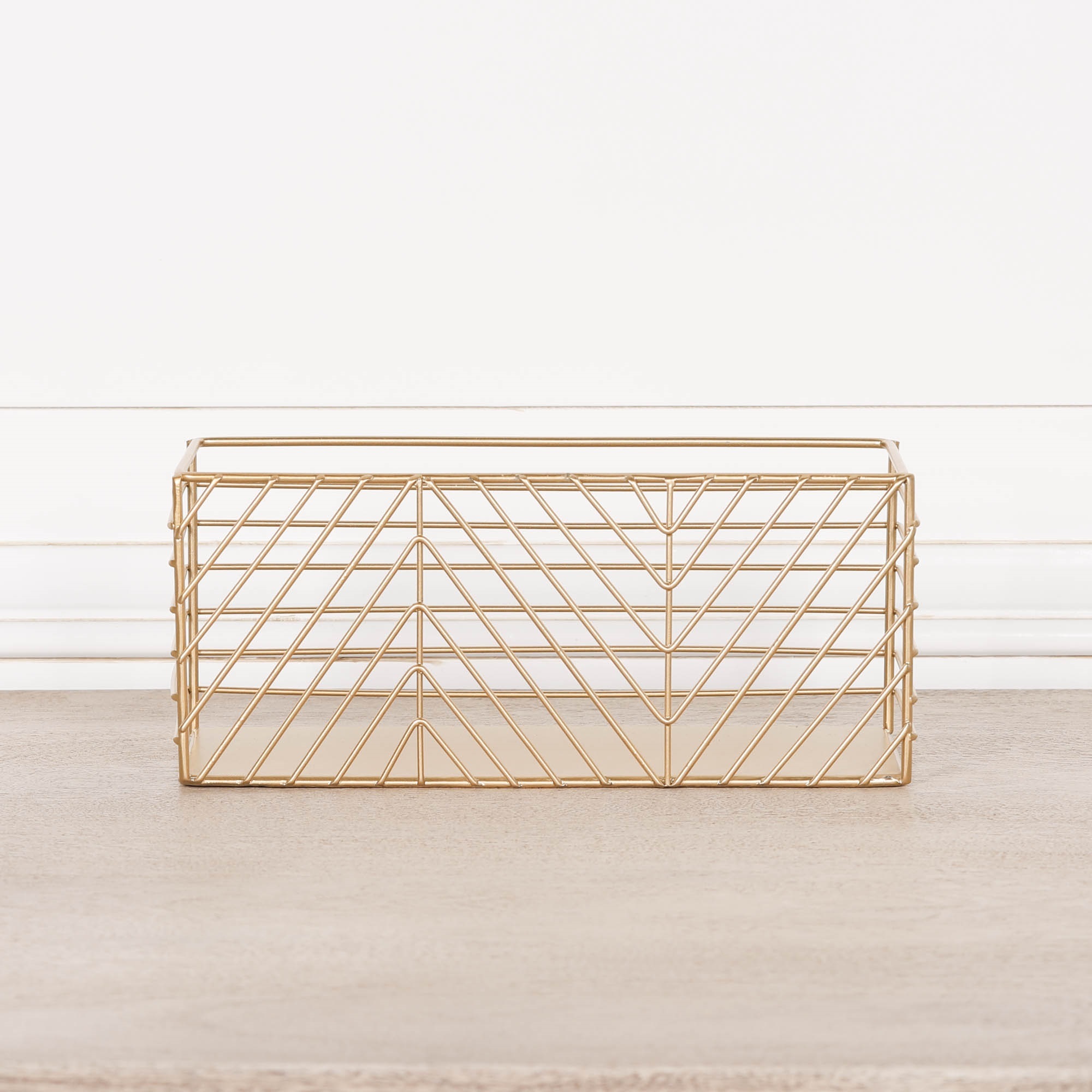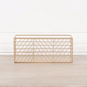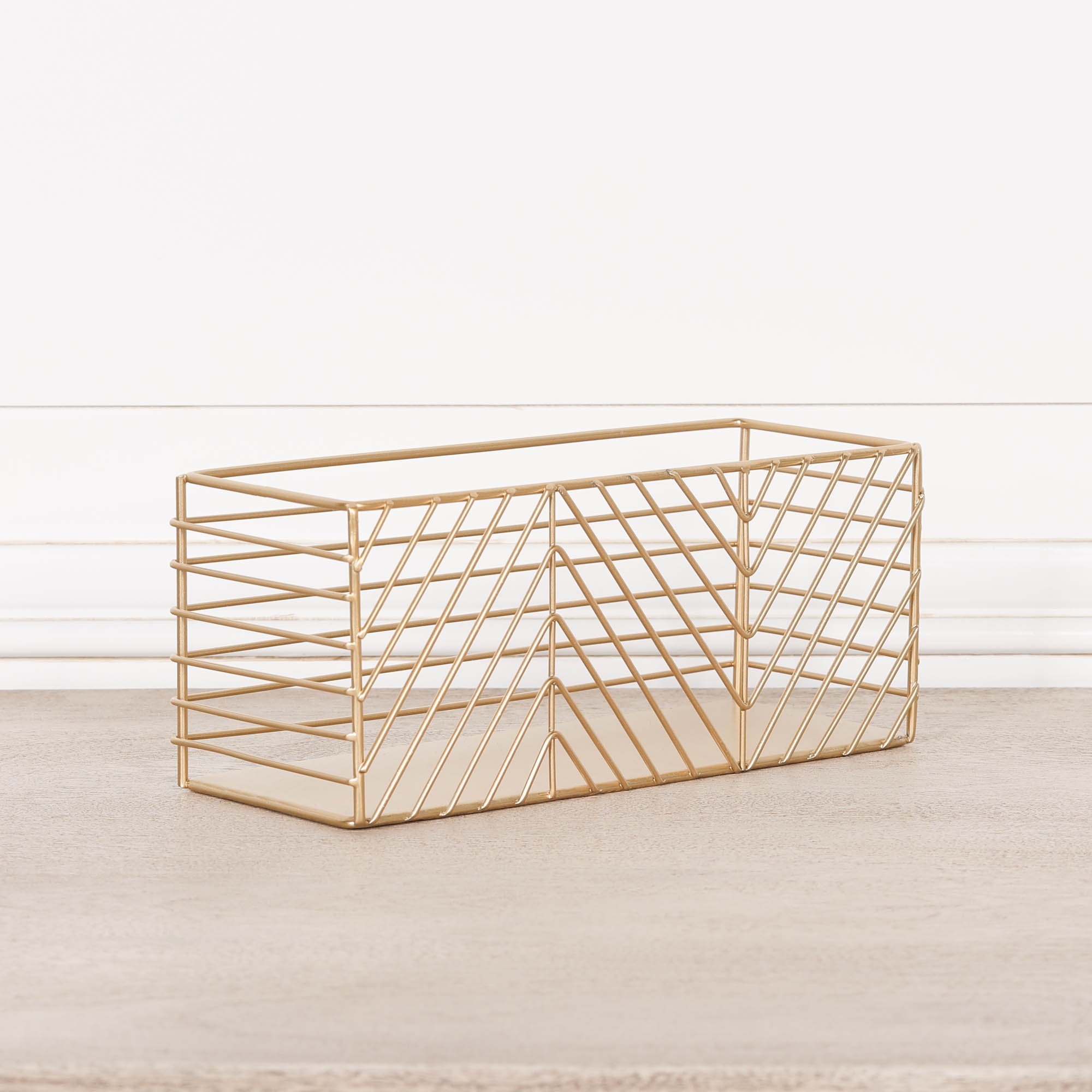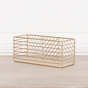Gold painted metal storage basket ideal for storage on desk, kitchen or in bathroom. Ideal use for stationary, makeup brushes, soap, sponges, cotton wool and more!