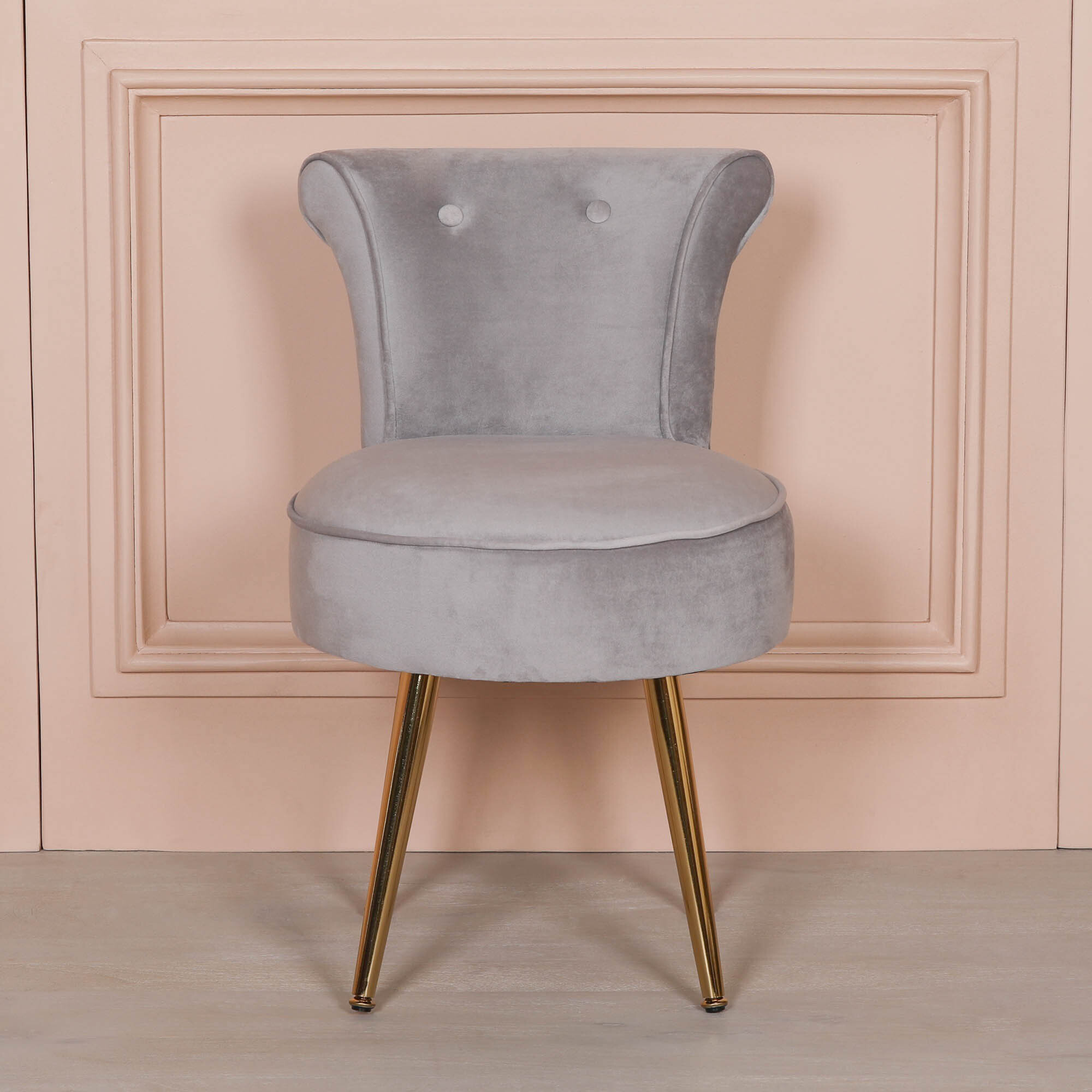 Light grey velvet upholstered stool / bedroom chair with button detailing and metal gold plated legs.