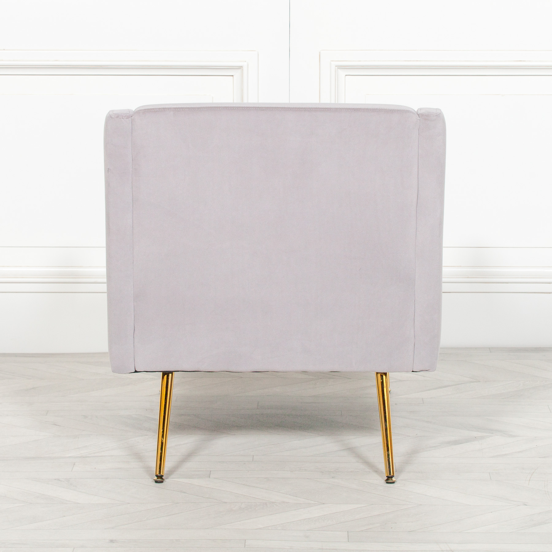 Light grey velvet upholstered sofa chair with short metal gold plated legs and sloped arms.