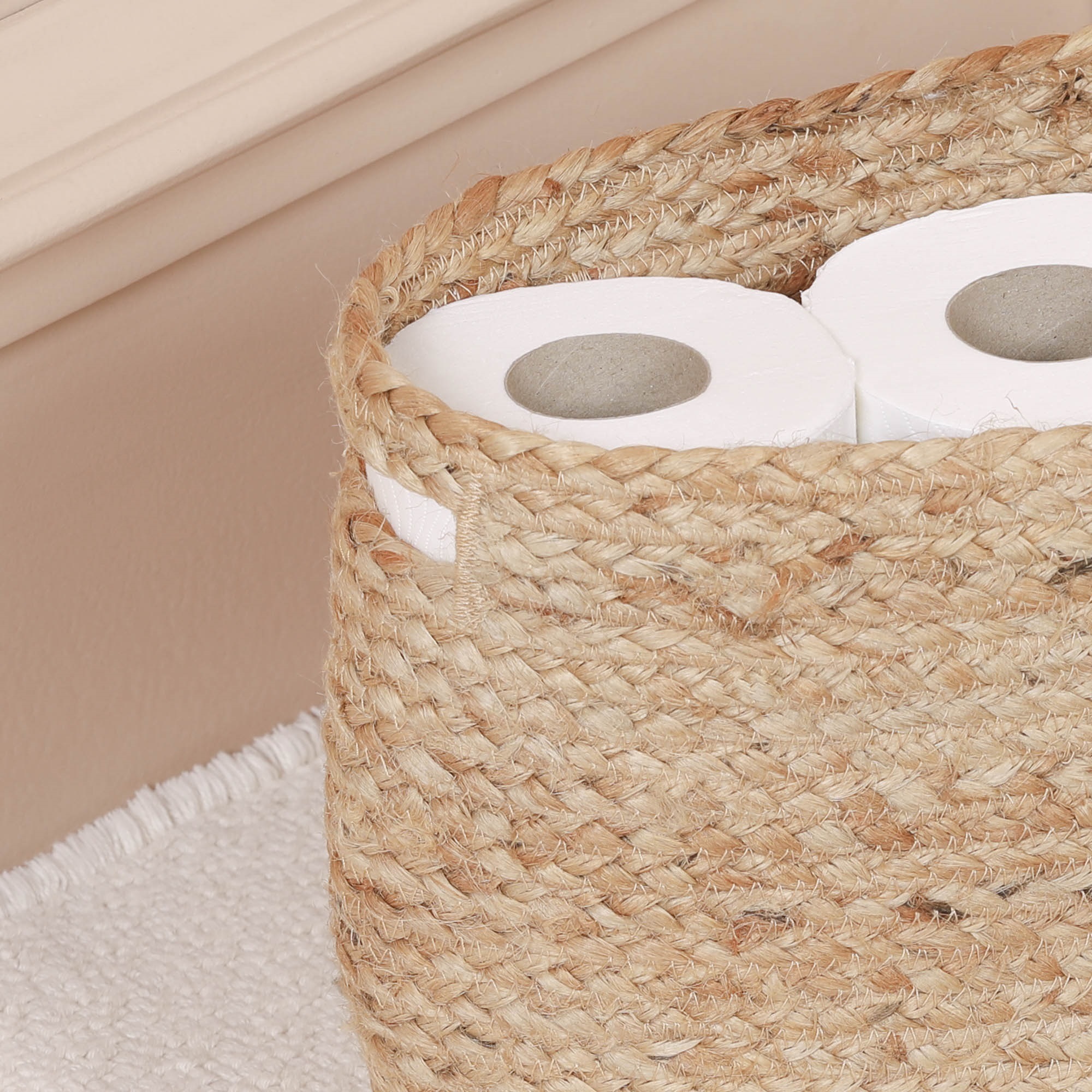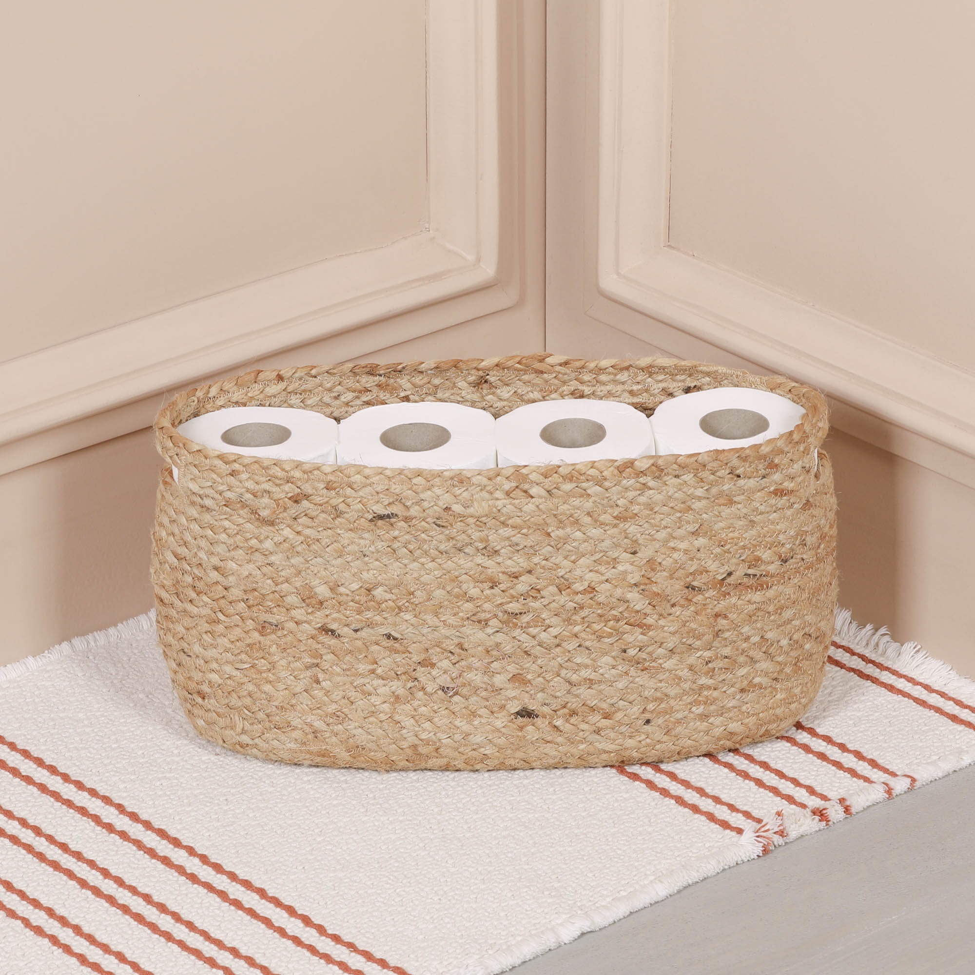 Jute Toilet Roll Storage Basket. Made from strong weaved jute rope material sewed in to a stylish design.