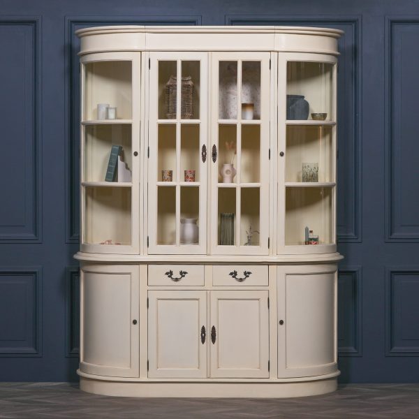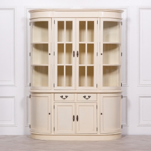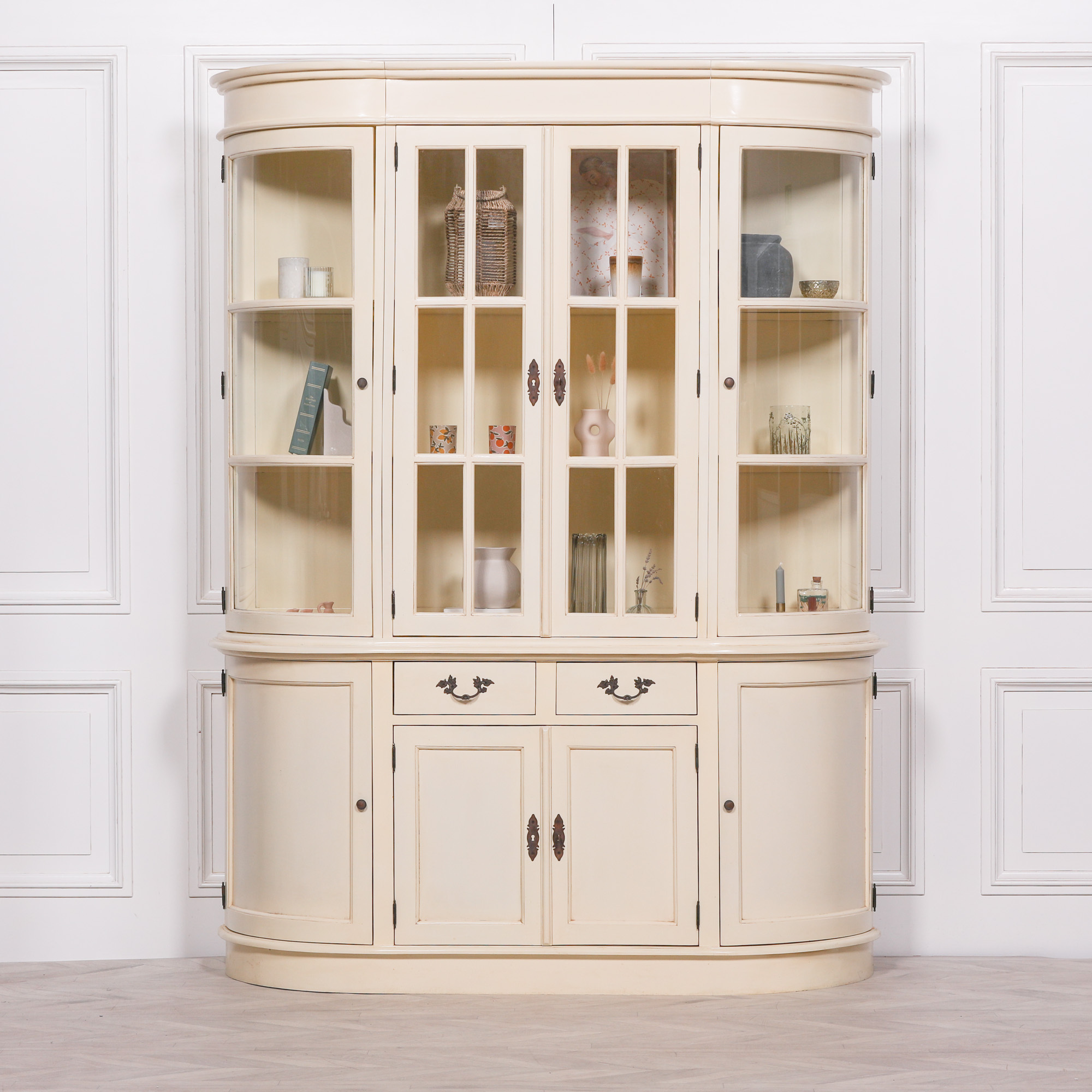 Large dresser display cabinet handcrafted with mahogany wood in an aged cream finish to create a vintage style, features include curved edges and glass panes.