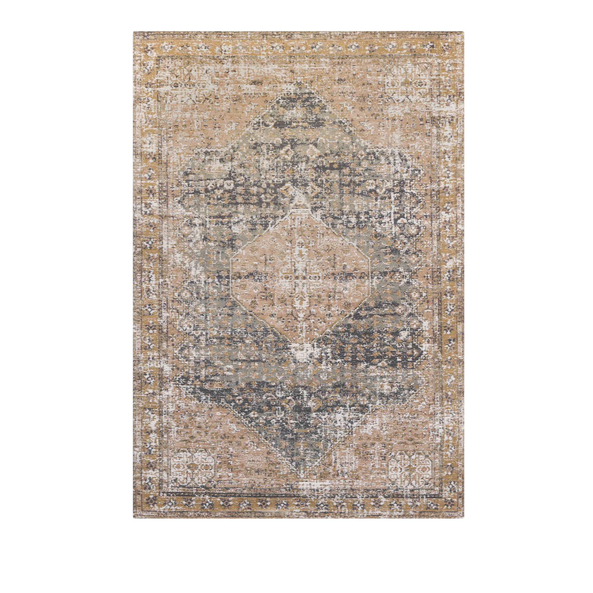 Marine Pink Chenille Rug made from cotton chenille expertly hand woven using a Jacquard woven technique. The Chenille rug has a beautiful Persian patterning in a distressed faded style with subtle colours of coral blues, yellows, and greys against the back drop of the natural chenille cotton.