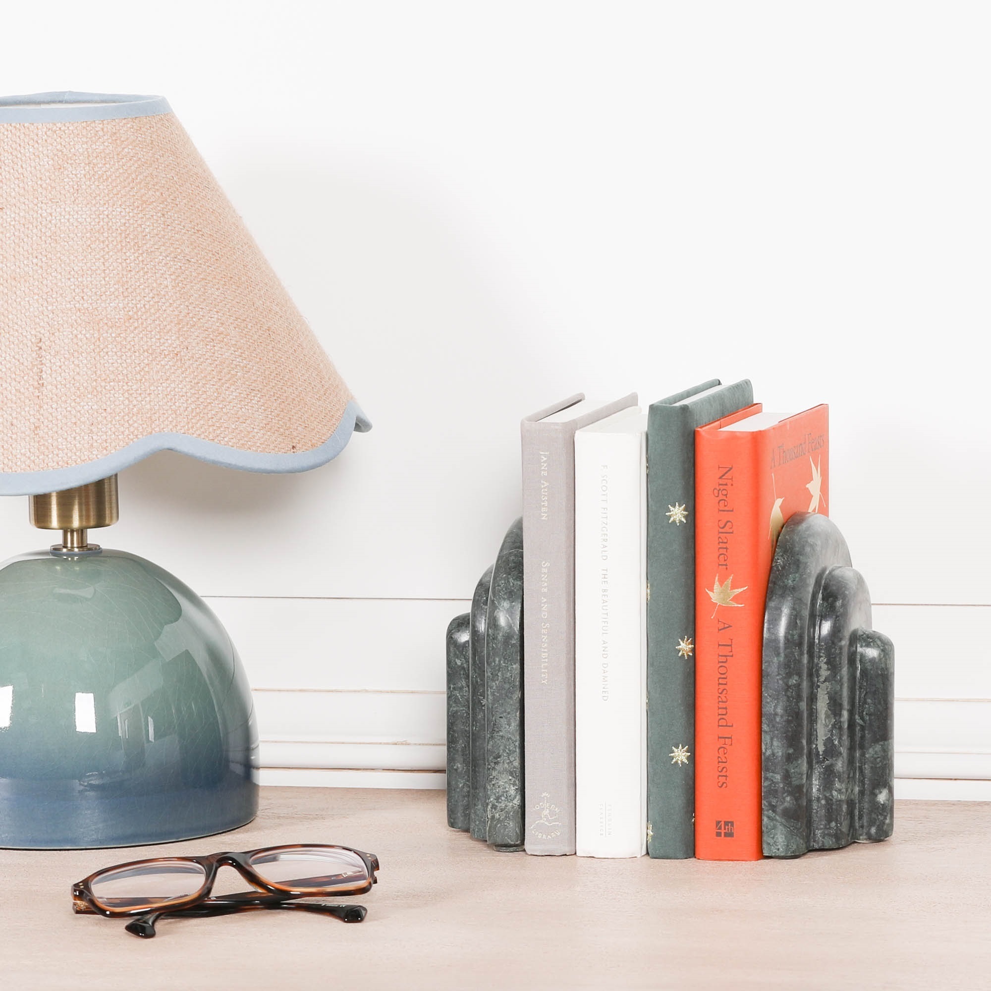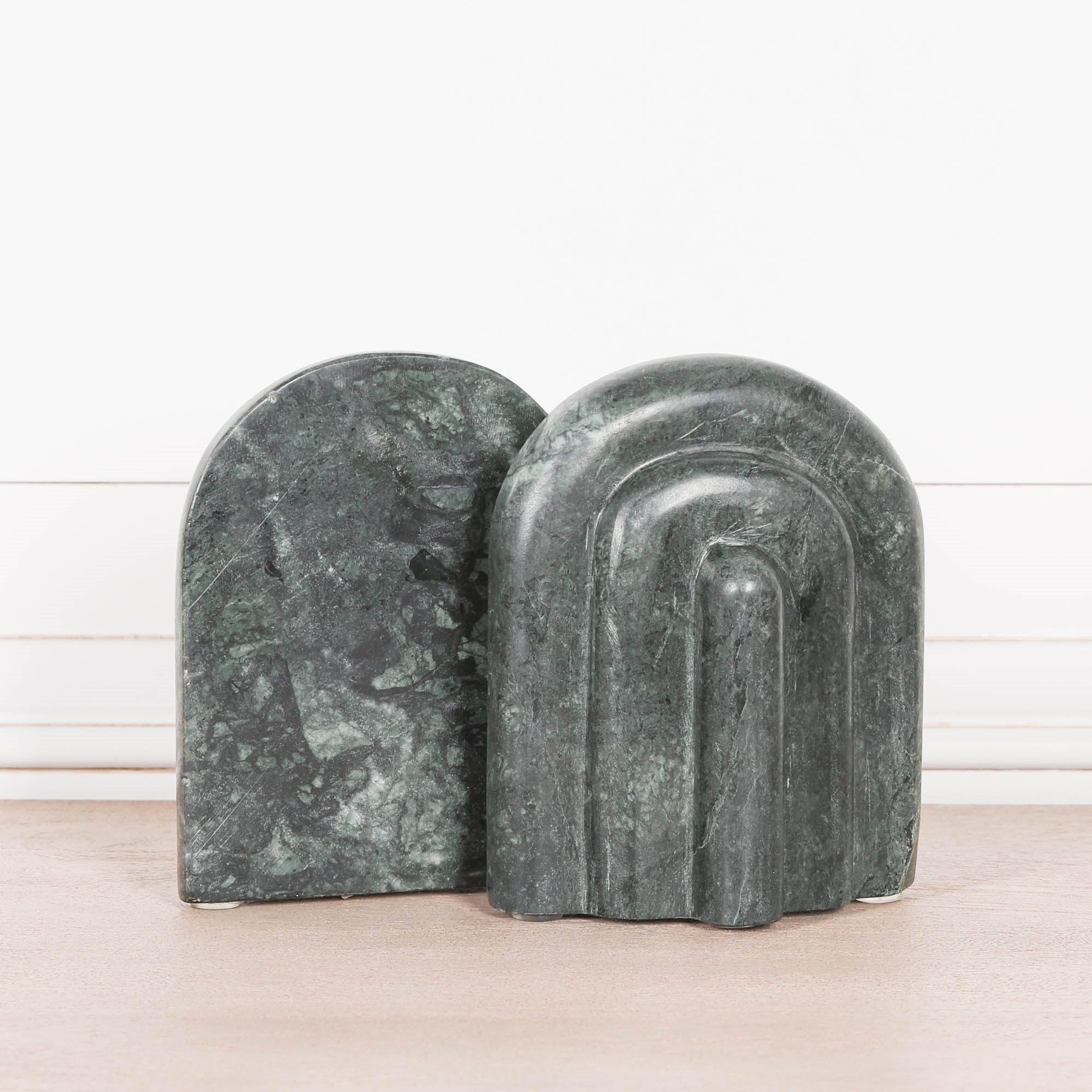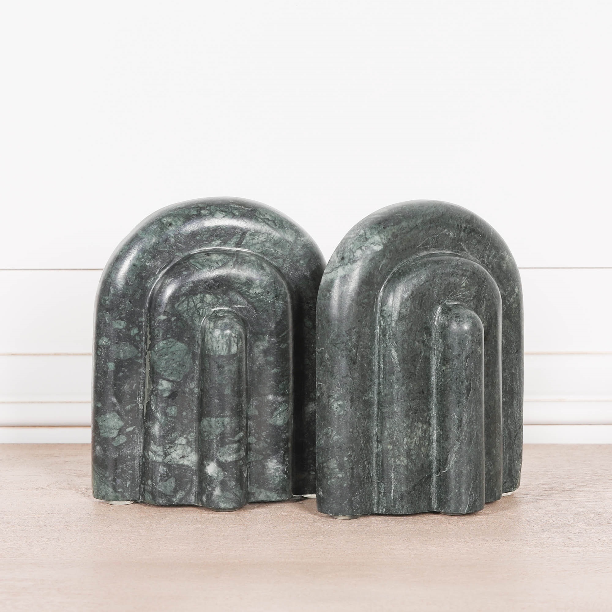 A set of natural green marble bookends. Designed to hold books in style! The natural marble provides good heavy weight to hold up stacked books. The bookends have silicone feet applied for improved grip.