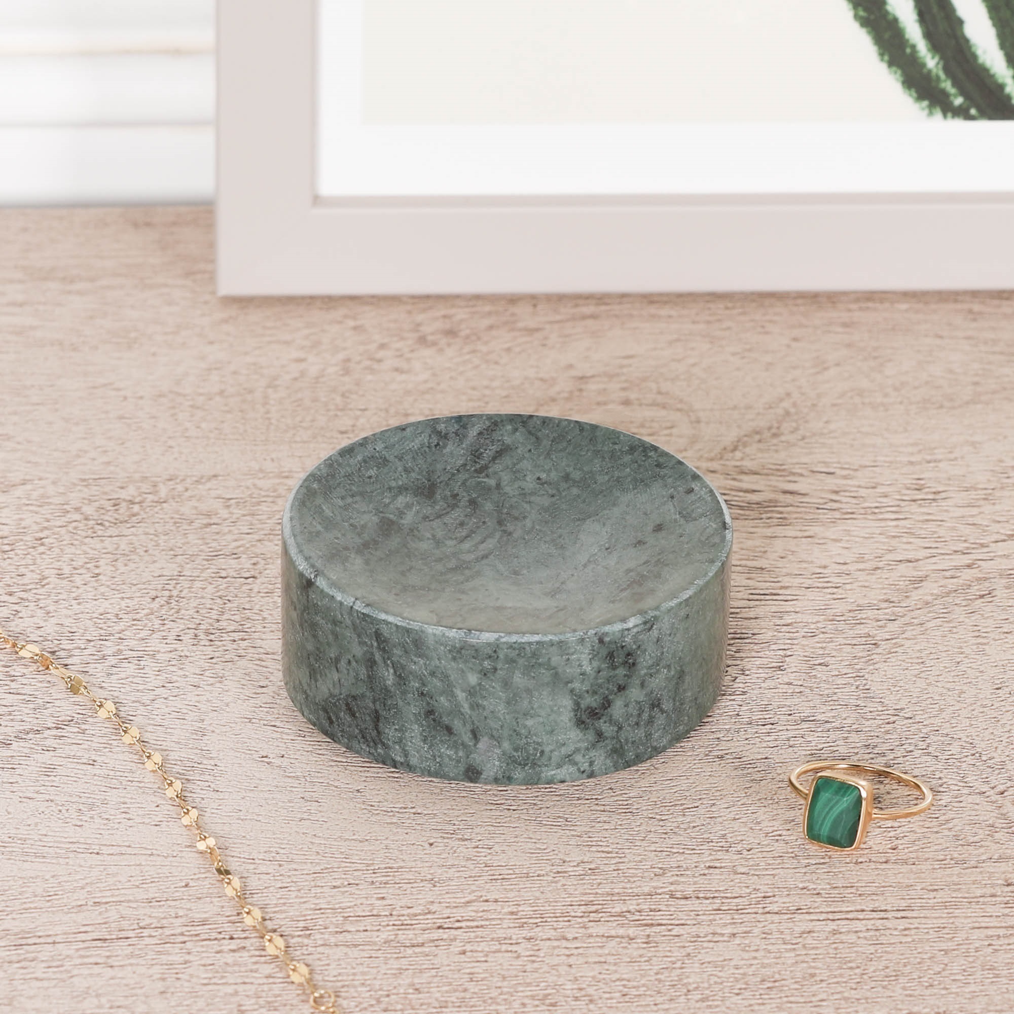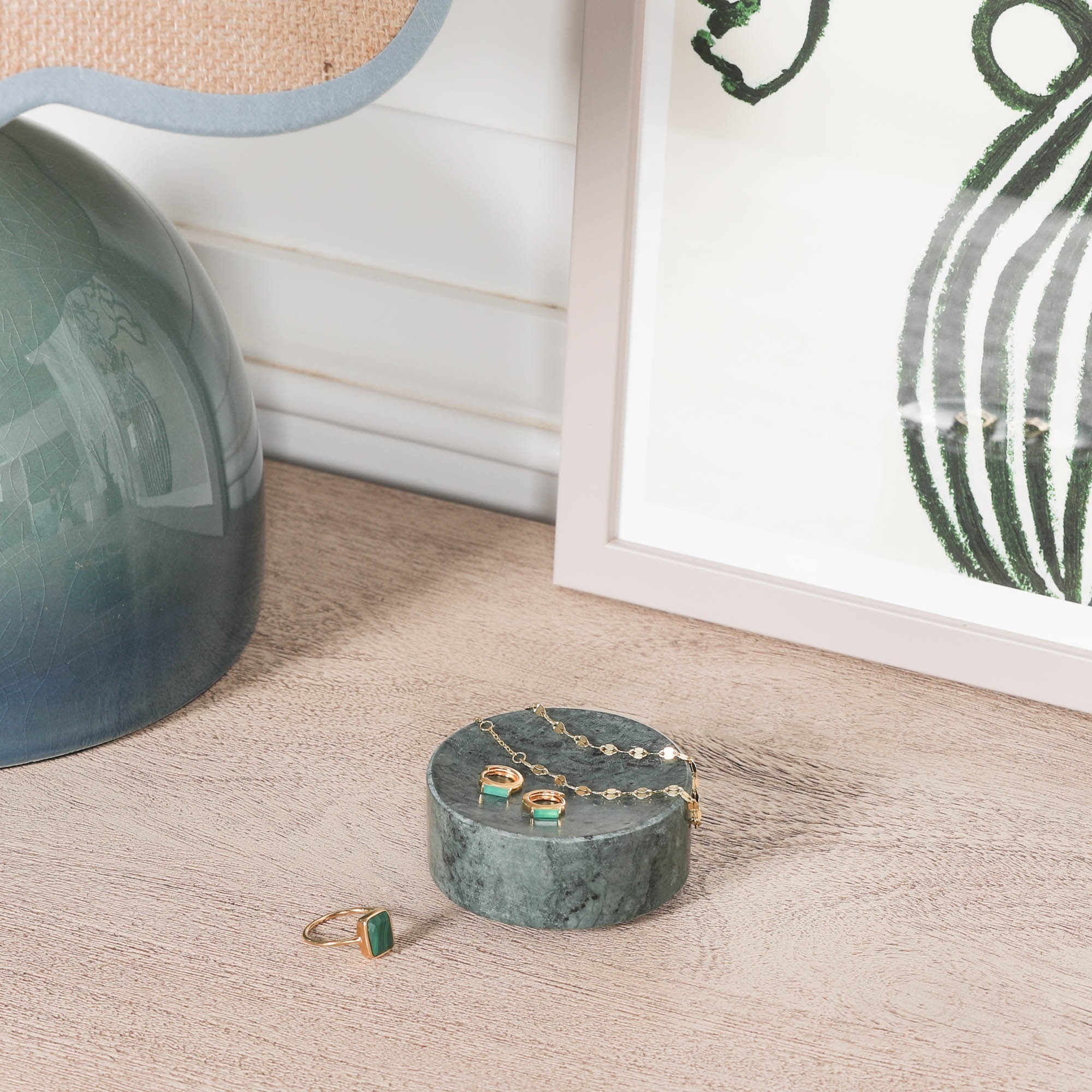 Natural green marble jewellery holder. The storage unit is ideal for safe storage of rings, earrings, bracelets and necklaces. The product has a concaved top designed to safely hold and store your jewellery without them rolling away or sliding off the side.