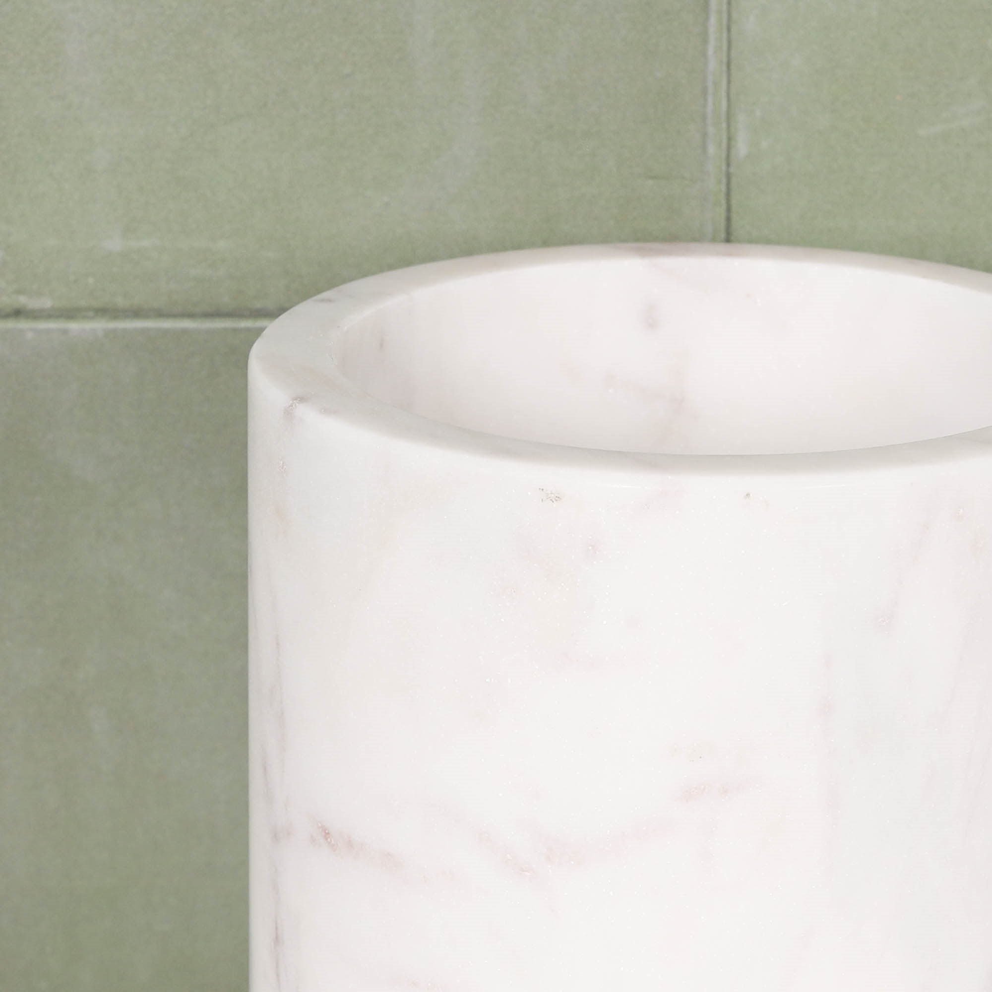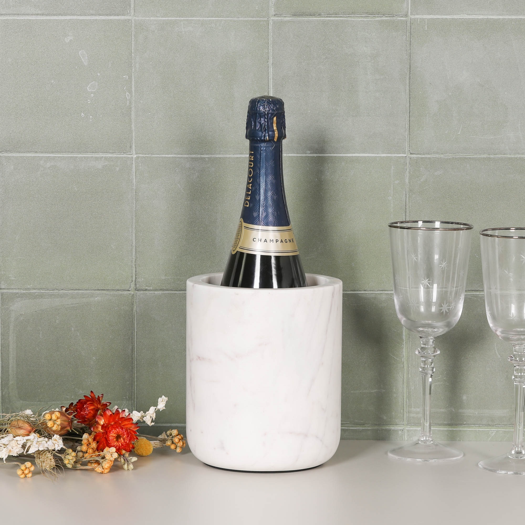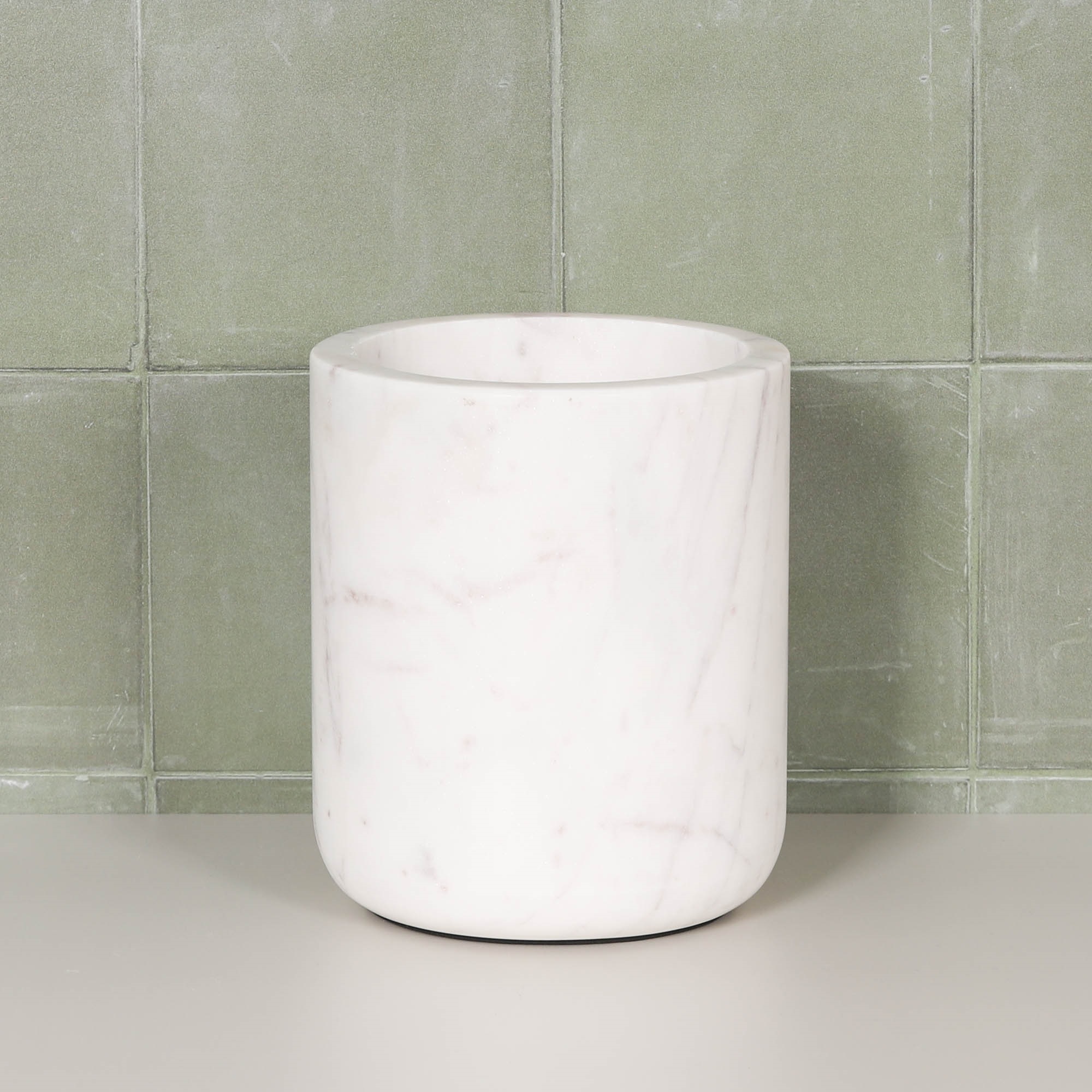 Natural white marble utensil holder. The storage unit is ideal for storage of kitchen utensils or can it be used for general storage of items including wine bottles. (utensils and champagne not included)