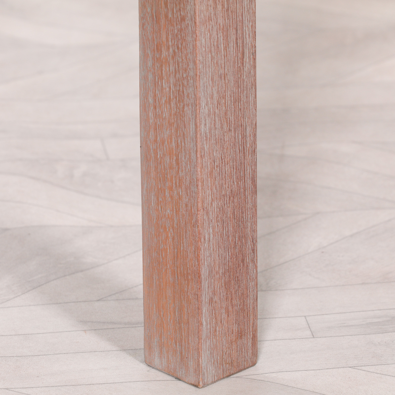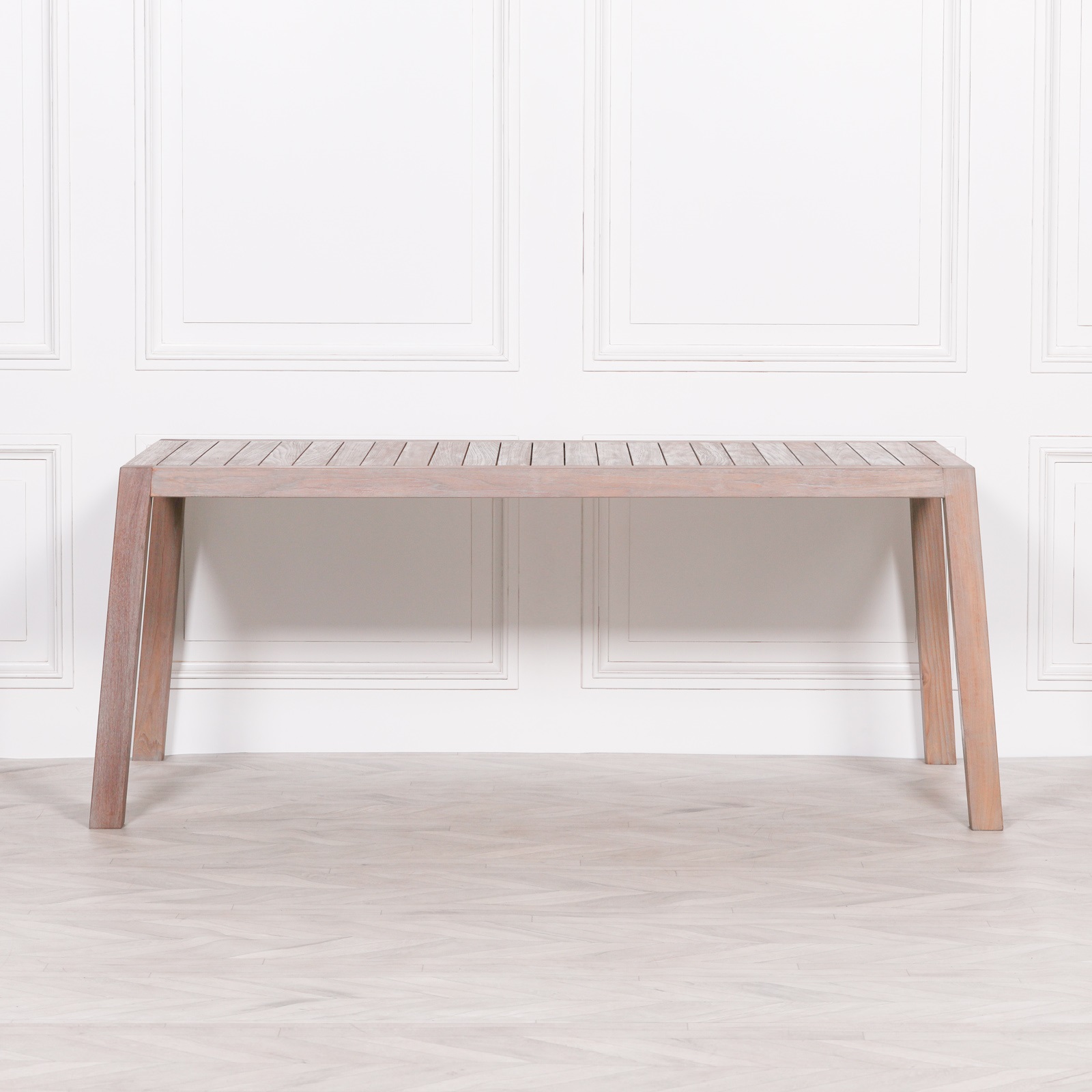 Outdoor 180cm rectangular garden dining table crafted from grade A teak wood in a light rustic finish with a slatted surface and tapered legs. Styled with Iron Frame Off White/Cream Distressed Garden Dining Chairs.