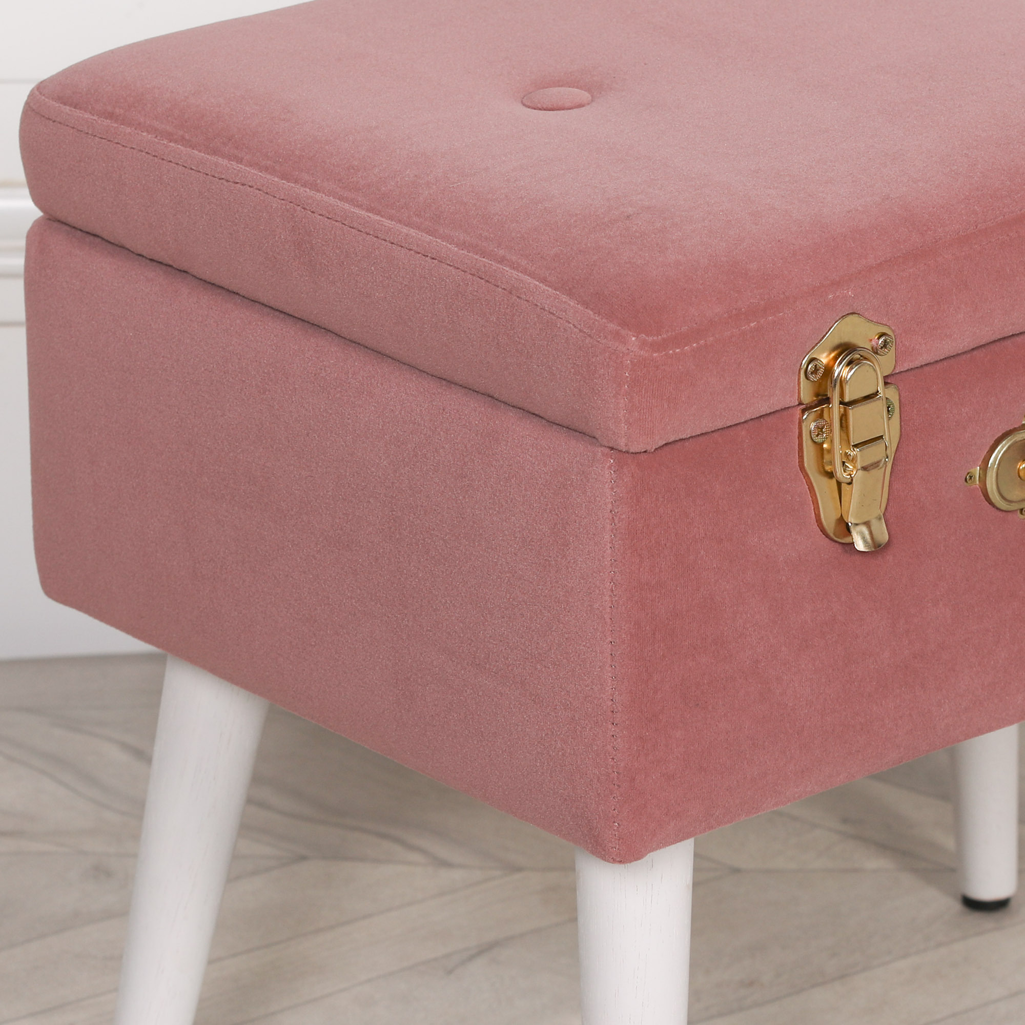 Pink velvet upholstered suitcase stool with a storage compartment, button detailing, and white hand-painted wooden legs.