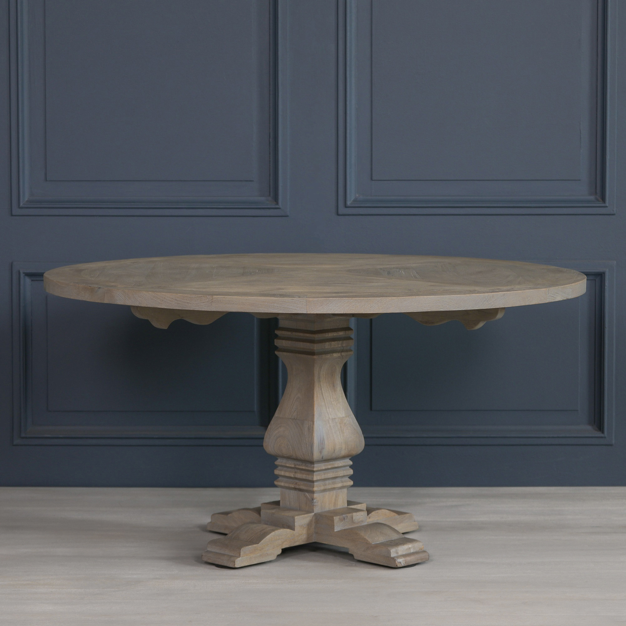 Round pedestal dining table hand-crafted from white cedar in a rustic finish with intricately carved details along the base and splayed feet. Styled with Light Wooden Louis Upholstered Dining Chairs.
