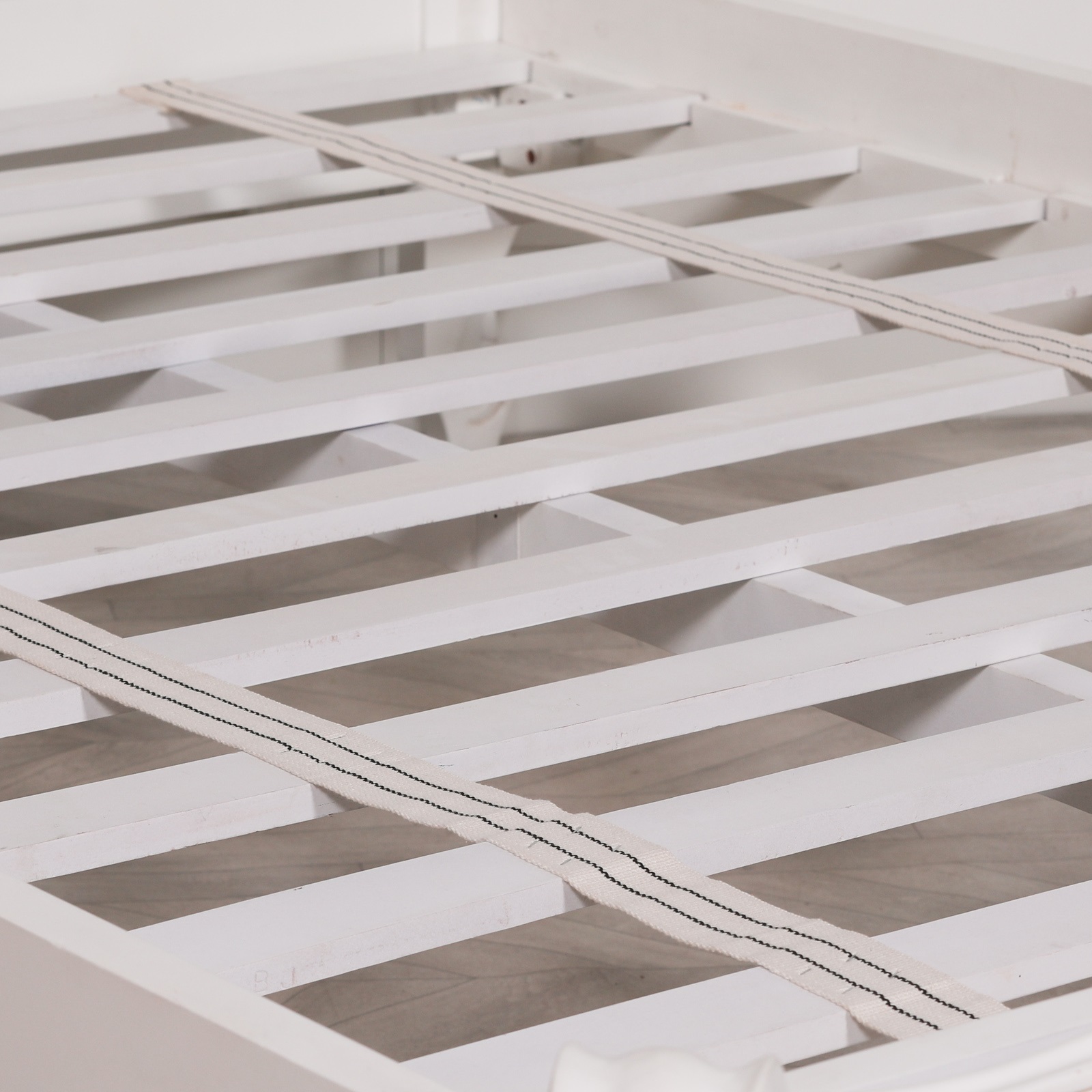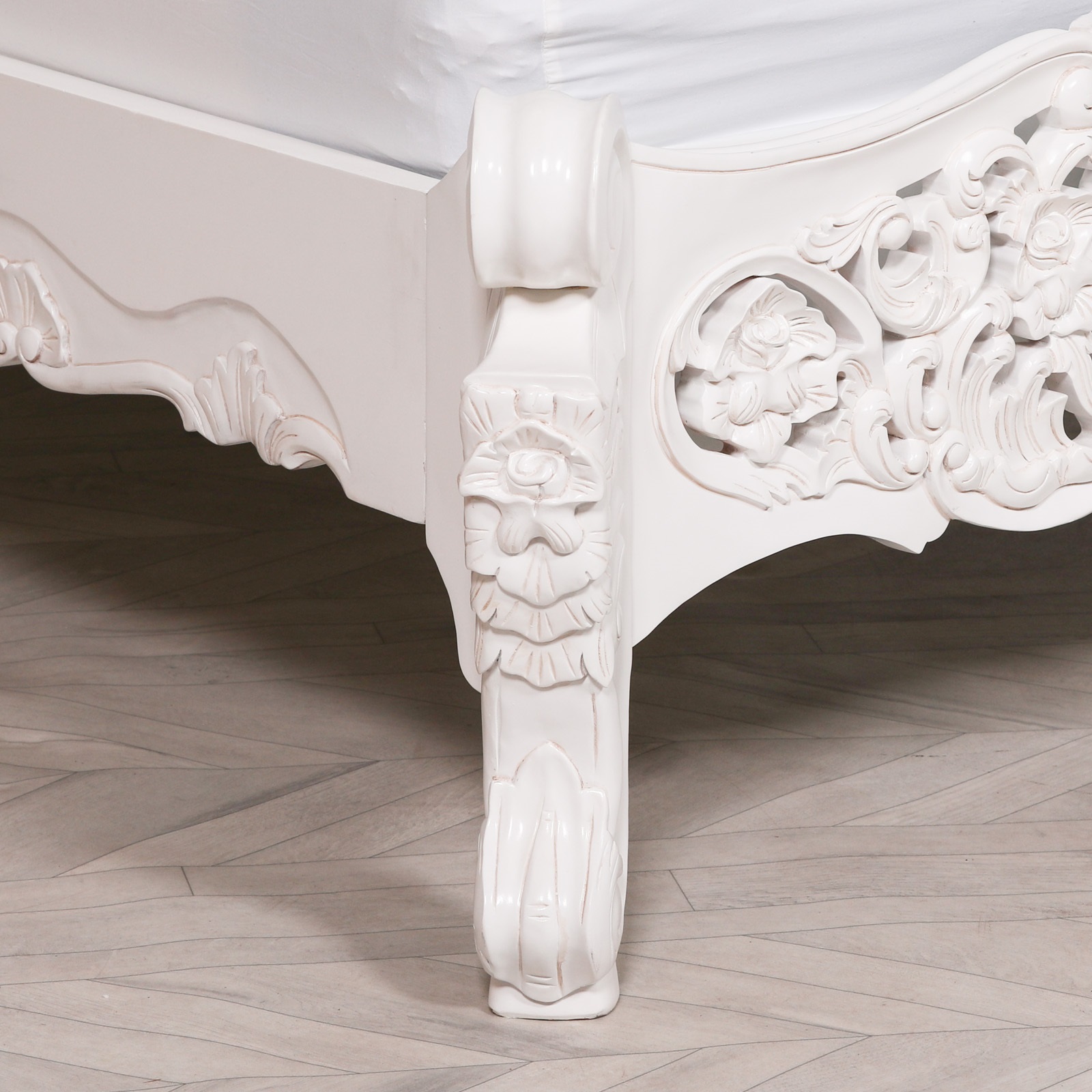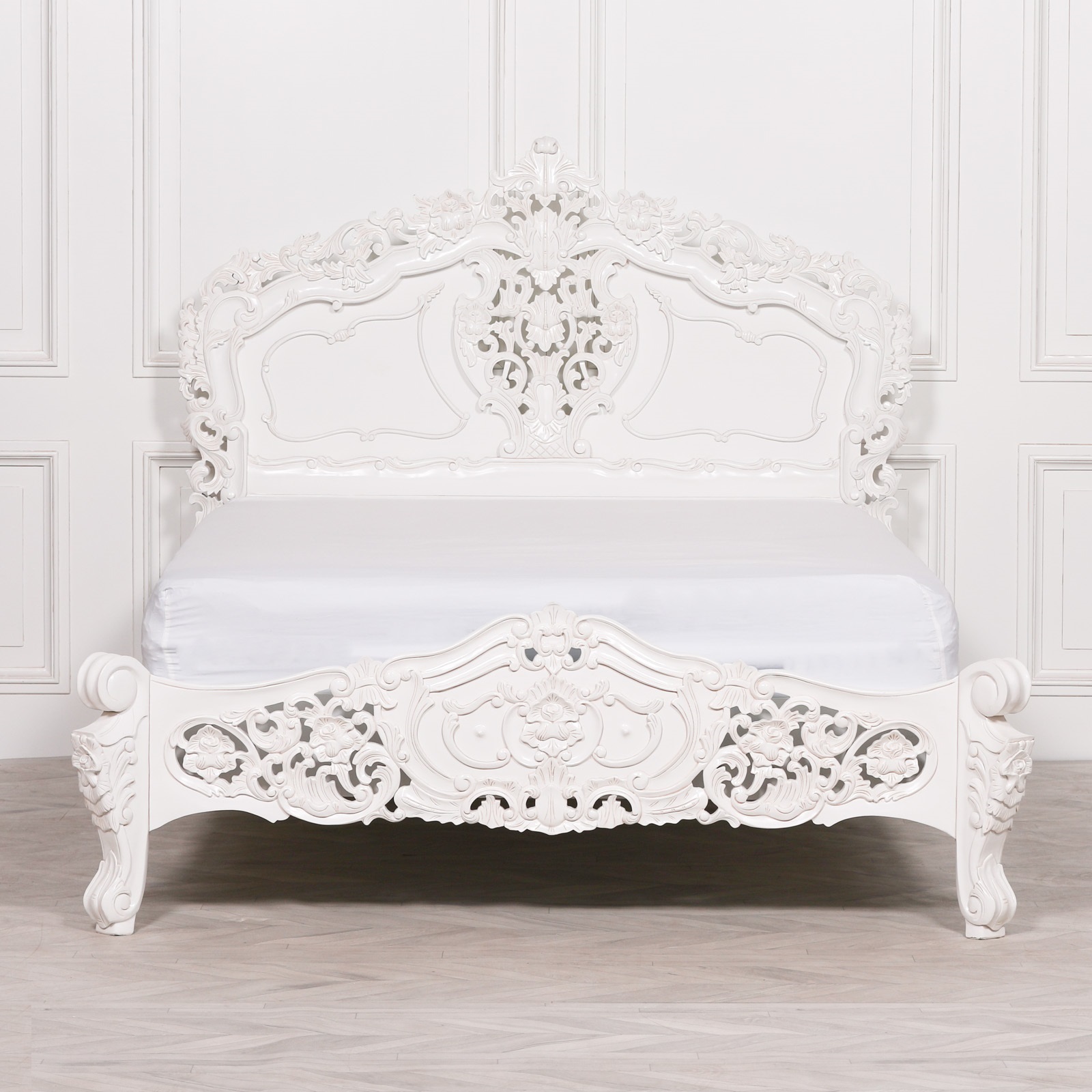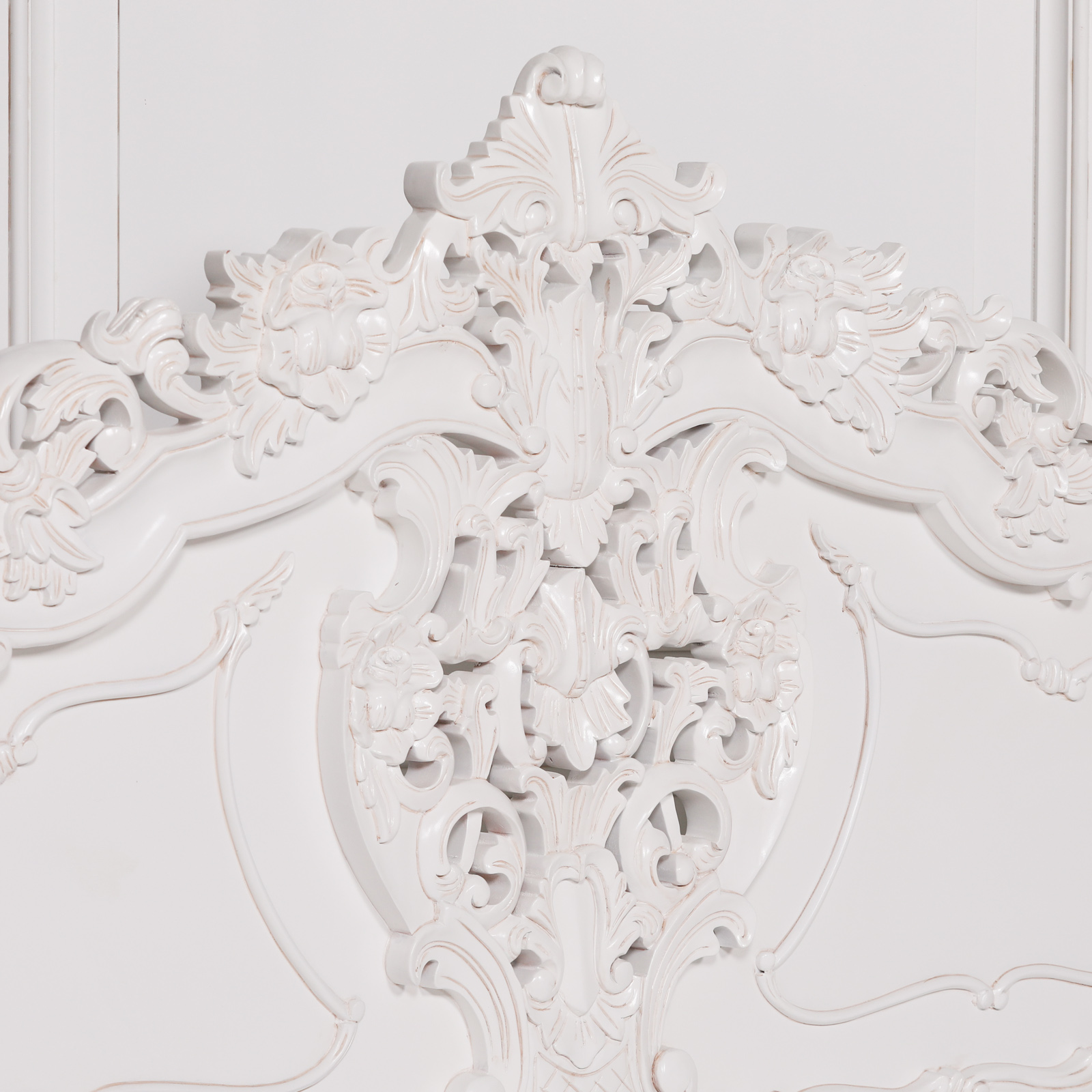 Off white painted 5ft king size bed in a Rococo design hand carved from mahogany wood. Curved intricate details in the bed panels and feet.
