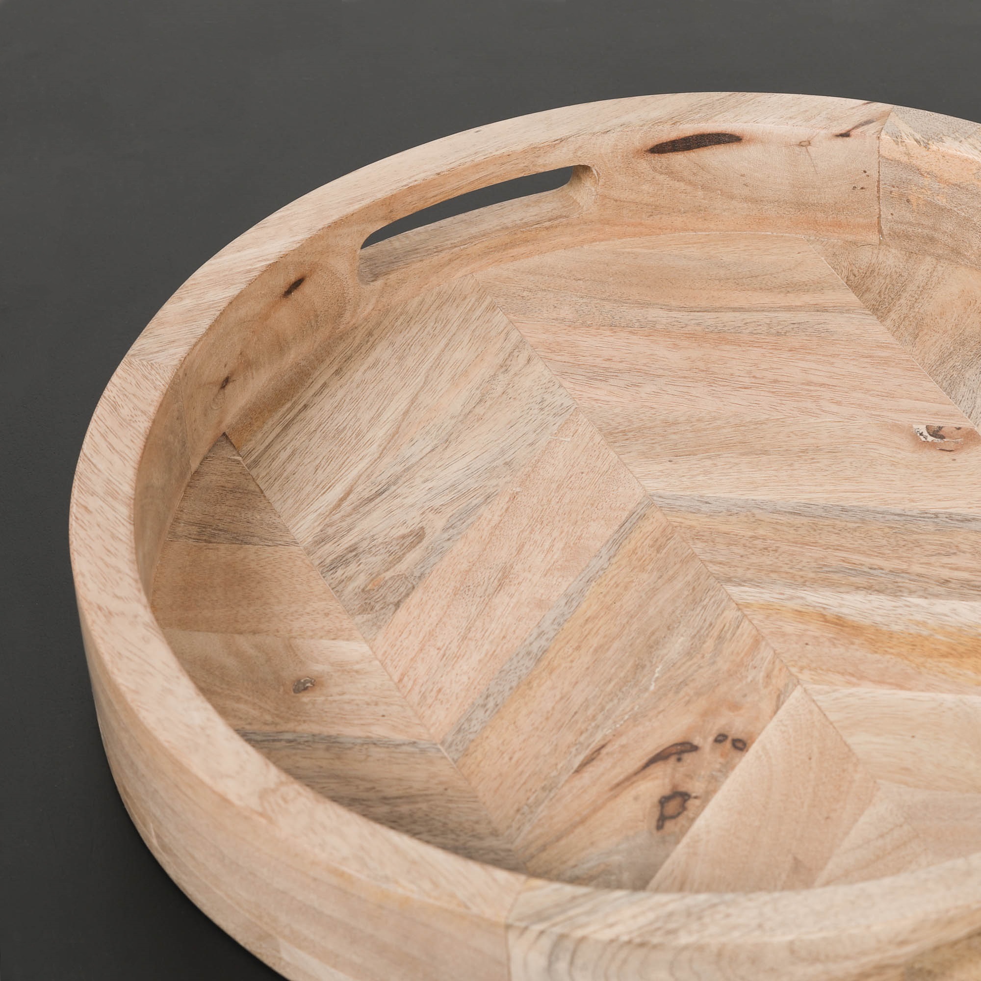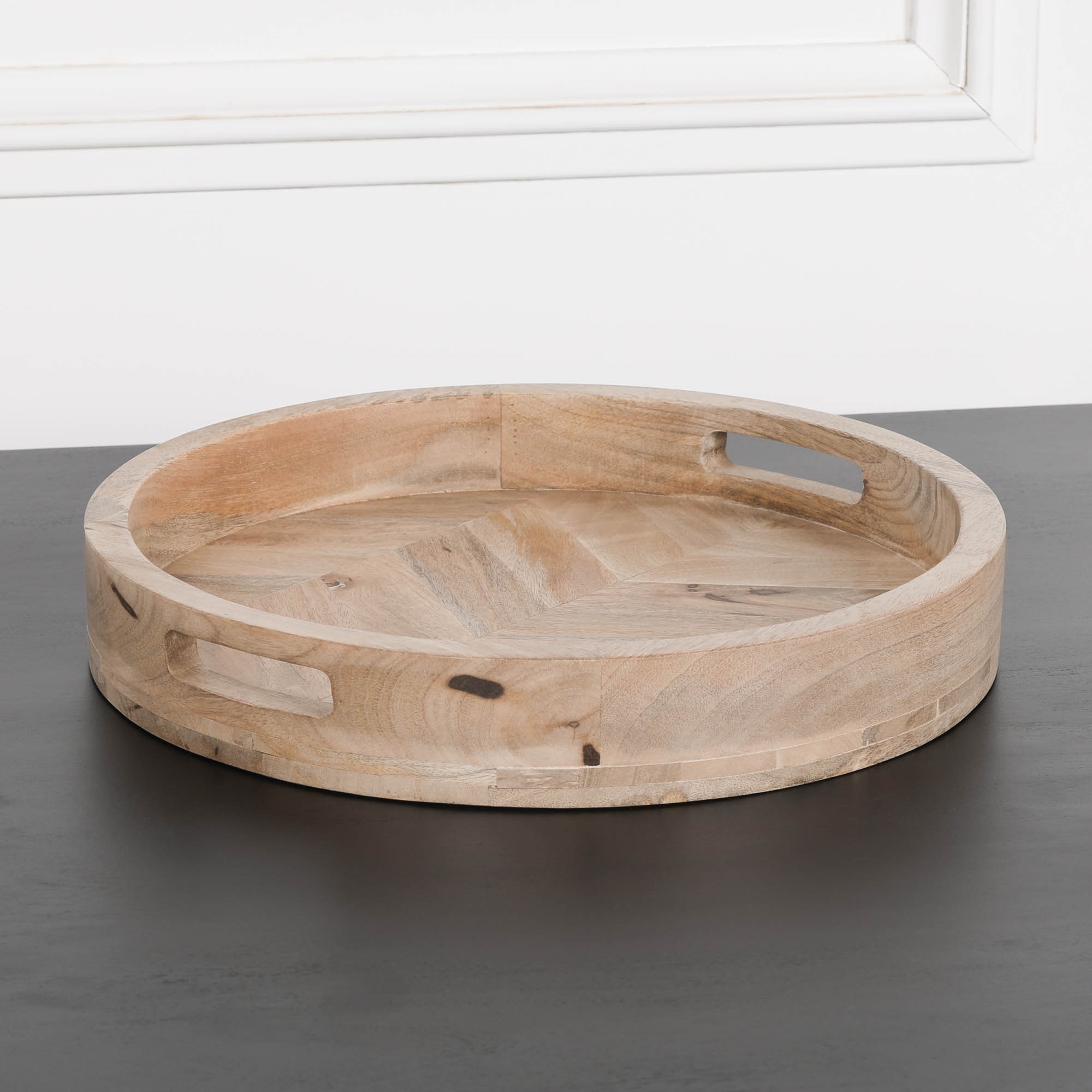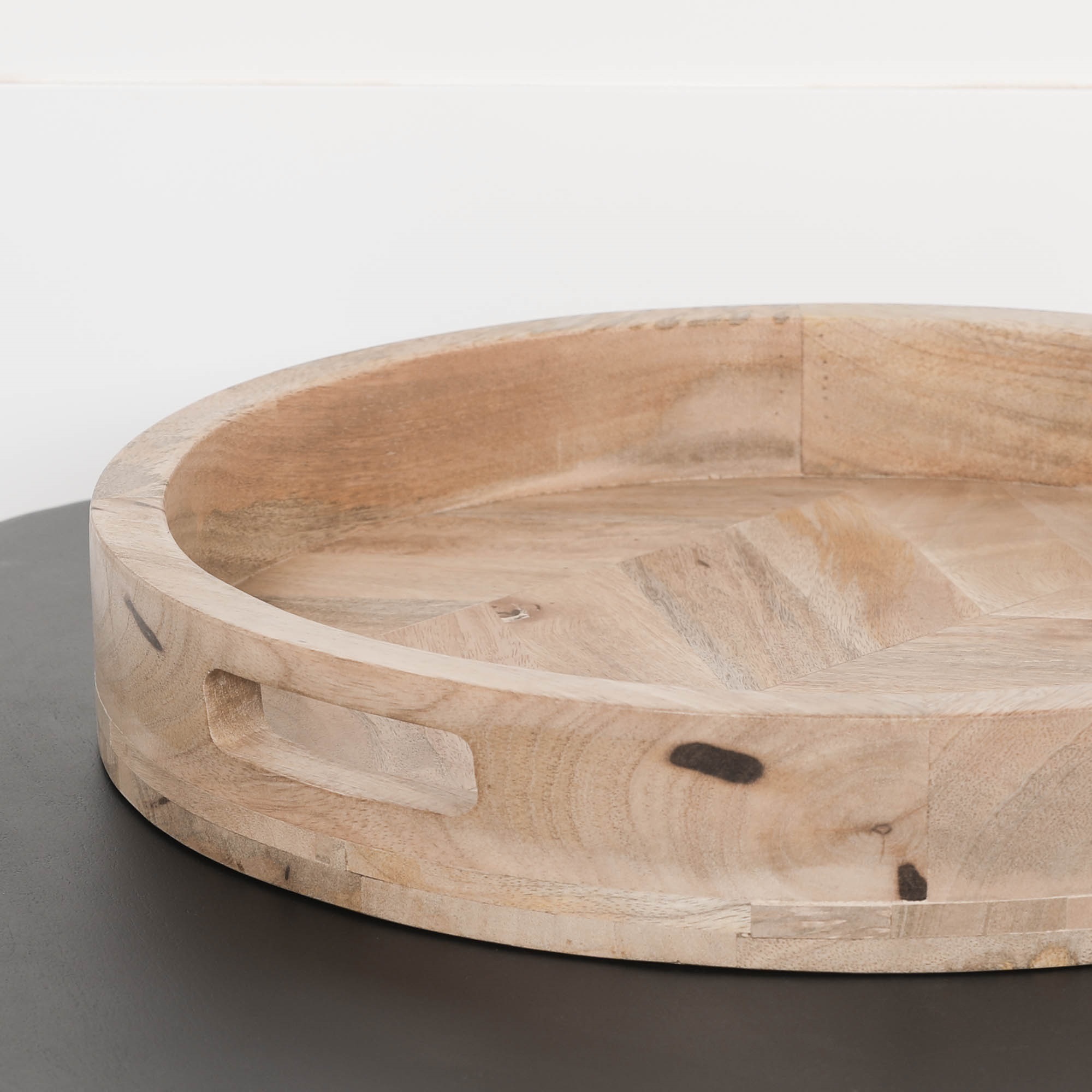 Wooden mango 40cm tray with parquet inlay. The tray is ideal for use as a drinks holder, candle holder, storage tray for makeup or general storage of items.