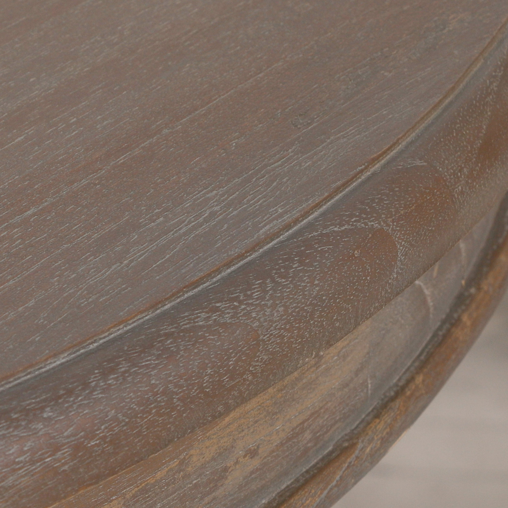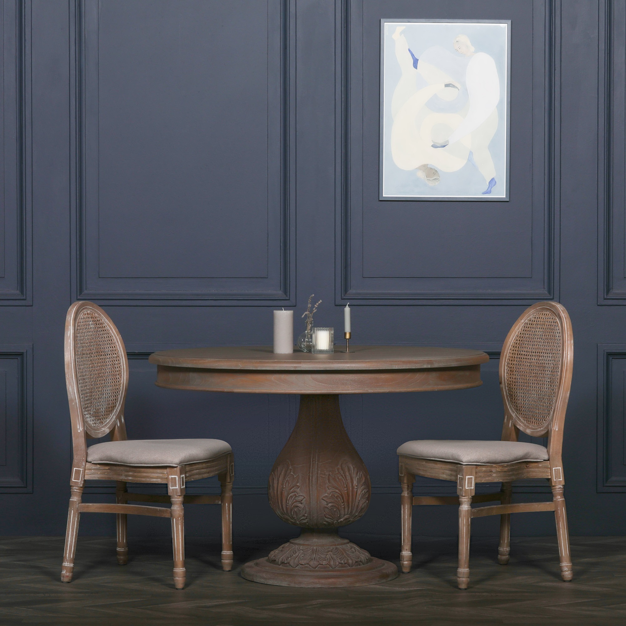 Round 120cm pedestal acorn dining table handcrafted from reclaimed cedar wood in a dark rustic finish with an intricately hand-carved base. Styled with Wooden Louis Upholstered Dining Chairs.