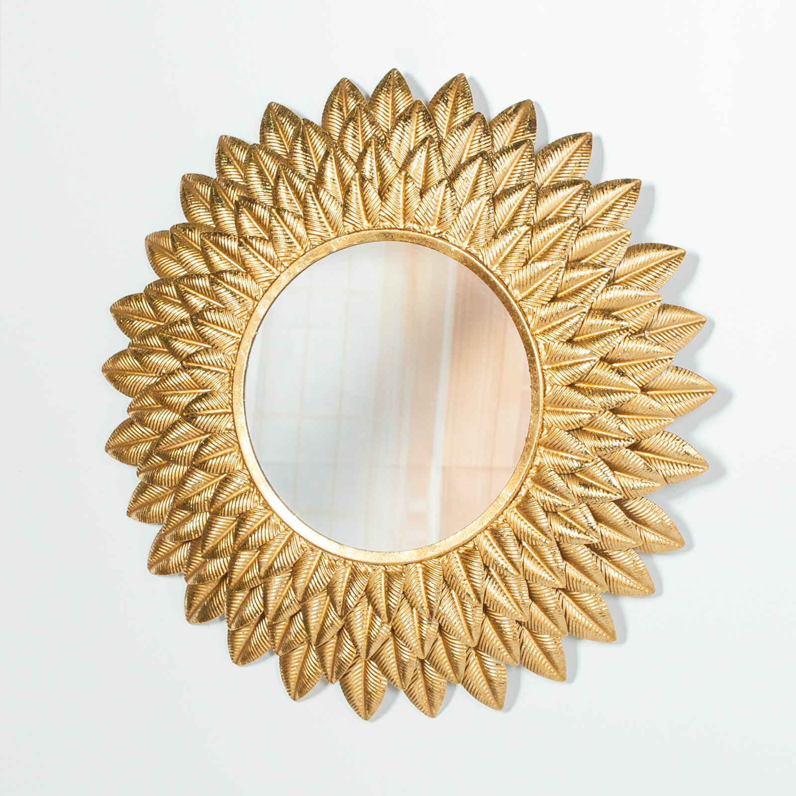 Round 48cm accent wall mirror handcrafted from metal in a gold finish to create an ornate sunflower design.