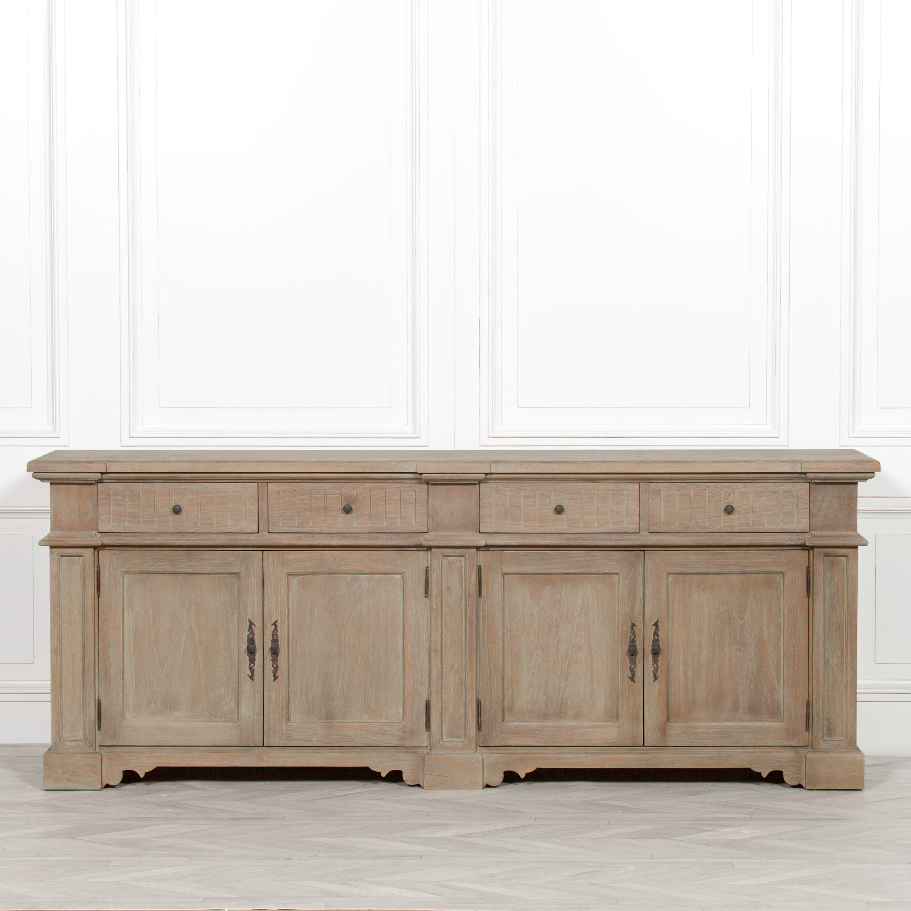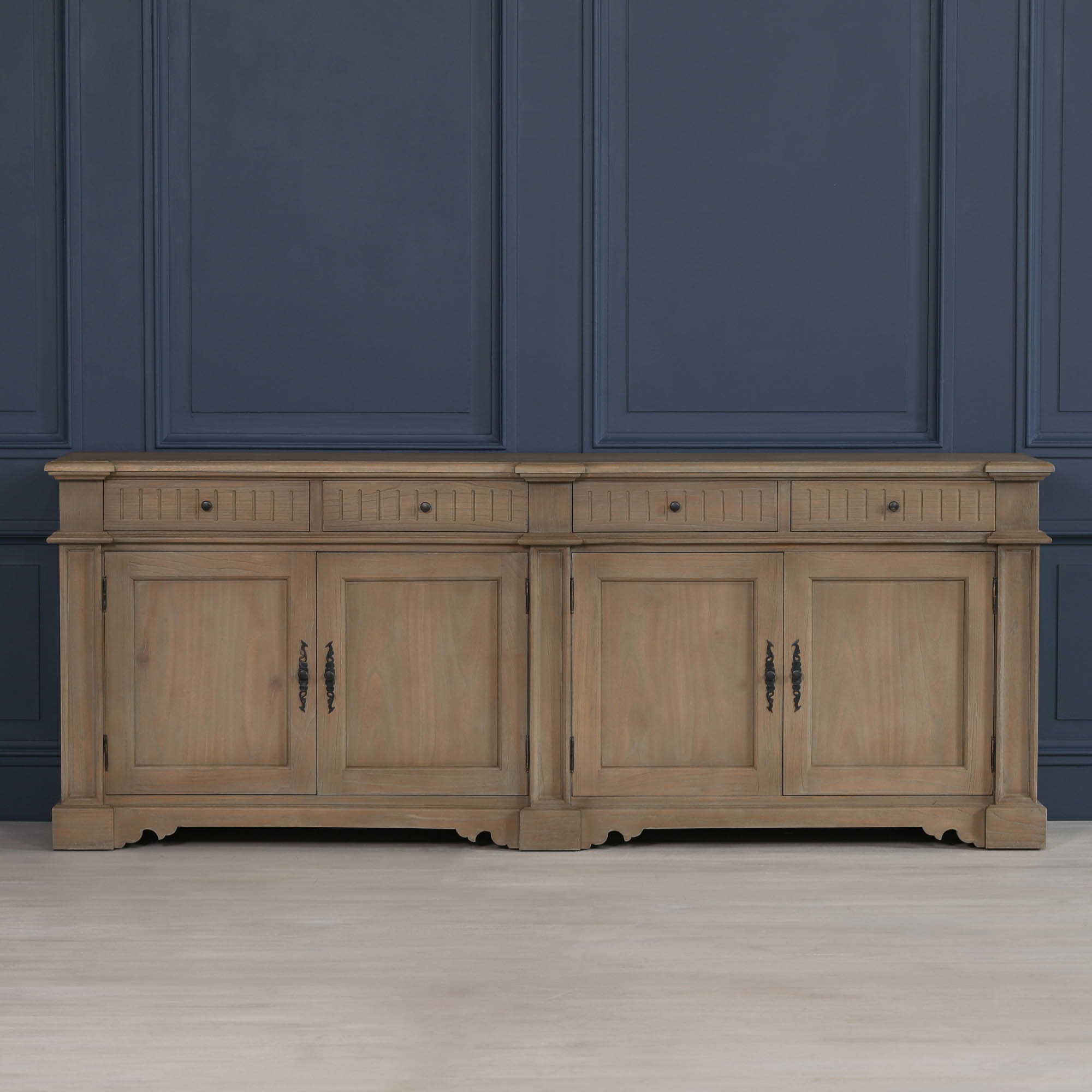 Classical 232cm sideboard handcrafted from white cedar wood in a rustic finish with intricately designed handles and drawers.