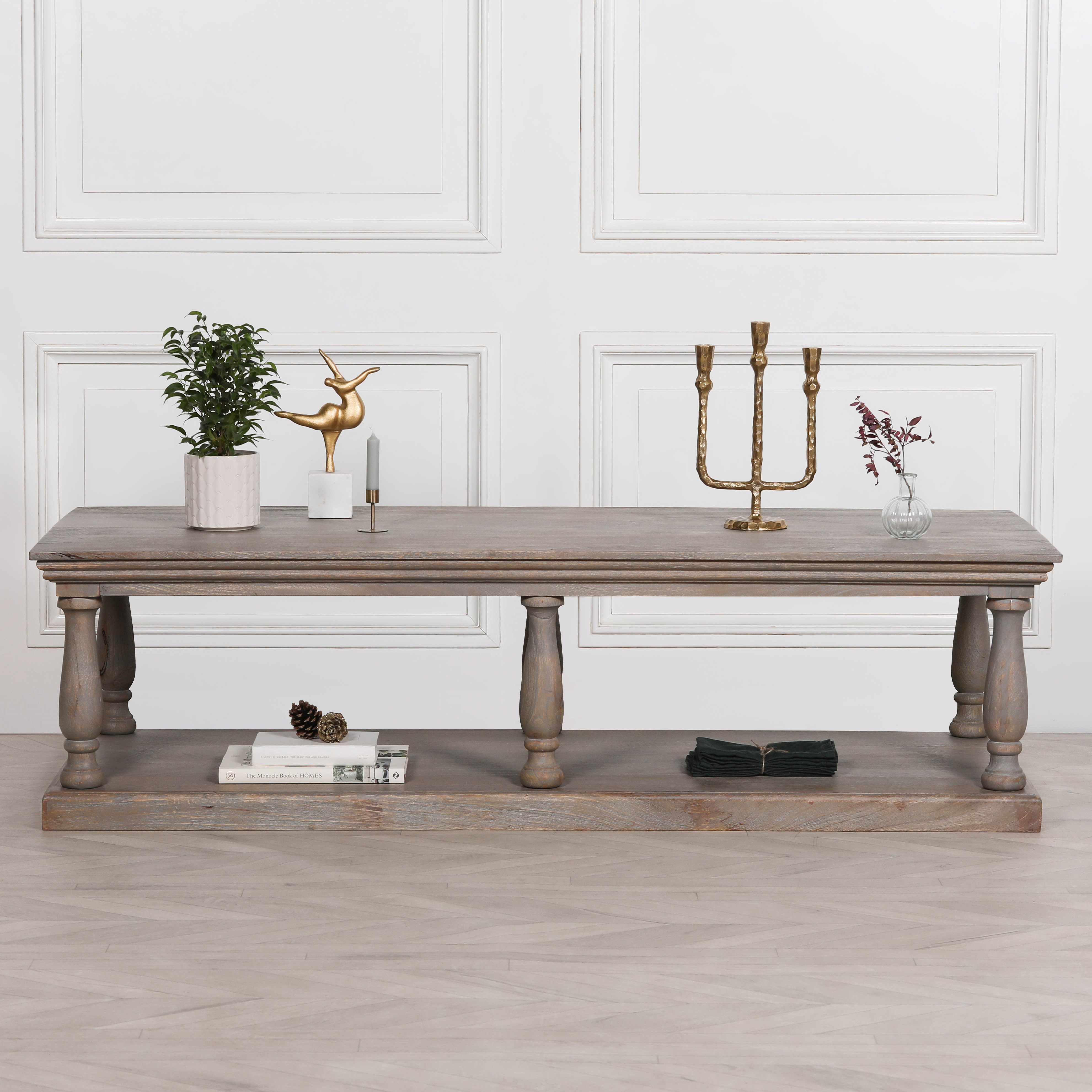 Handcrafted mango wood coffee table with a natural rustic finish and six carved column legs.