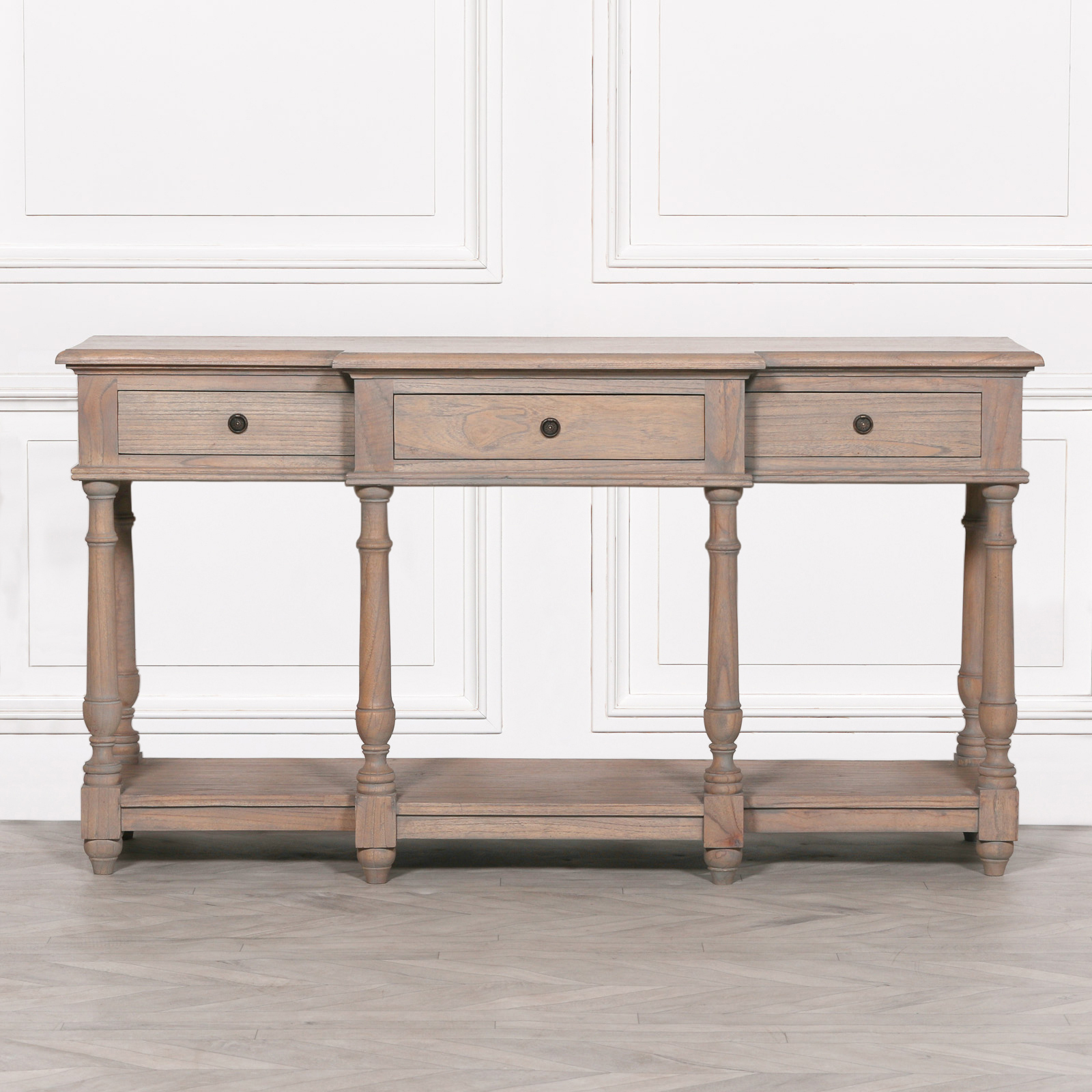 White cedar wooden console featuring a breakfront design in a rustic finish with six columned legs and three drawers.