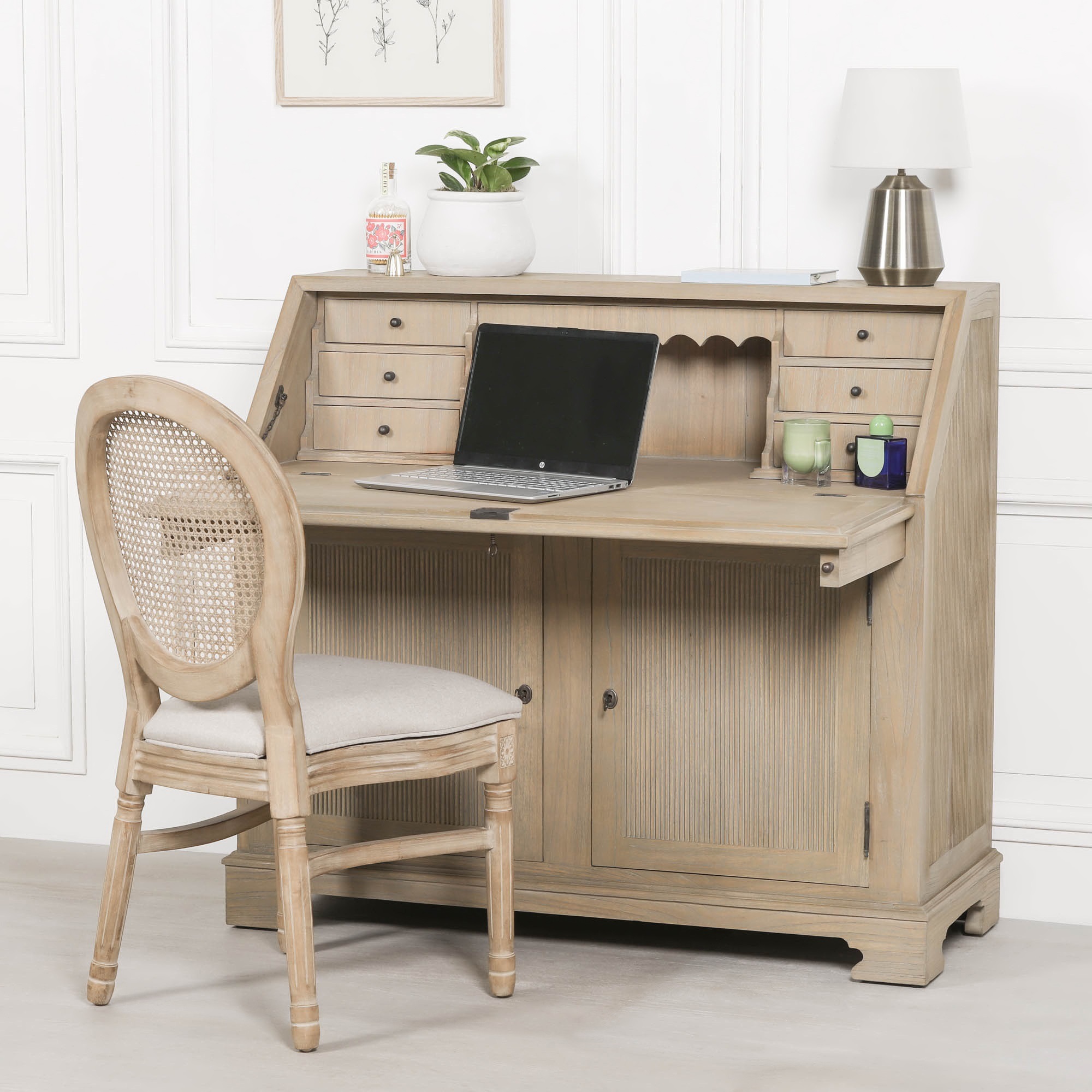 Wooden bureau desk handcrafted from white cedar in a rustic finish. Ideal for home working. Features 7 drawers, 2 lower storage cupboards with shelves and lockable compartments. Styled with a Wooden Louis Upholstered Chair.
